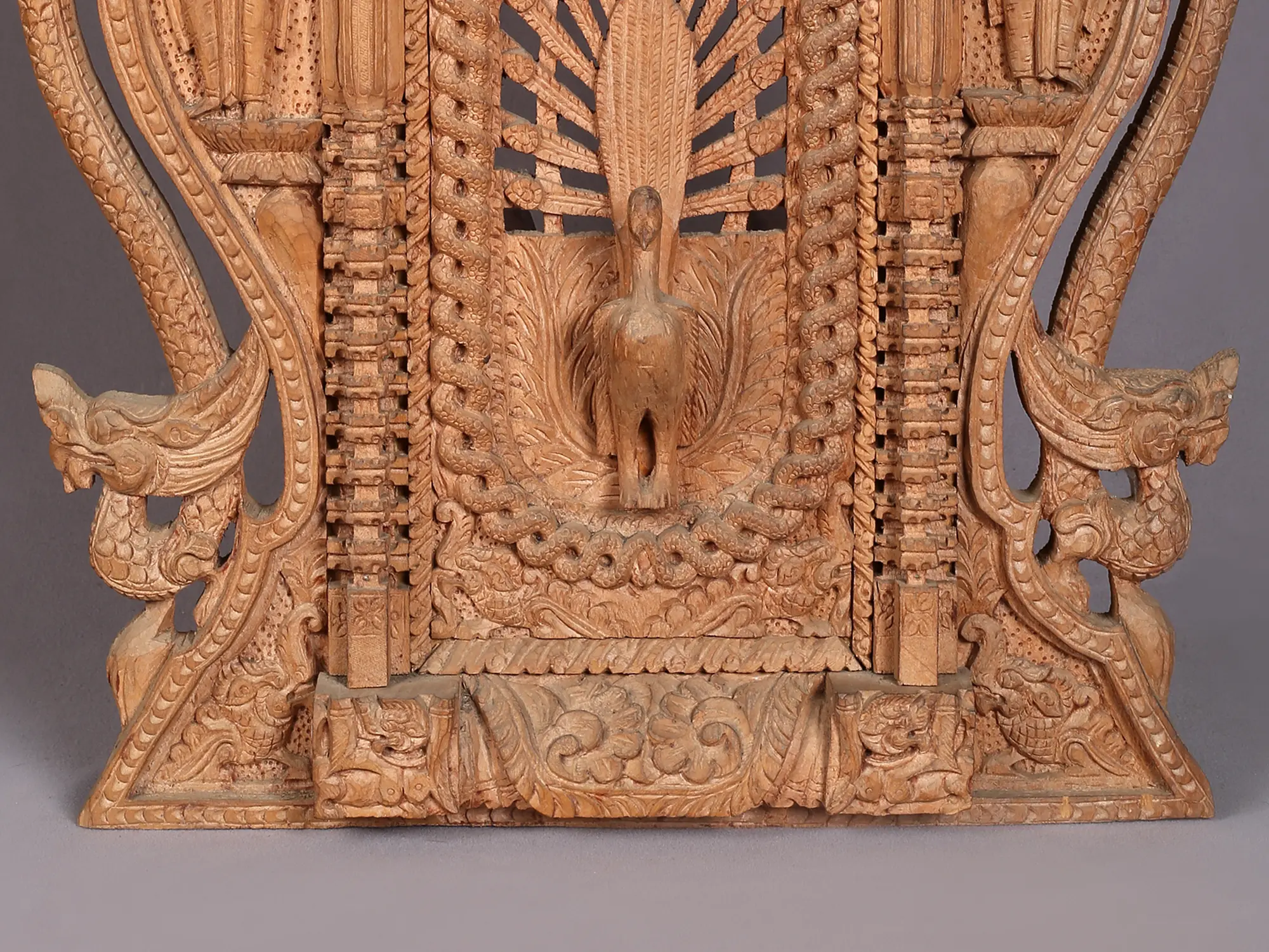 At the heart of this magnificent carving, a majestic peacock unfurls its elaborate tail, a motif deeply ingrained in Indian and Nepalese symbolism. The peacock is often associated with royalty, beauty, and the unfolding of divine grace. Its radiant display in the carving evokes a sense of wonder and visual splendor. Winding around the architectural elements are intricately carved serpents. In many Eastern traditions, serpents, particularly the Naga, are guardians of hidden treasures, conduits of cosmic energy, and symbols of protection and spiritual awakening. Their presence adds a layer of protective power and mystical depth to the piece, symbolizing the cyclical nature of life and the enduring power of the divine. The entire composition is framed by elaborate architectural details, reminiscent of ancient temples and sacred doorways, further enhancing its spiritual significance.