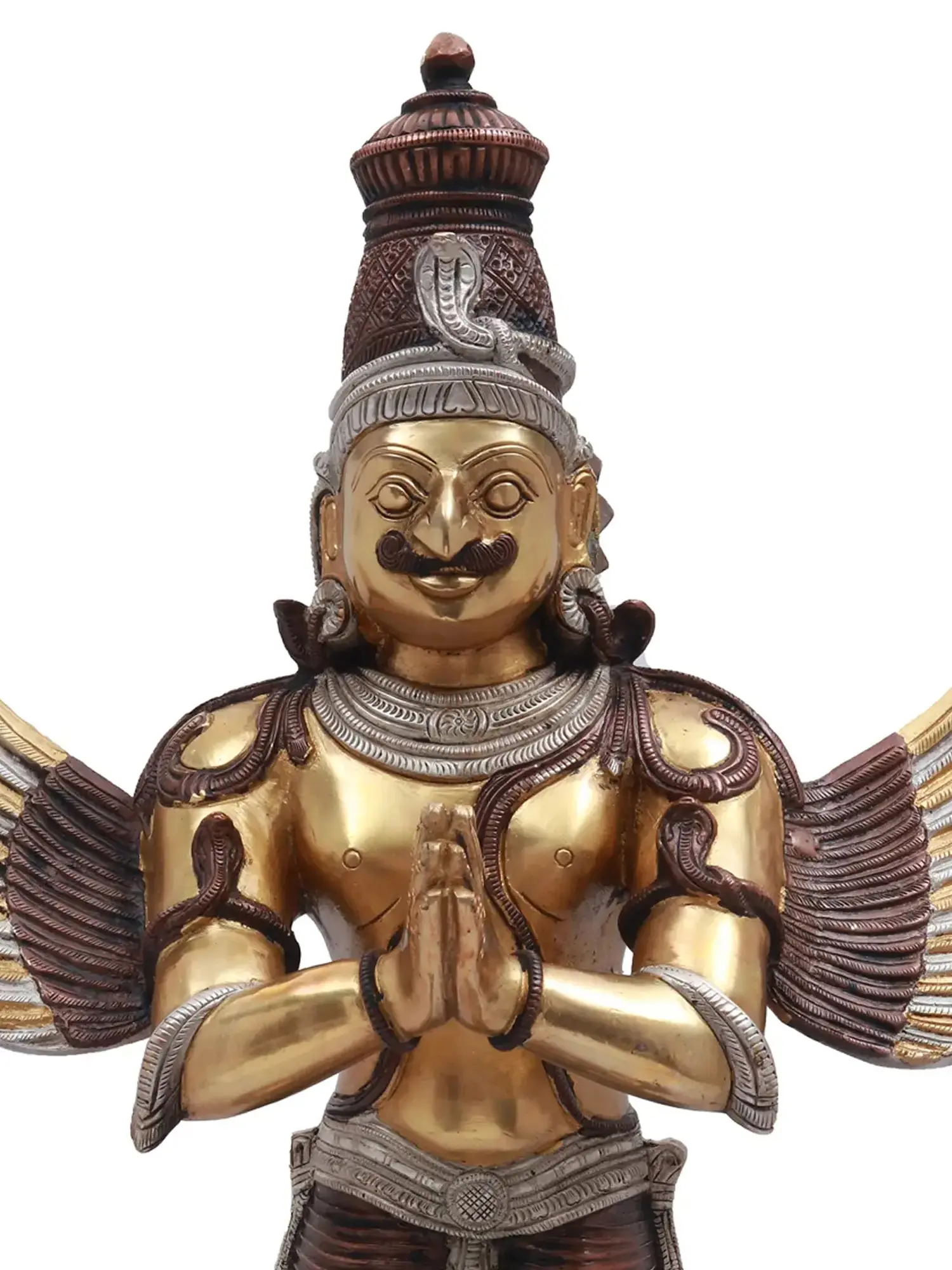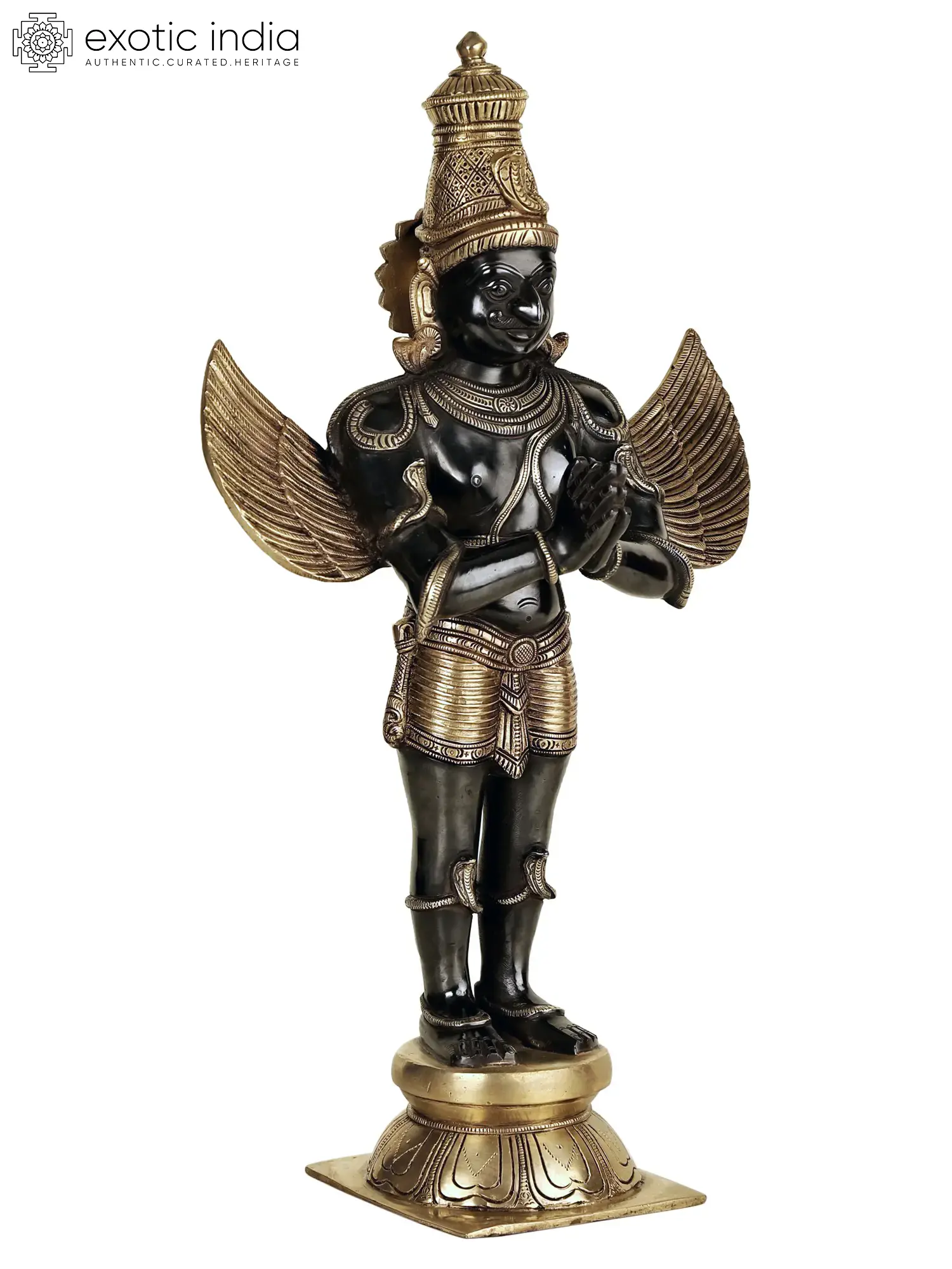 The holy bird mount of Sri Vishnu, Pakshiraja (king of birds) Garuda, stands with his hands folded in a devotional gesture, filling this brass statue with his celestial splendor.
