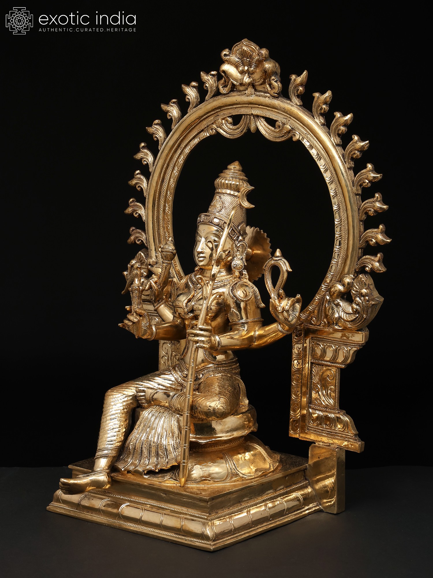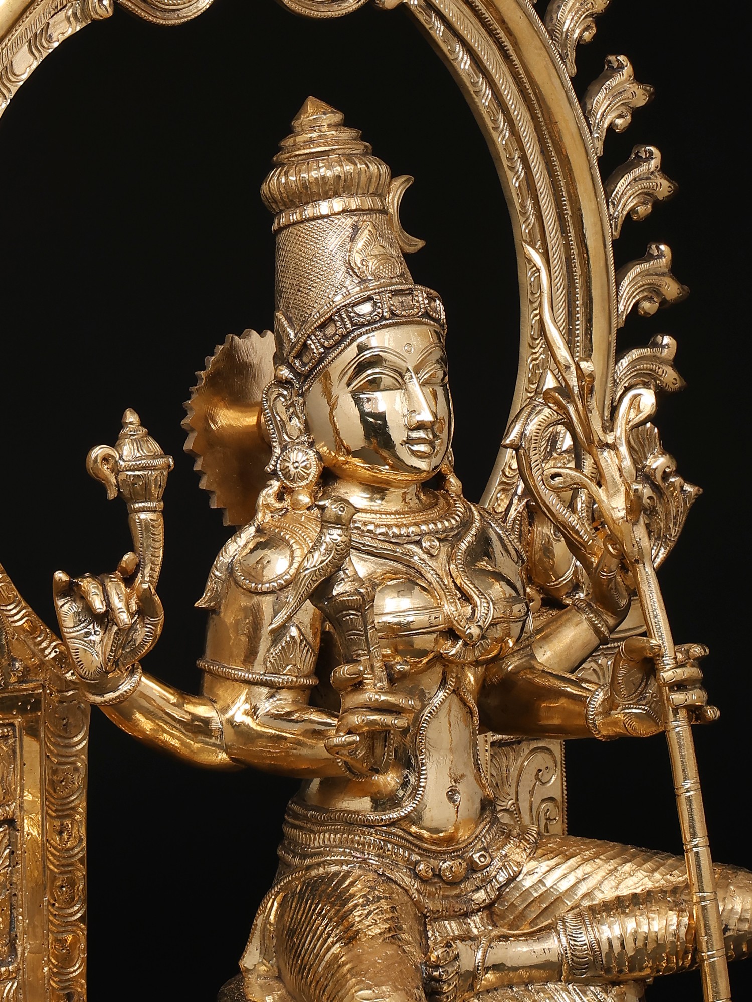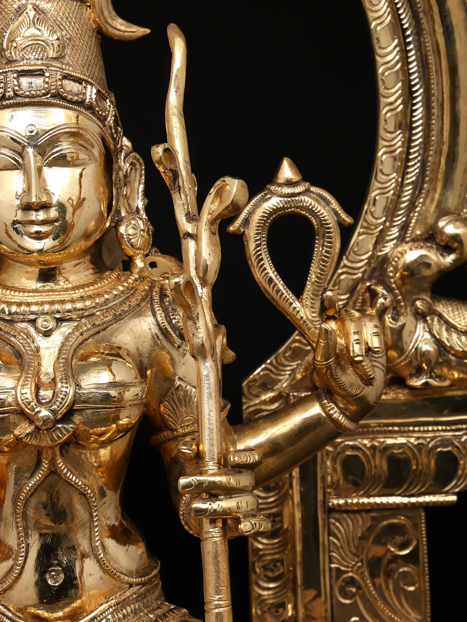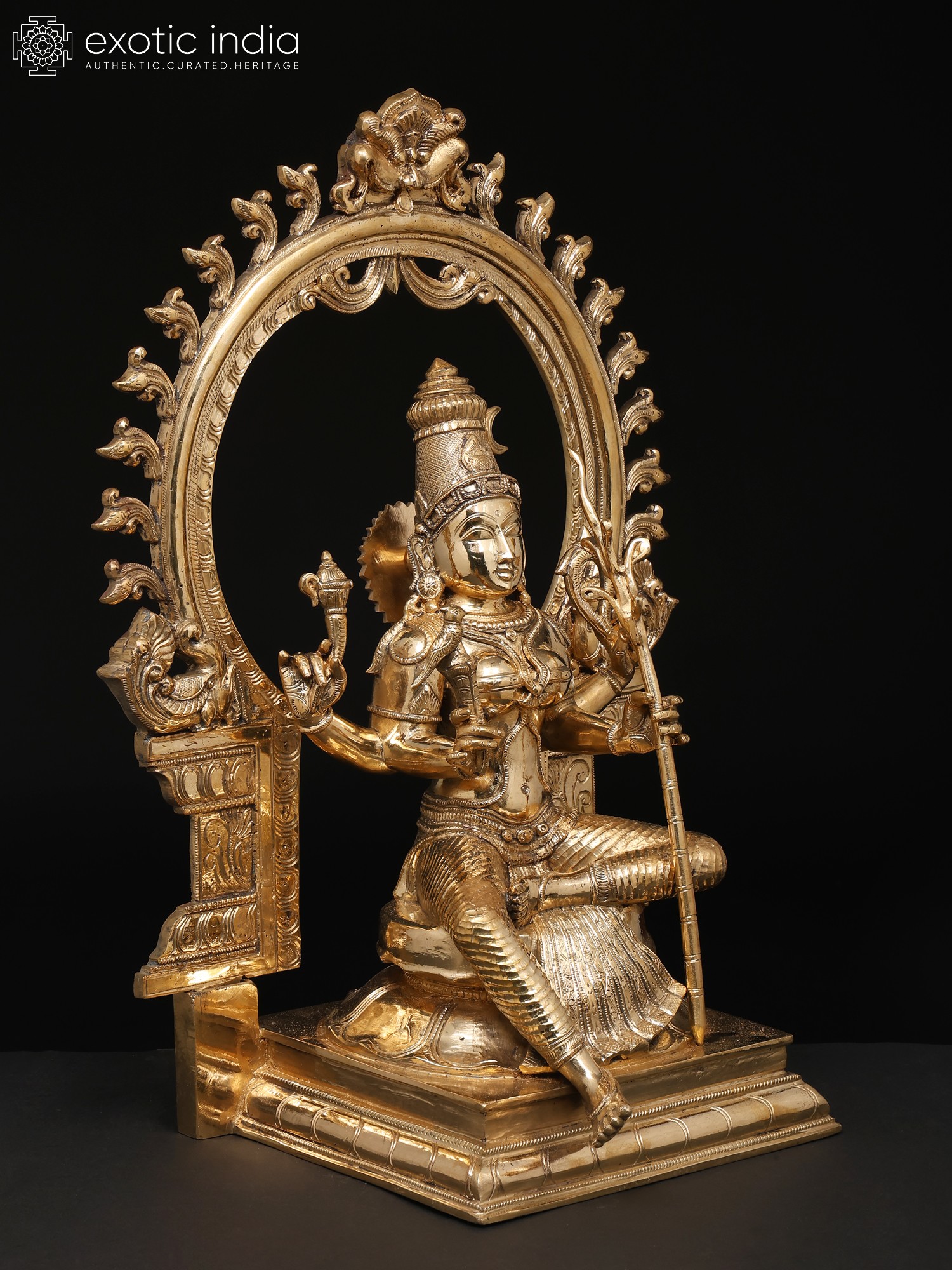 This exquisite statue is the product of the skilled artisans of Swamimalai, a town renowned for its centuries-old tradition of bronze casting. Passed down through generations, these artisans employ the Madhuchista Vidhana, or lost-wax technique, a process demanding precision, patience, and a deep understanding of both metallurgy and spiritual iconography. Each statue is a unique masterpiece, born from the molten heart of the five metals and shaped by the hands of masters who have dedicated their lives to the art of divine representation. Measuring an impressive 21.0 x 15.0 x 11.0 inches, this statue commands attention and reverence. It is more than just a decorative object; it is a conduit to the divine, an embodiment of timeless wisdom and boundless grace, a legacy of artistic excellence from Swamimalai, the land of sacred bronze.