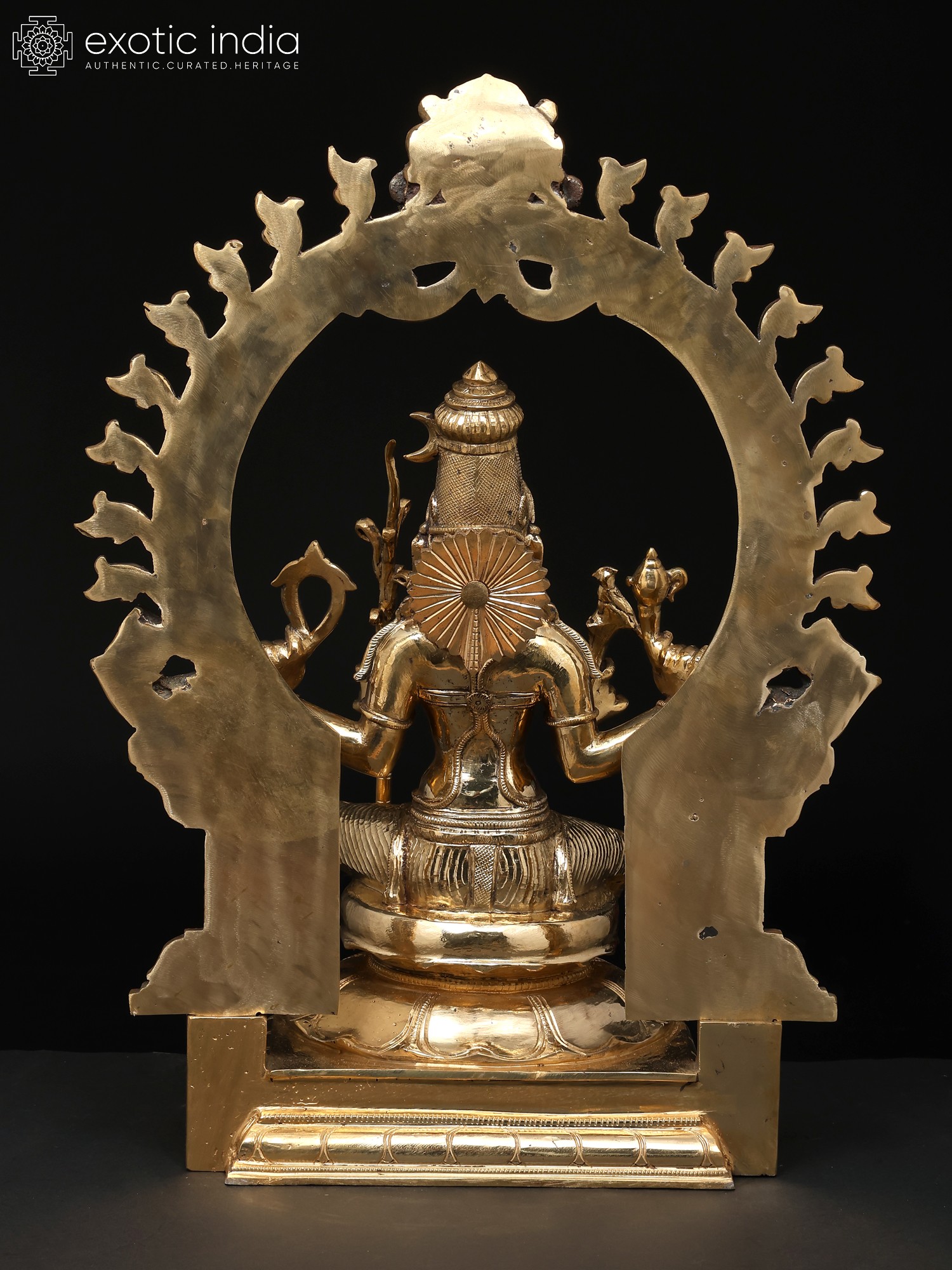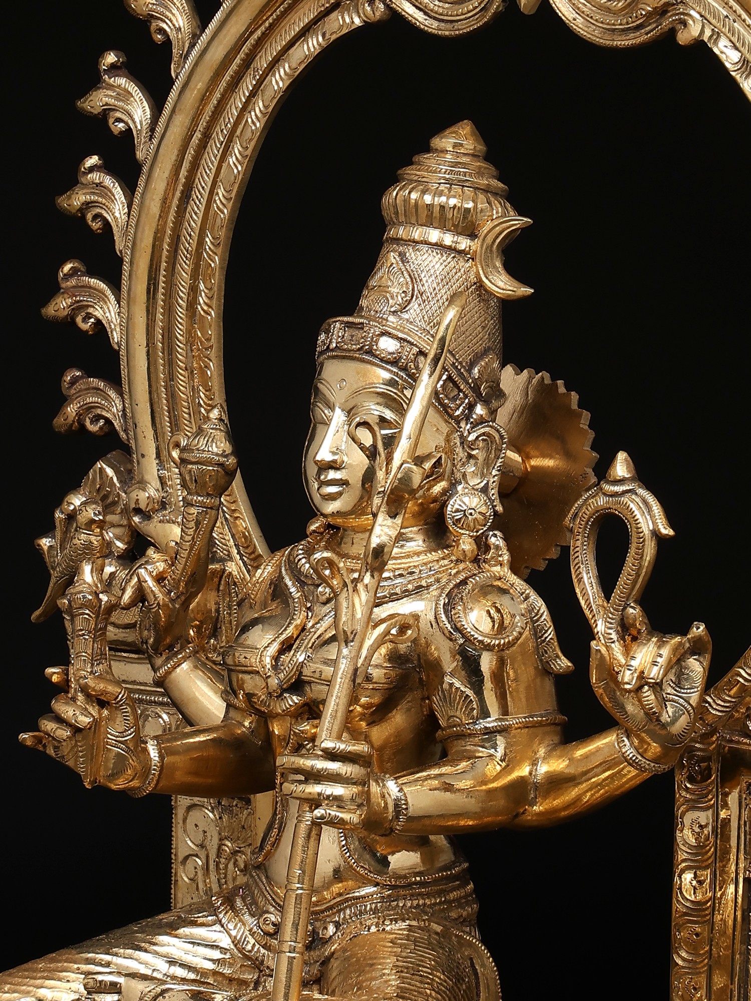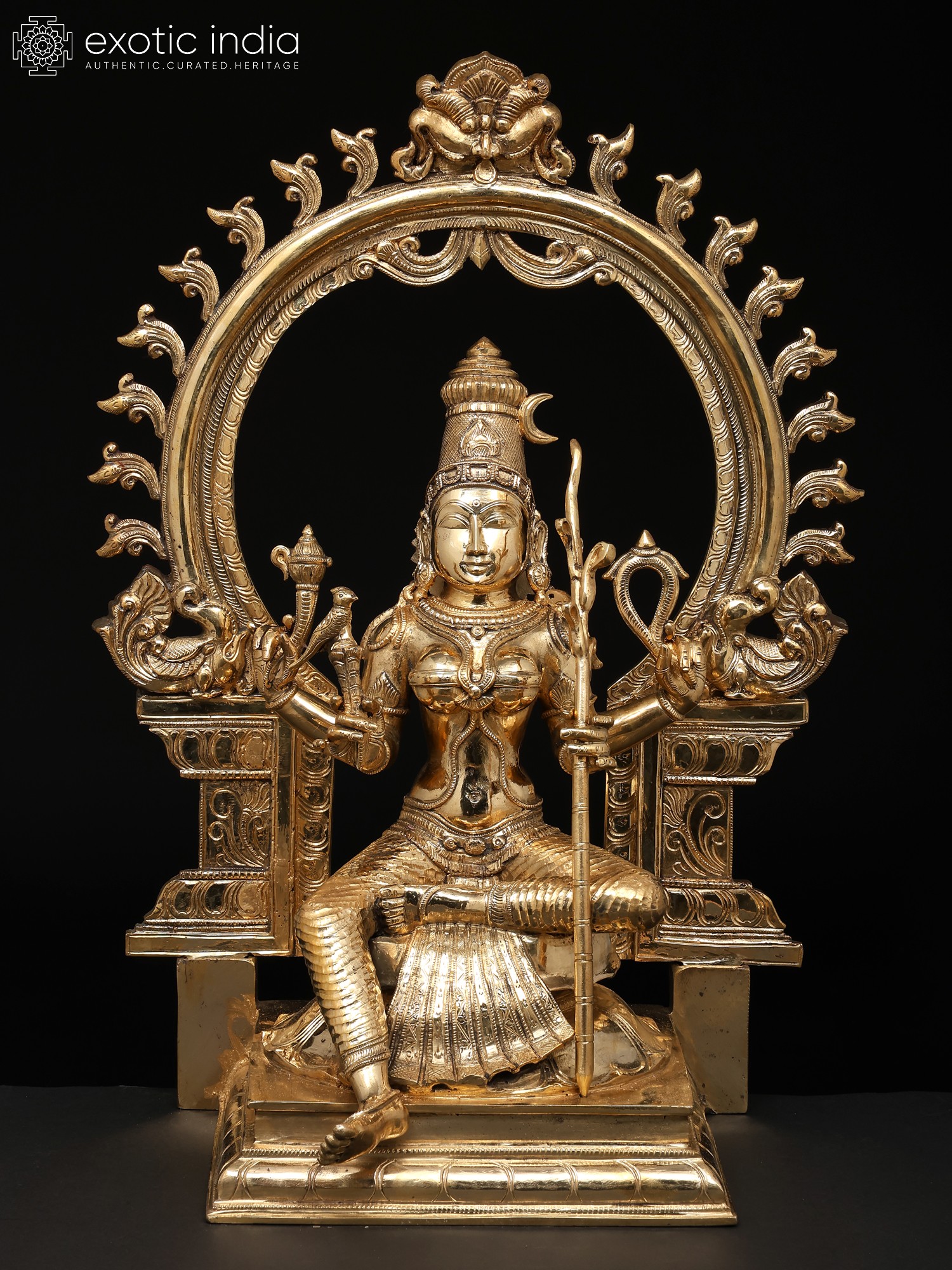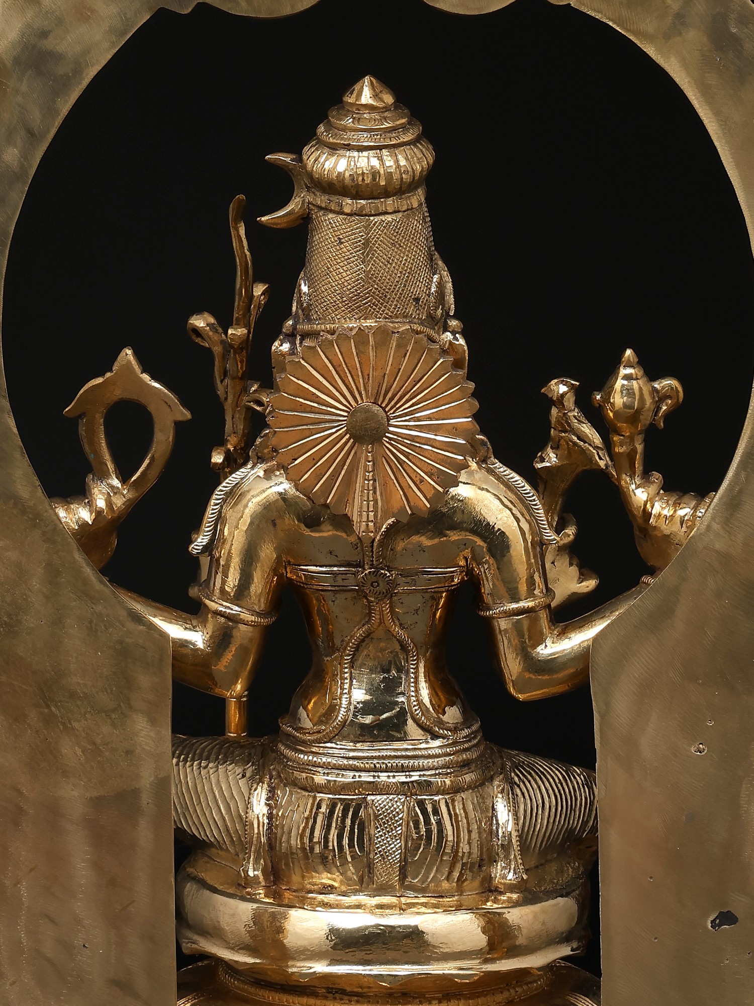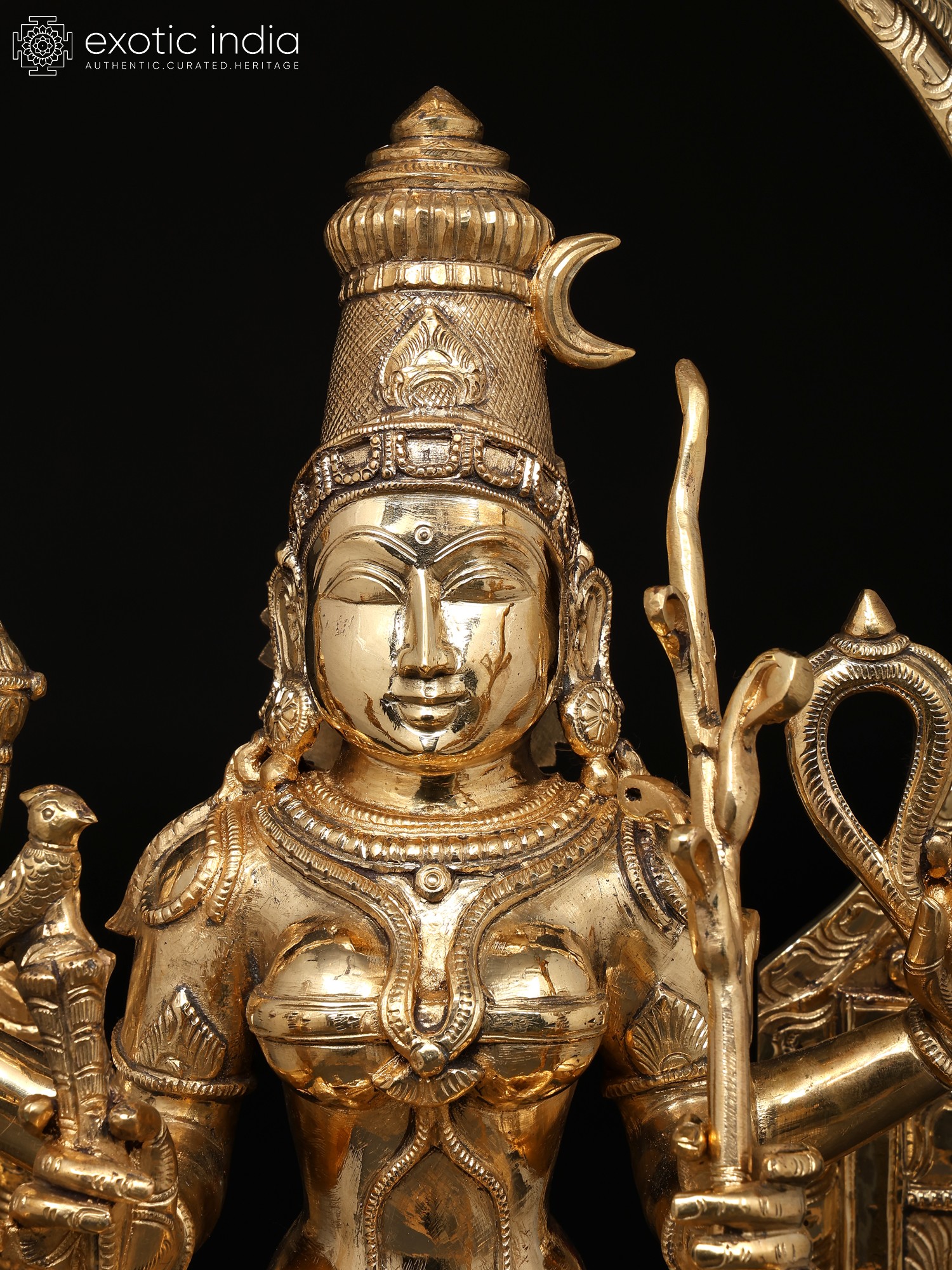 This exquisite statue is the product of the skilled artisans of Swamimalai, a town renowned for its centuries-old tradition of bronze casting. Passed down through generations, these artisans employ the Madhuchista Vidhana, or lost-wax technique, a process demanding precision, patience, and a deep understanding of both metallurgy and spiritual iconography. Each statue is a unique masterpiece, born from the molten heart of the five metals and shaped by the hands of masters who have dedicated their lives to the art of divine representation. Measuring an impressive 21.0 x 15.0 x 11.0 inches, this statue commands attention and reverence. It is more than just a decorative object; it is a conduit to the divine, an embodiment of timeless wisdom and boundless grace, a legacy of artistic excellence from Swamimalai, the land of sacred bronze.