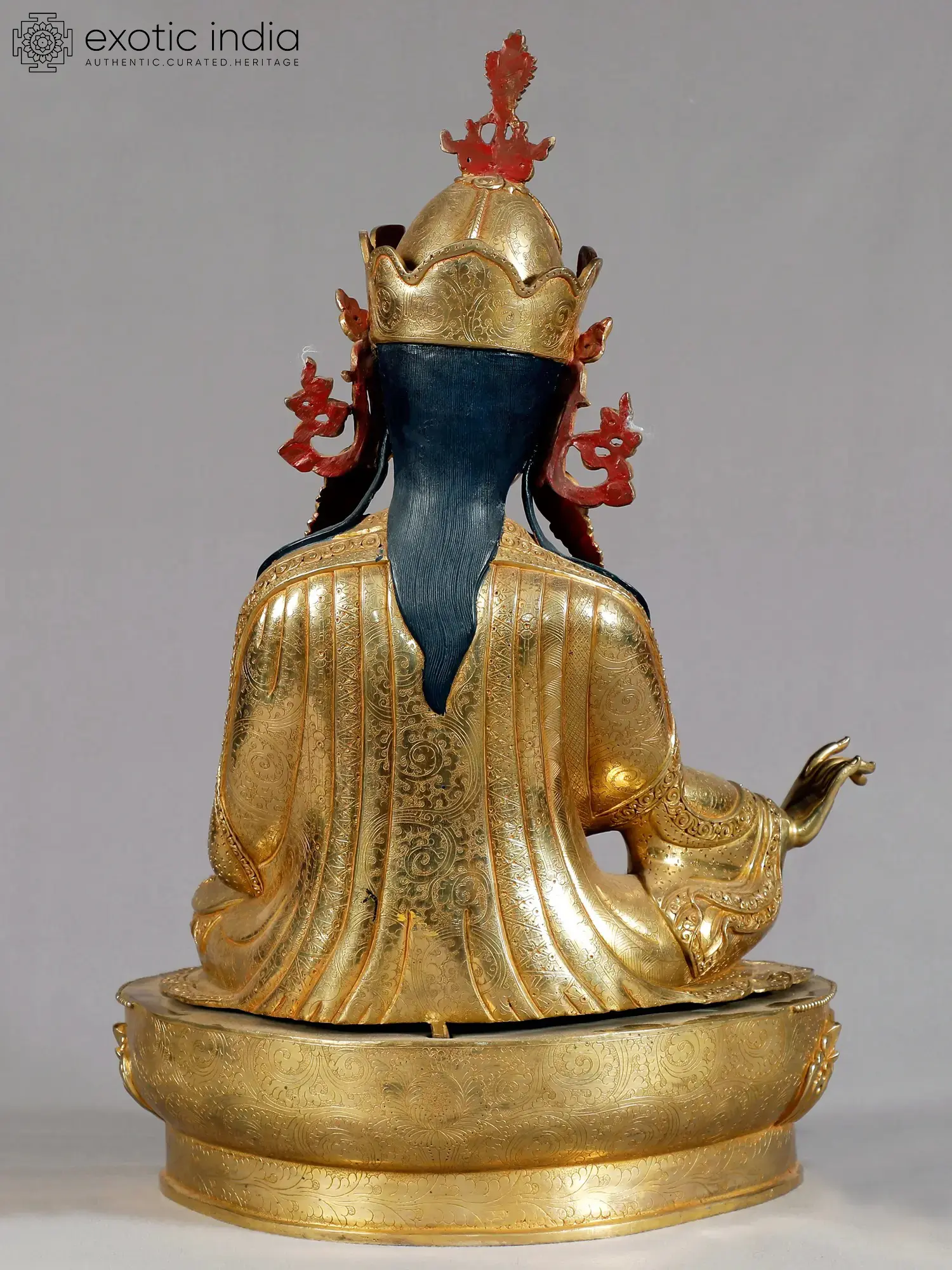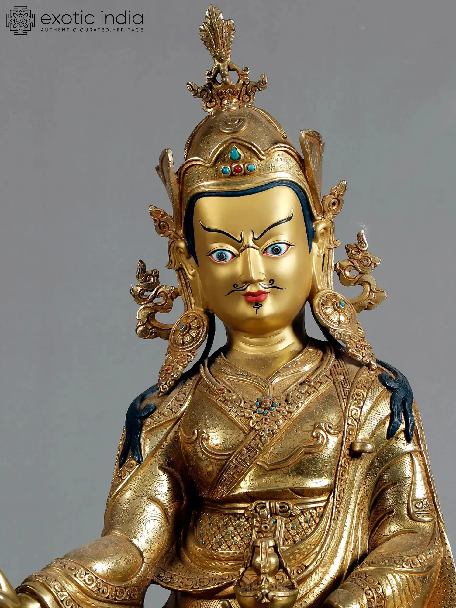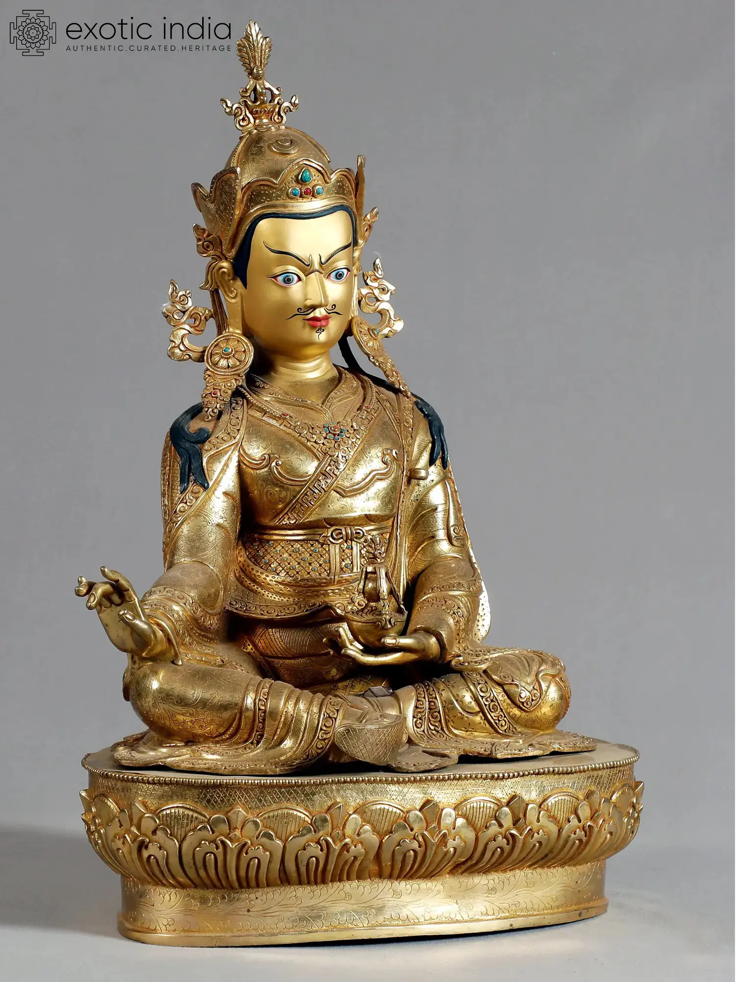 A piece-de-resistance from the rich tradition of Nepalese statues, this gilded copper Guru Padmasambhava is replete with mind-blowing detailing and finesse par excellence. The animated frowning eyes, drooping earlobes under the weight of heavy earrings, the many folds of the heavy robe, and the perfect fleshiness of the palm- all attributes of the statue hold a realistic quality, which makes viewing this icon into an aesthetic experience. The master carries a pot of ambrosia in his palm placed in a meditative gesture, while his other hand is in the mudra of fearlessness.