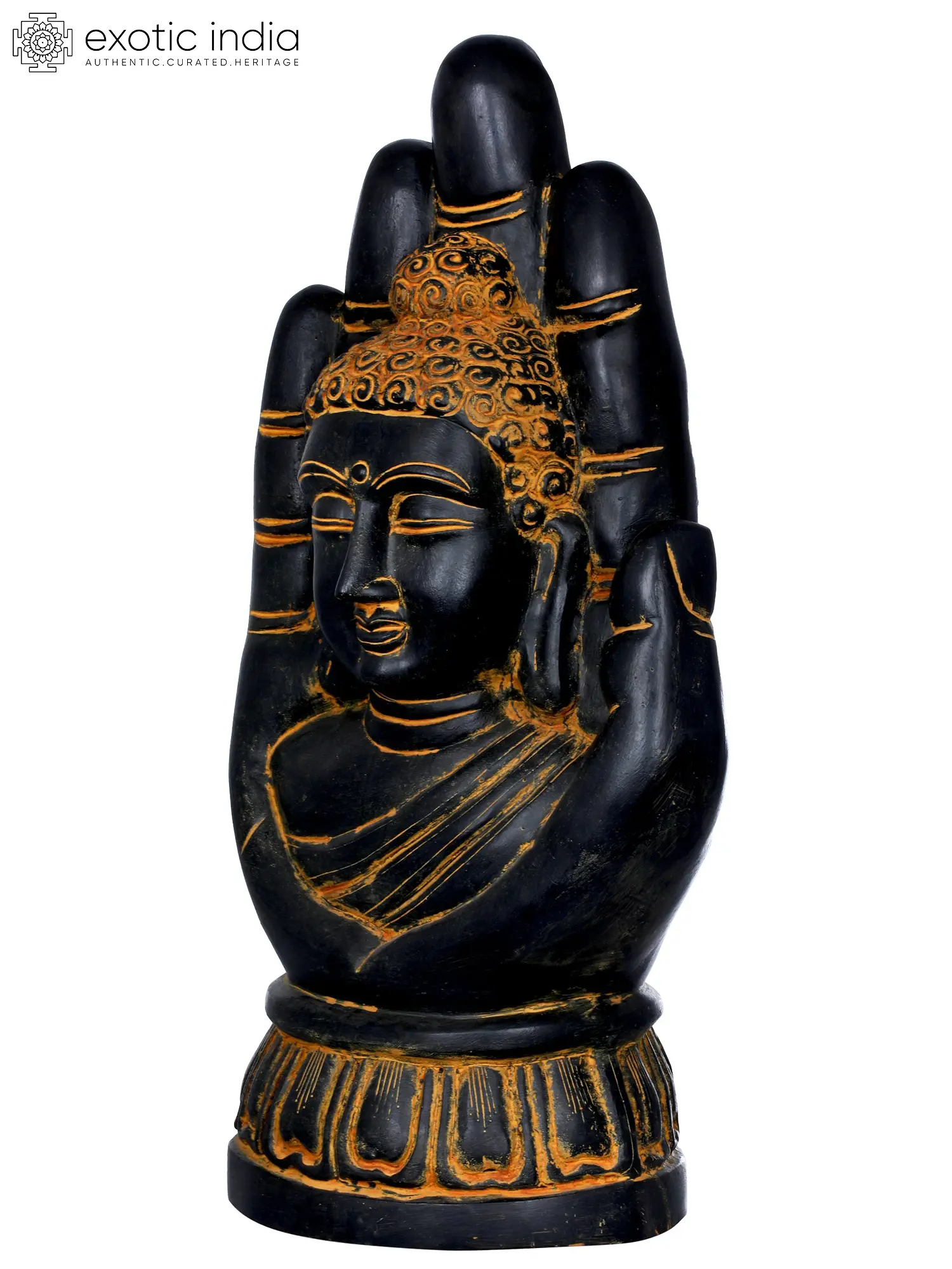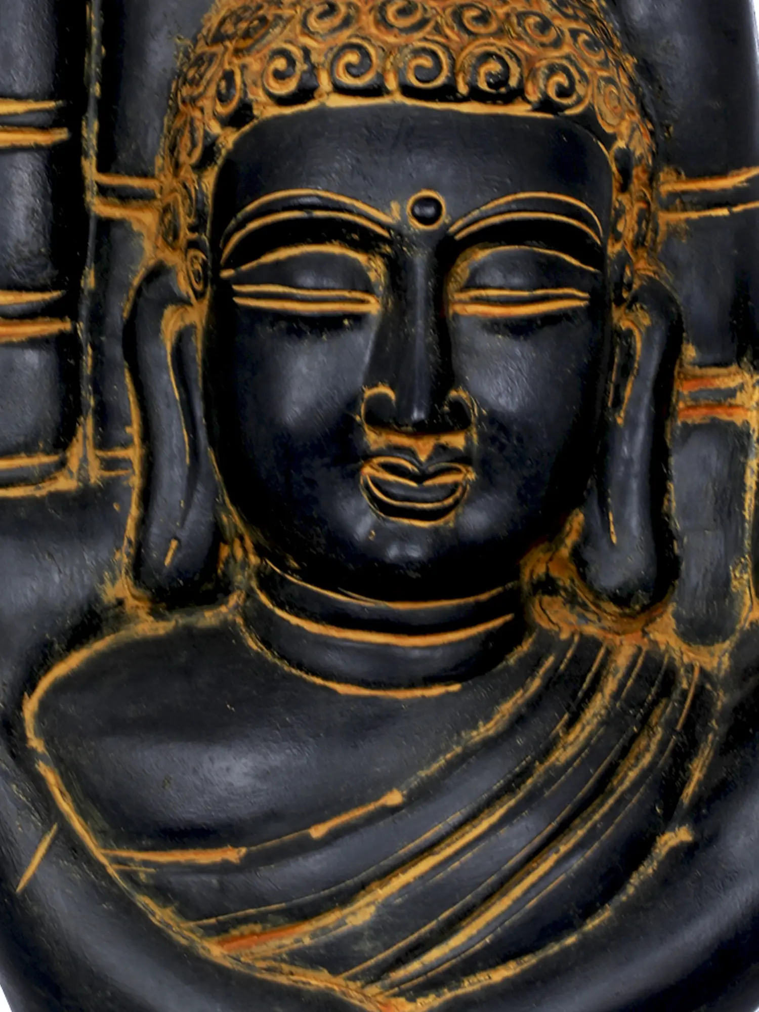 This flamboyant magnified statue of Buddha in black shade with refined golden borders is heavenly and can make a person go spellbind. Curled golden hairs at the top represent his divine crown. The deep yellow gold briefings highlight its uniqueness and tenuity.