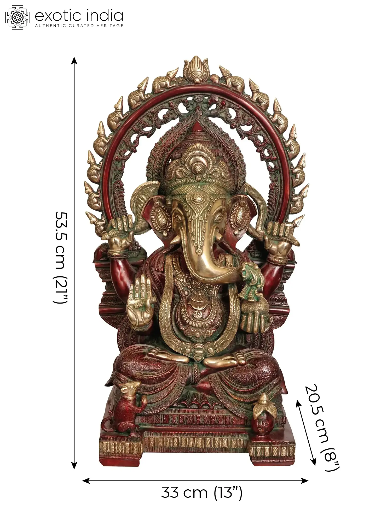 The Large-Sized Enthroned Ganesha Statue in Brass is a regal masterpiece. Lord Ganesha, in his Chaturbhuj form, sits beneath an aureole of Mushaks, signifying auspicious beginnings and overcoming obstacles. Crafted with the finest red and gold lacquer finish, this statue exudes opulence. Ganesha's blessings are embodied through his noose, elephant goad, broken tusk, and Modak, making it a majestic addition to any sacred space or decor, invoking divine presence and success.