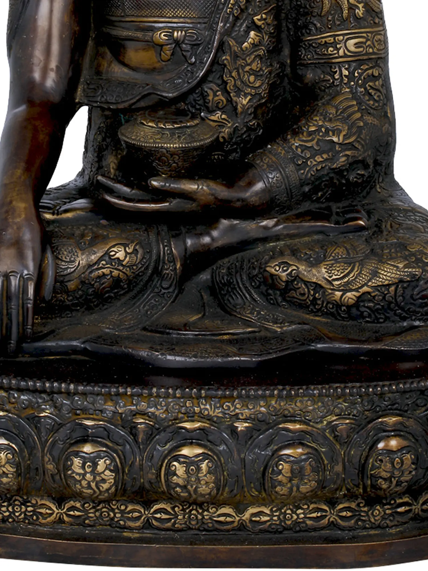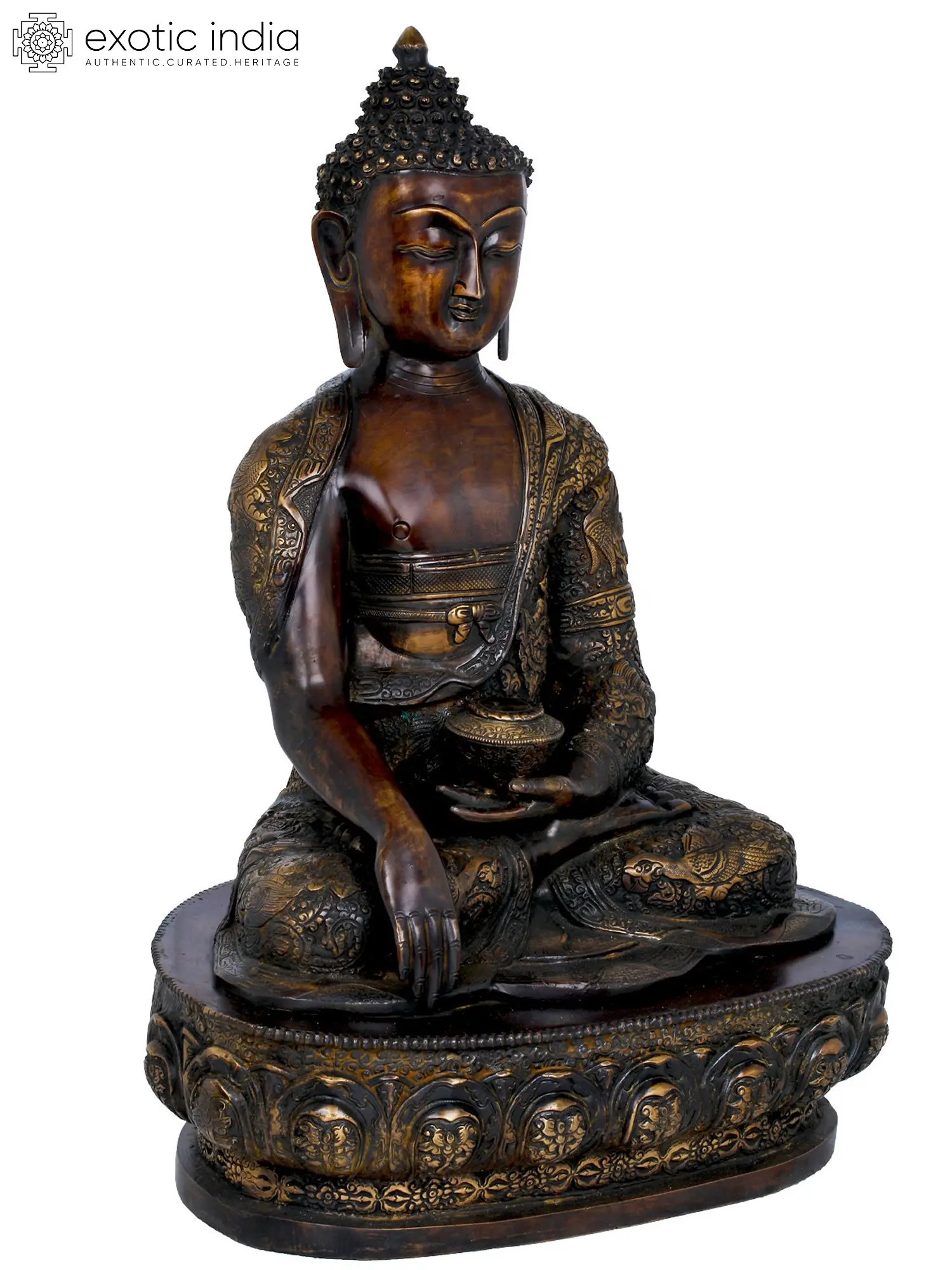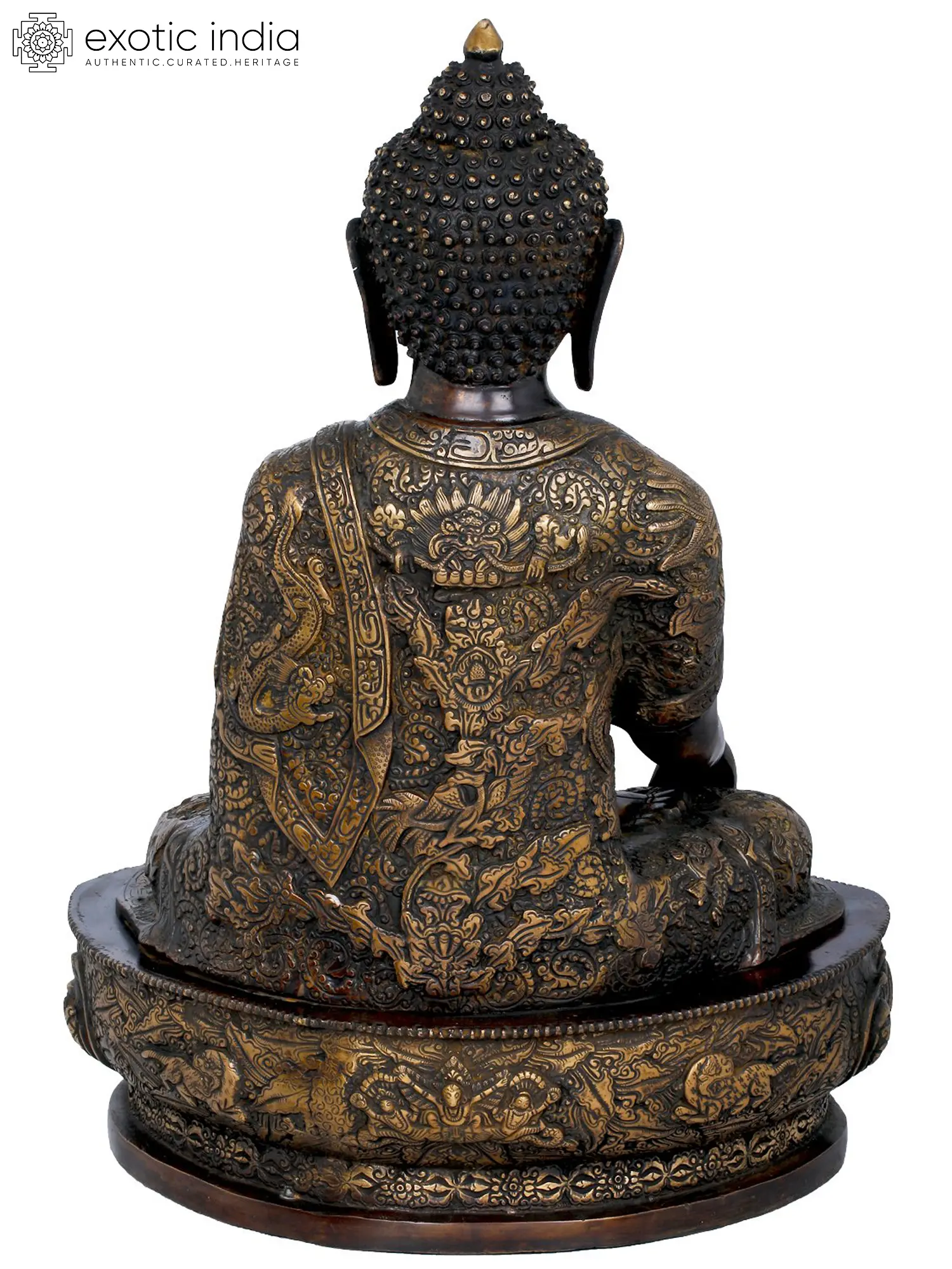 21" Lord Buddha Seated On Lotus Seat Wearing an Extensively Carved Robe - Tibetan Buddhist In Brass | Handmade | Made In India