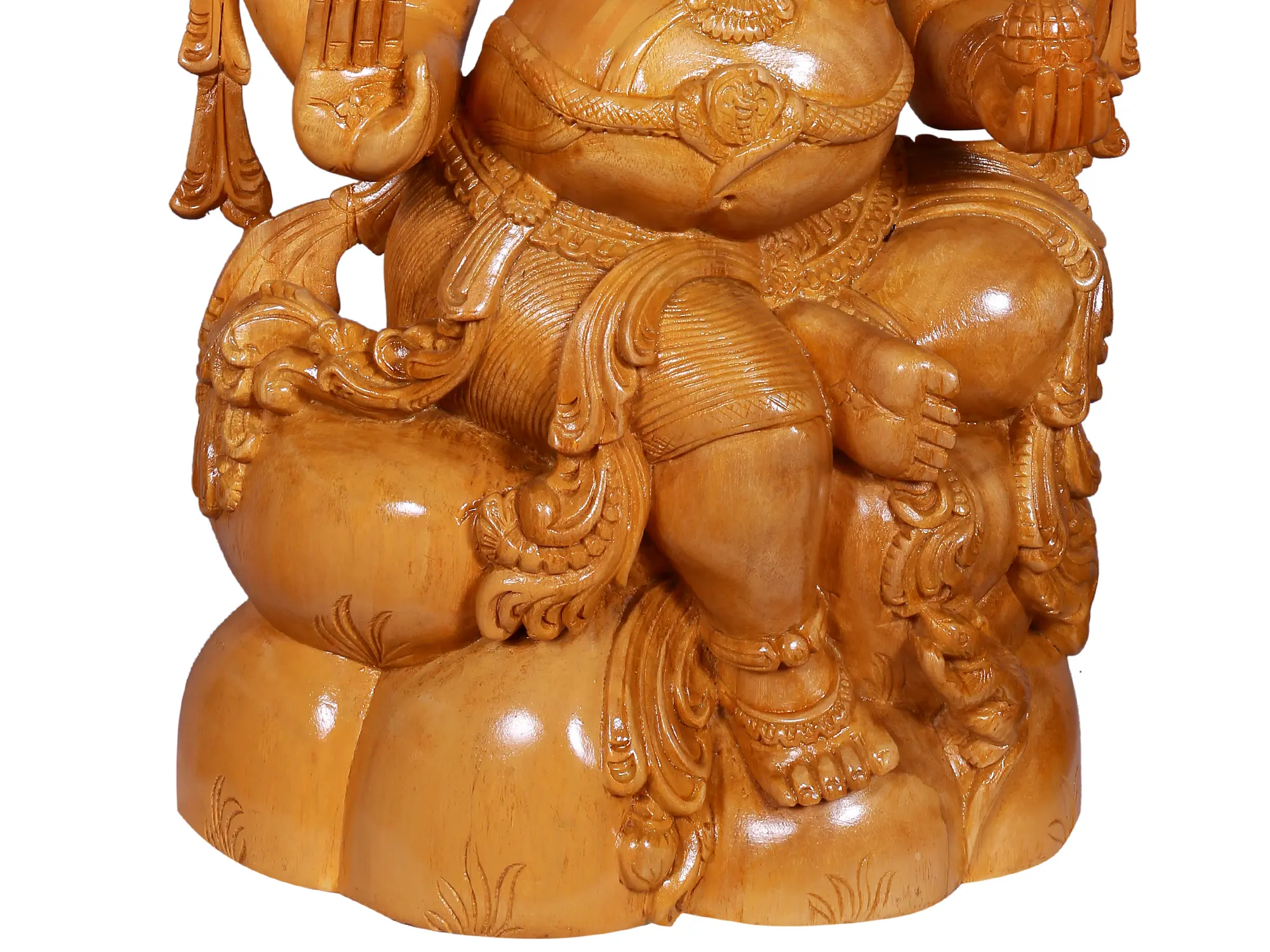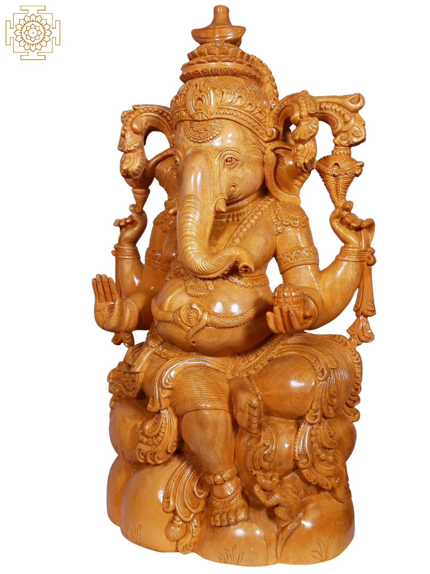 A seated whitewood Ganesha for the home or office space of the truly devoted. This chaturbhujadhari Ganapati seated in lalitasana would look great poised in a corner of your space. The high-shine ochre colour finish of the whitewood medium is such that it goes with a wide variety of interiors.