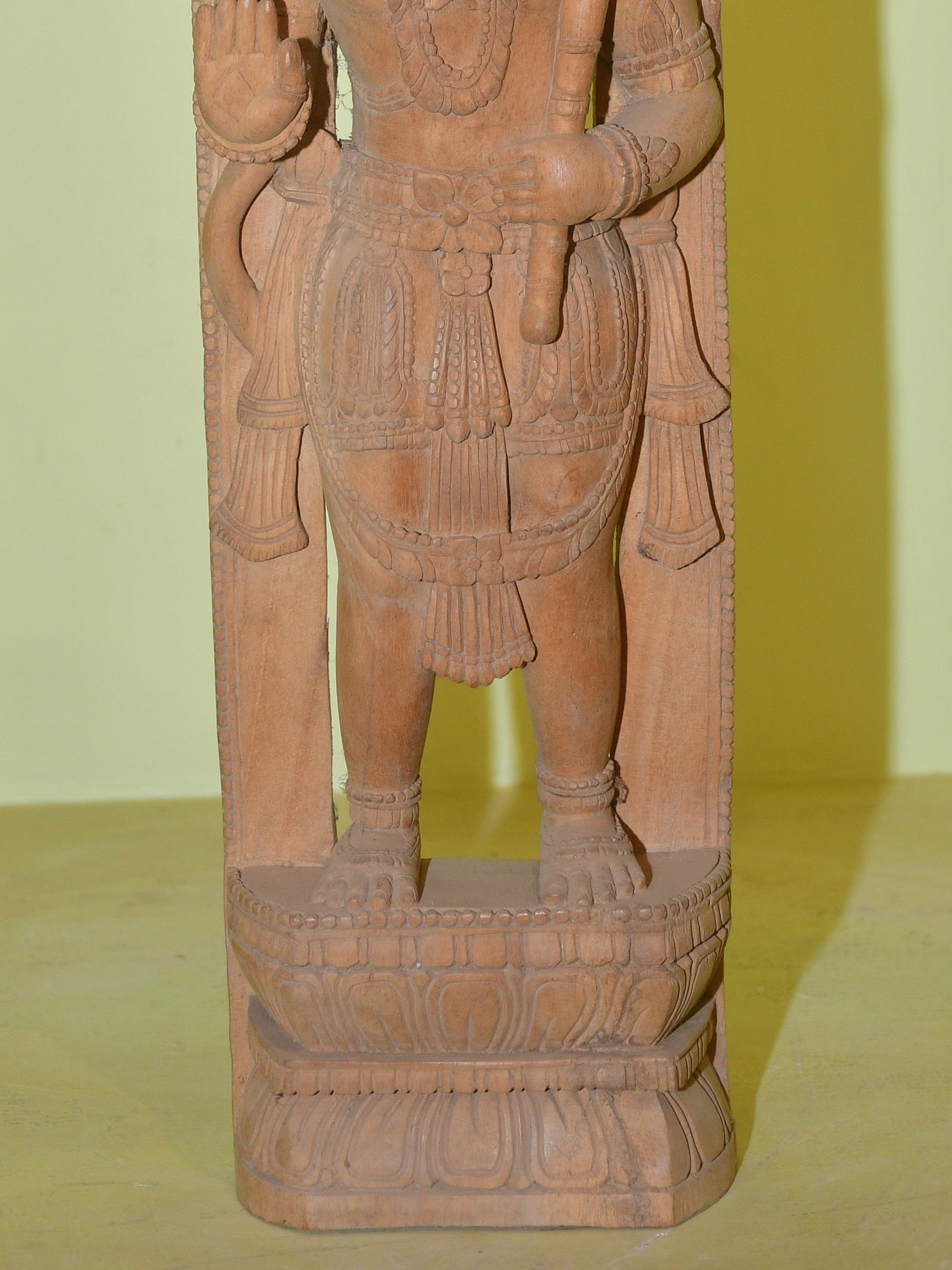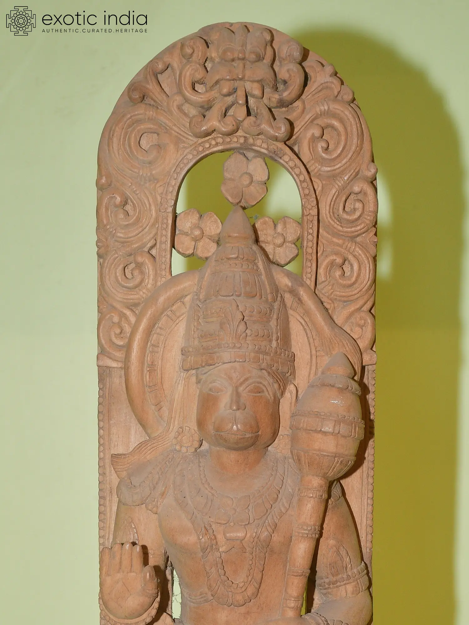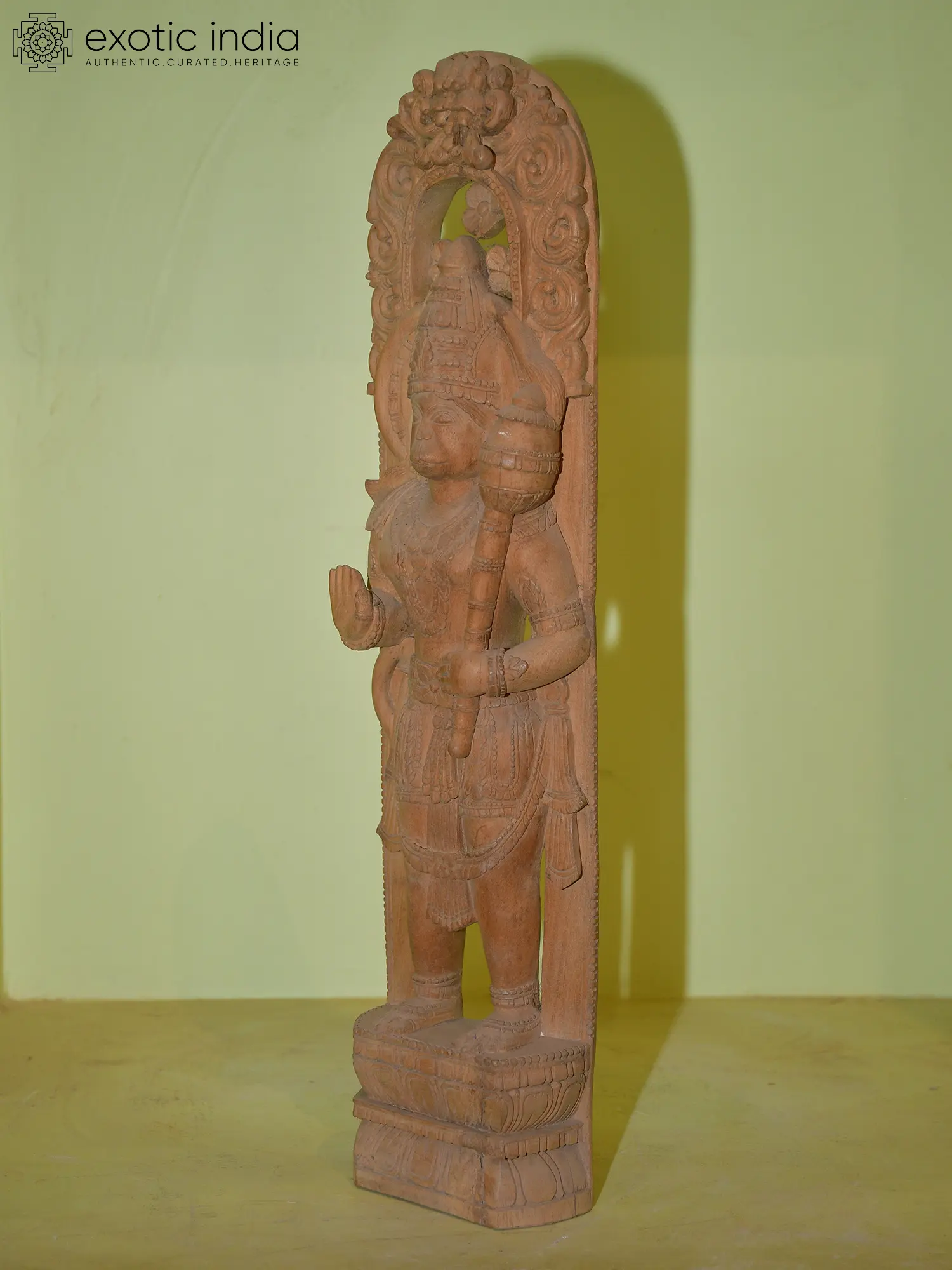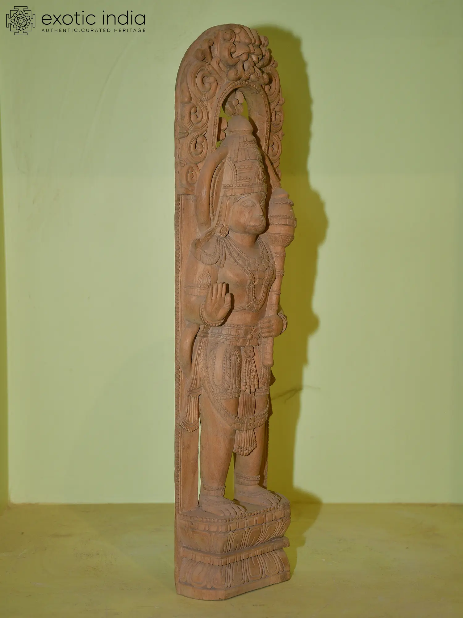 The stone used in this sculpture hails from the renowned quarries of Orissa, a region historically celebrated for its masterful stone carving. The artisans have meticulously chiseled the stone, bringing to life every feature with remarkable precision. From the divine aura emanating from his presence to the subtle details of his divine ornaments and attire, each element is rendered with an artist's eye and a devotee's heart. The serene yet resolute expression on Hanuman's face speaks volumes of his inner strength and unwavering faith. The pedestal on which he stands is intricately carved, further enhancing the grandeur of the deity. This piece is not merely a statue; it is a work of art that carries centuries of tradition and devotion within its form. ––––––––––