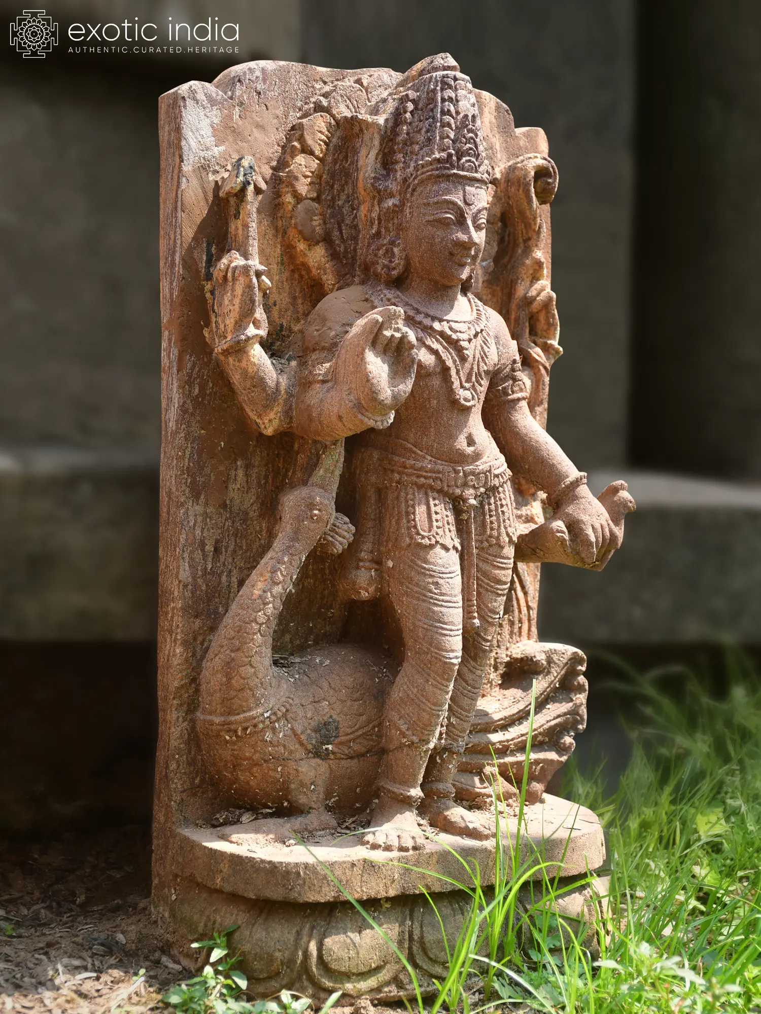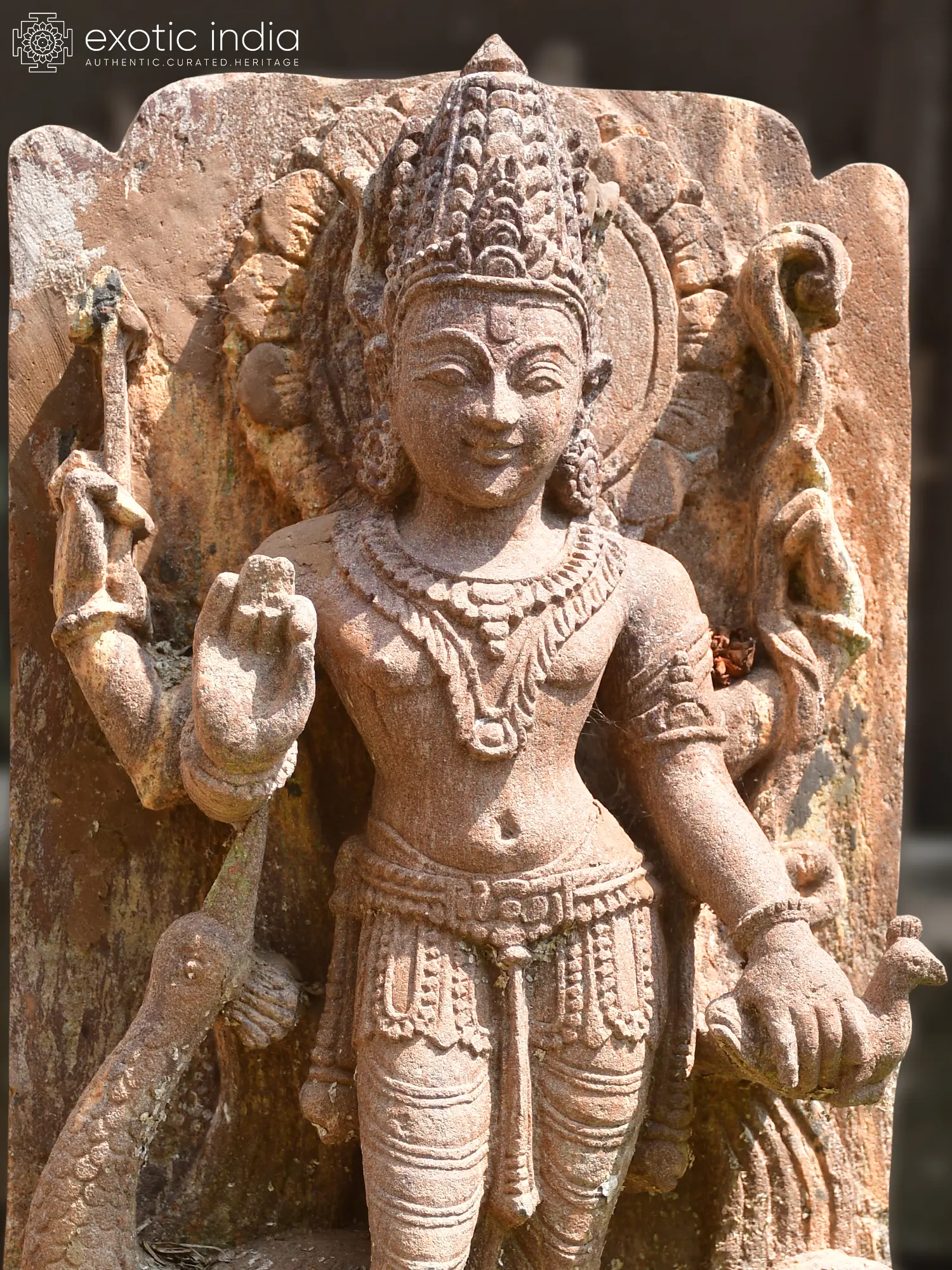 You'll appreciate the intricate detailing adorning the deity's attire, from the elaborate crown to the finely worked waistband and bracelets, all exquisitely rendered in stone. The figure stands gracefully, its posture conveying both majesty and gentle wisdom, complemented by the symbolic presence of a peacock, its vahana. The overall composition, measuring a substantial 21 inches in height, is designed to command attention and inspire contemplation, with a dignified presence that resonates powerfully.