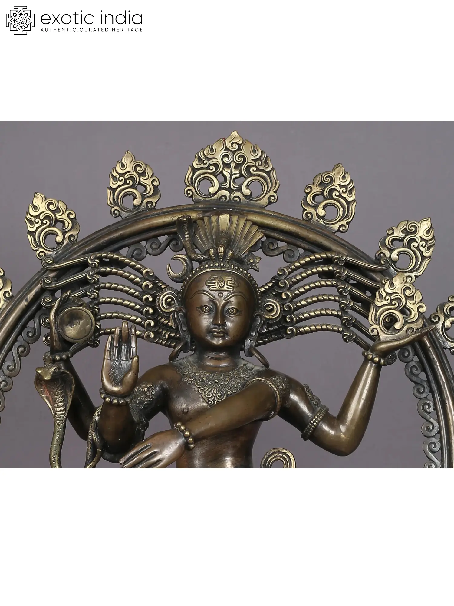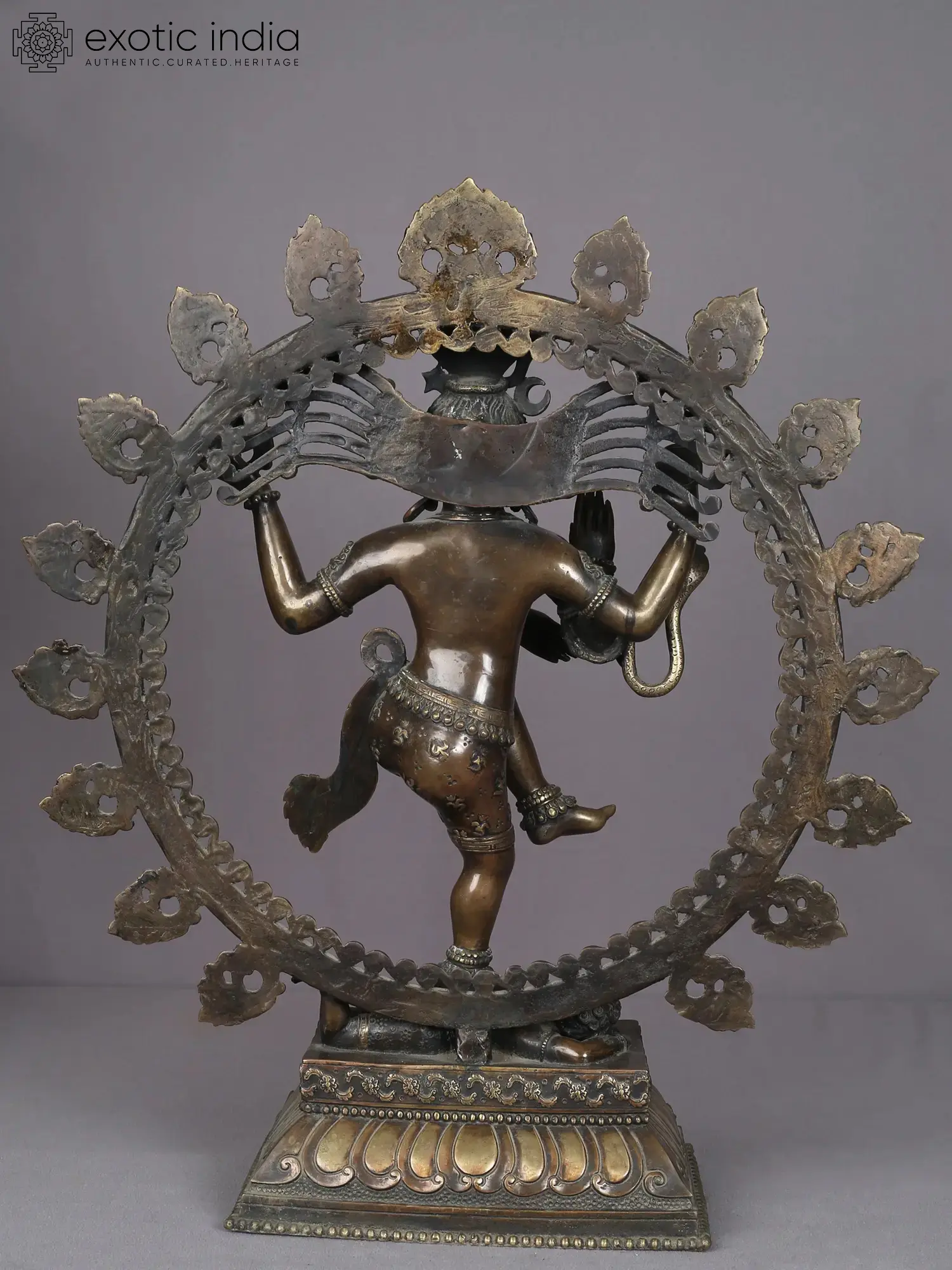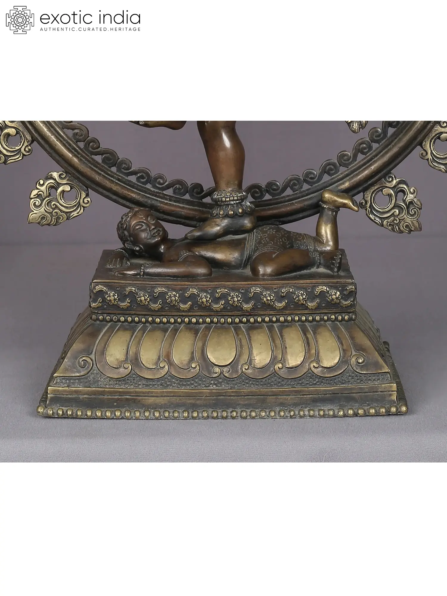 Though Nataraja is popularized the world over by Chola bronzes, this Nepalese Nataraja murti is a stunning vision of the dancing Shiva. The floral-patterned platform of Shiva is a lotus pedestal, on which an innocent-faced Shiva, with a youthful appearance, dances in his four-armed form. His eyes are active, his face round, his dhoti adorned with the “Om” symbol, his feet ornamented with anklets and Apasmara under his feet is relatively feeble- all attributes transformed to match the tone of Nepalese artwork. Brimming with dynamism, this is a rare Nataraja icon for a Shiva bhakta.