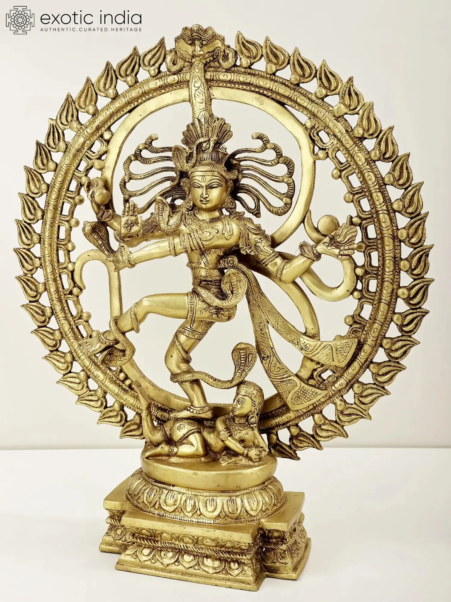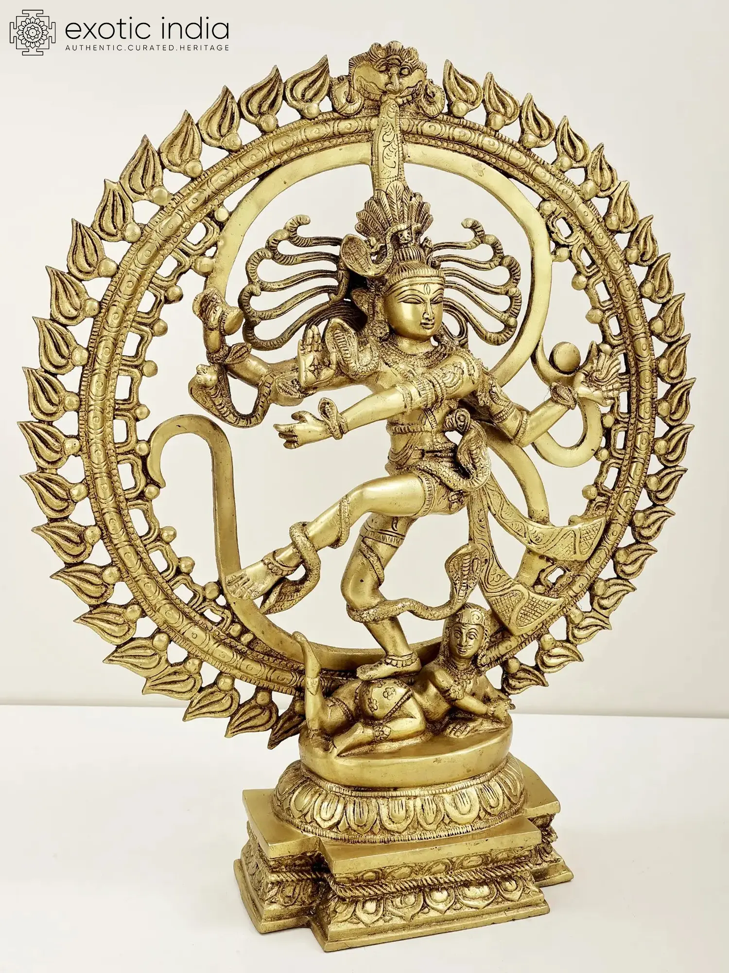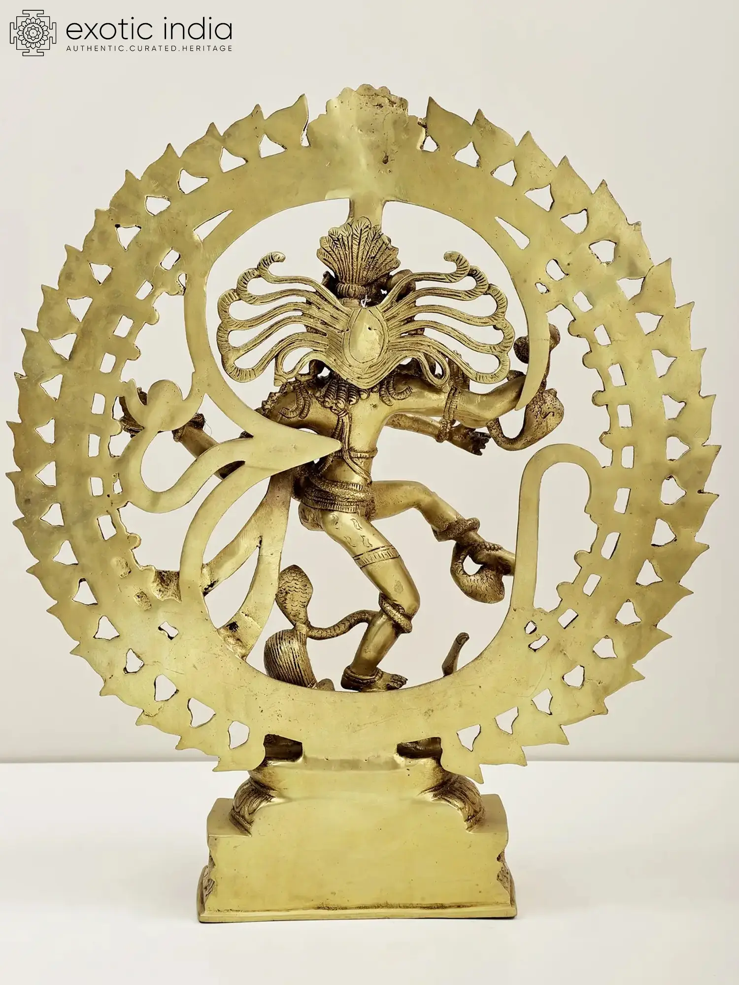 In this brass rendition, Nataraja in the “Om (AUM)” is the embodiment of cosmic harmony, a dance of divine creation and dissolution. Within the celestial “Prabha Mandala”, the boundless universe unfurls, a testament to the eternal cycle of existence. The Lord’s graceful form is a mesmerising fusion of elegance and dynamism. His right foot crushes the dwarf demon (Apasmara) of ignorance, signifying the triumph of wisdom over illusion. The dance’s vigour is manifested in his whirling hair, flowing like a celestial fan behind his head. His hands wield cosmic forces like a “Udukai” (Damaru), the flames of “Agni”, and the reassuring “Abhaya Mudra”. Nataraja’s left hand, crossing his chest, guides us to spiritual purity. Serpents twine around him, testaments to his mastery over fear and the serpentine Kundalini energy, emphasising Shiva’s omnipotent presence in the cosmic dance of existence.