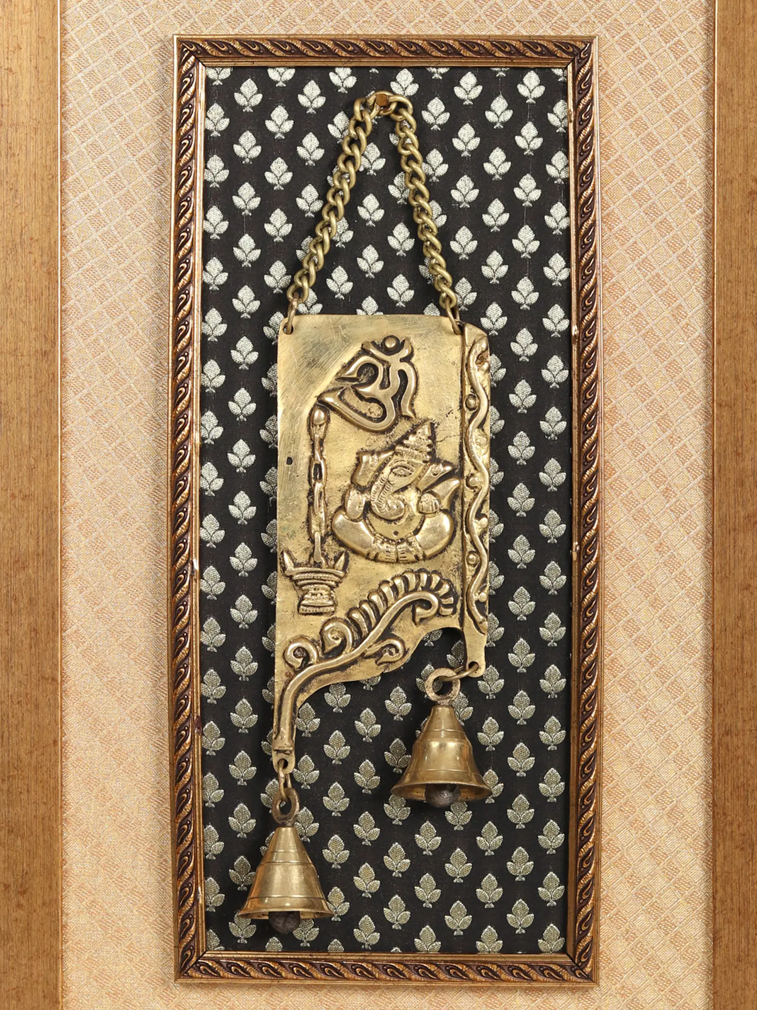This captivating piece is presented within a sturdy wooden frame, its natural grain adding warmth and a grounding presence to the ensemble. The frame is complemented by a luxurious fabric backing, featuring a subtle yet elegant pattern that enhances the visual appeal. The brass Ganesha plaque is suspended by a sturdy chain, allowing it to hang gracefully, drawing the eye and radiating a sense of divinity. Two small, resonant brass bells are suspended below, designed to chime softly with the slightest movement, their gentle melody invoking a sense of tranquility and warding off negative energies. This thoughtful combination of materials creates a piece that is both spiritually significant and aesthetically pleasing, designed to be a focal point in any home or sacred space.