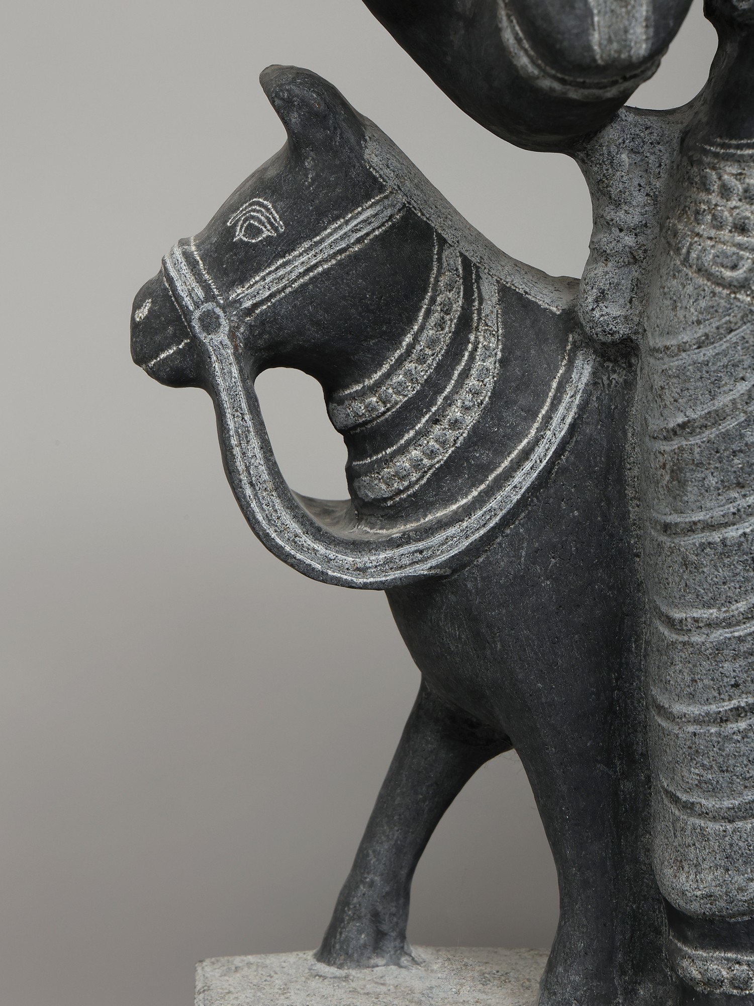 The horse, Shukra's vahana, is far from an insignificant addition to the statue. The horse in Indian culture symbolizes strength, grace, and speed. It is often associated with the sun and the chariot of Surya, emphasizing the connection between celestial bodies and the divine. Shukra’s choice of mount signifies his connection to the energies of vitality and passion associated with the sun. The horse's presence in this sculpture complements Shukra's attributes, enhancing the statue's symbolic power. Its detailed carving and elegant pose add to the overall artistic merit of the piece.