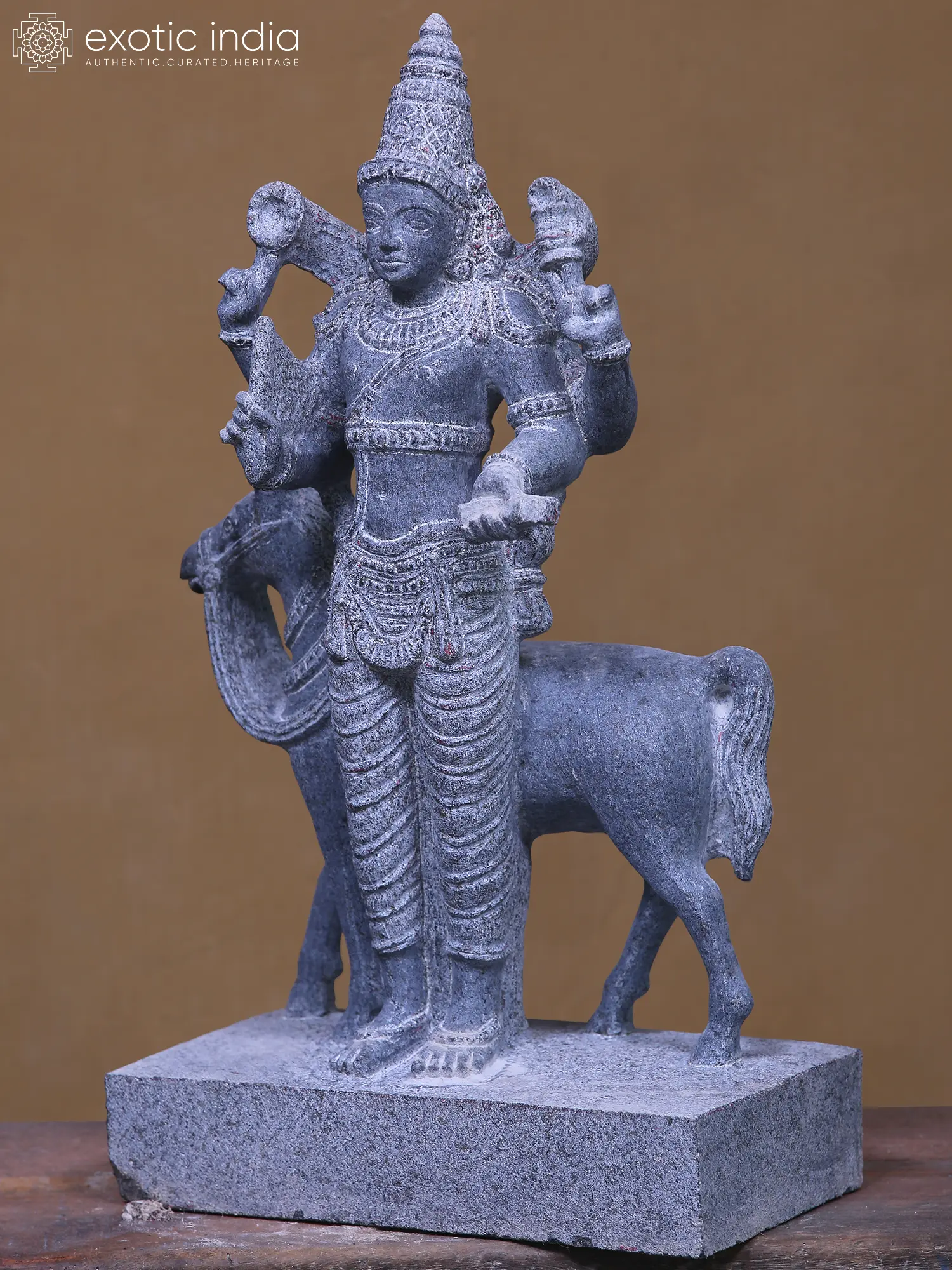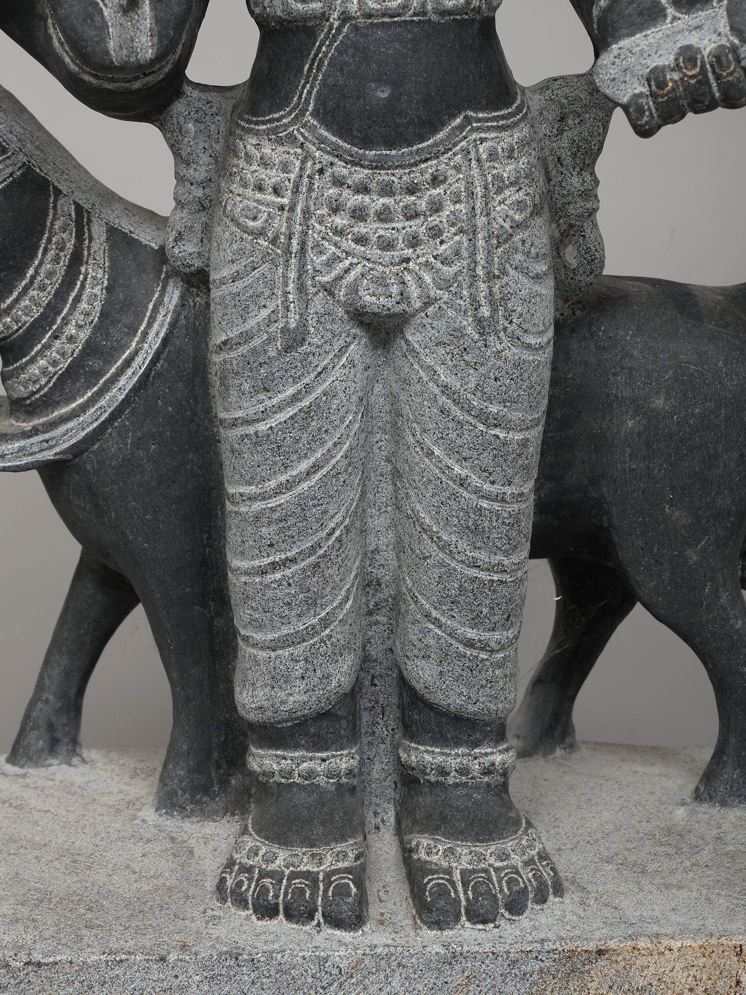 This exquisite 21-inch Shukra Graha statue, carved from rich black granite, captures the essence of the Vedic planet Venus. Shukra, the deity of love, beauty, and prosperity, is depicted here in his regal splendor, seated atop his vahana (vehicle), a majestic horse. The statue's meticulous detail, from the intricate folds of Shukra's garments to the lifelike rendering of the horse, showcases the skill of traditional Indian artisans. This is more than just a statue; it is a powerful symbol of beauty, harmony, and abundance, bringing a touch of ancient wisdom and elegance to any space. The deep, lustrous black granite enhances the statue's gravitas, symbolizing the depth and mystery associated with Shukra's influence in astrology and mythology.