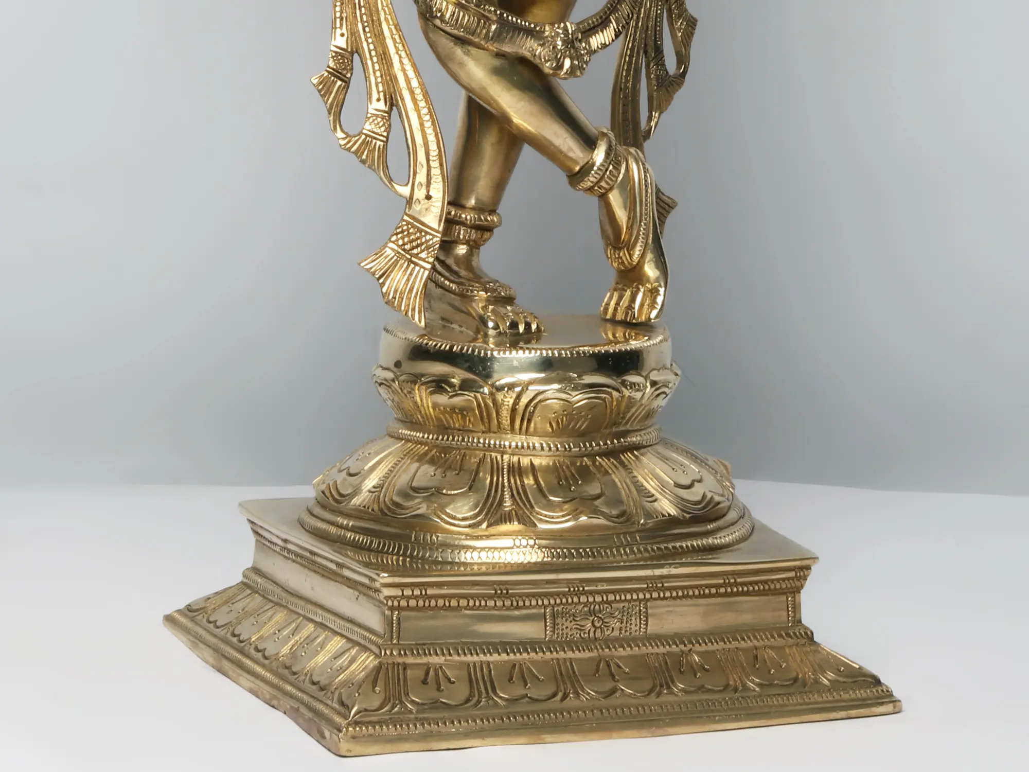 Sculpted from pure brass the colour of resplendent gold. Tall, slender silhouette; not unlike the flute pressed to His lips. Harmony and compassion writ large on the divine countenance. Framed by a Kirtimukham crown and laterally extending sprigs of vine and, of course, a halo.