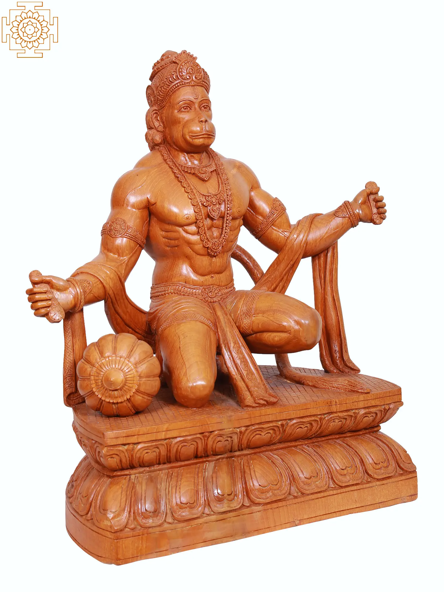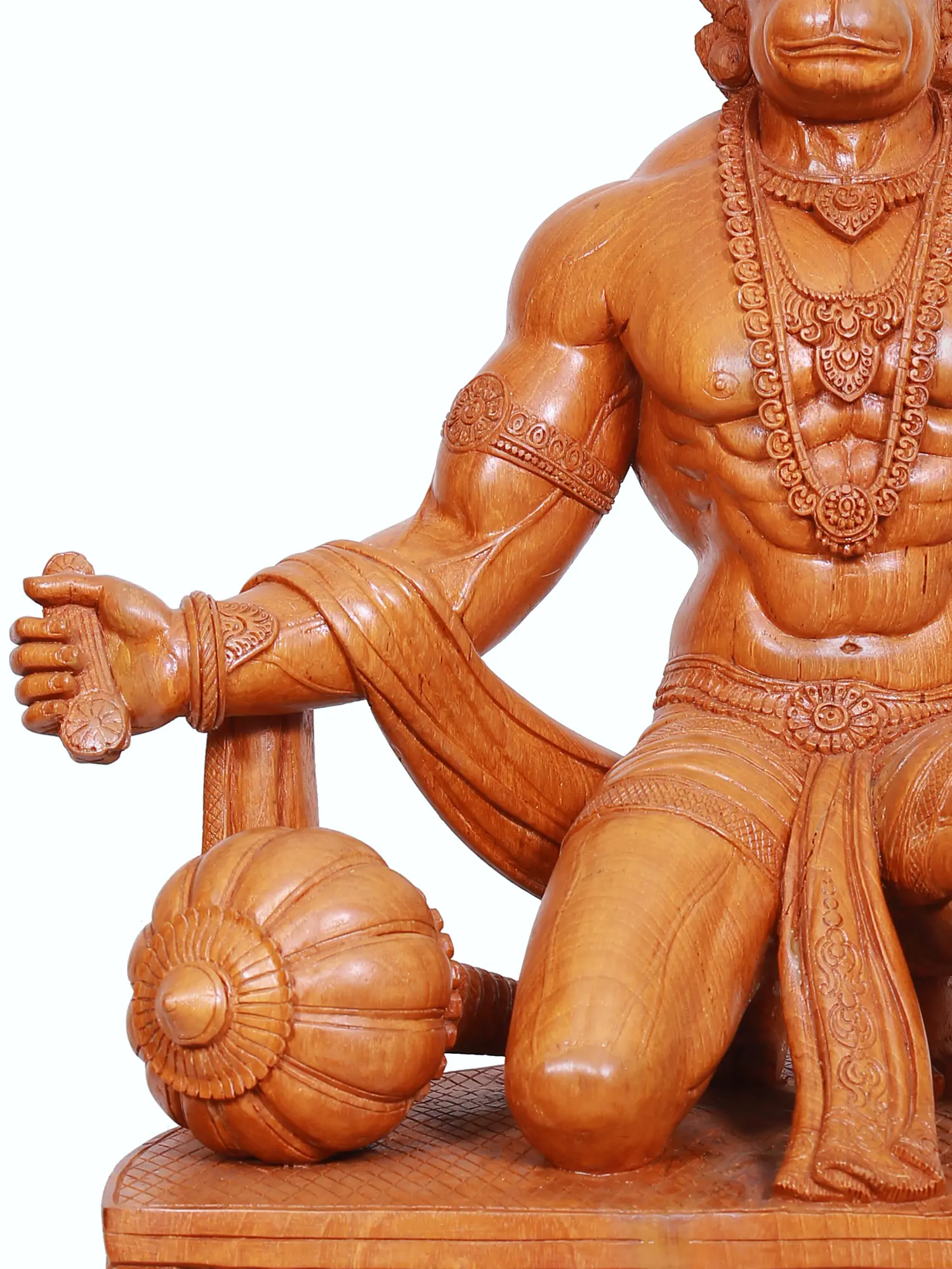 This magnificent wooden carving depicts Lord Hanuman, the devoted general of the Vanara army and an ardent devotee of Lord Rama. Crafted from fine teakwood, this 21-inch sculpture captures the essence of Hanuman's unparalleled strength, unwavering loyalty, and immense spiritual power. The intricate details showcase Hanuman in a majestic seated posture, his muscular physique radiating an aura of controlled power. His face, rendered with remarkable expression, reflects both determination and profound reverence.