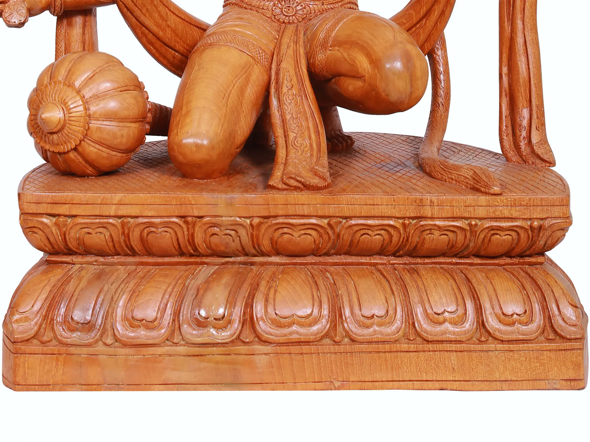This sculpture is a testament to the skill of master artisans. The superfine carving on the durable teakwood brings to life the divine form of Hanuman. Every element, from the elaborate crown and the sacred thread adorning his chest to the detailed musculature and the flowing fabric, is meticulously rendered. The natural warmth and rich grain of the teakwood add to the sculpture's aesthetic appeal, making it a striking centerpiece for any devotional space or collection. The finely carved lotus base provides a sturdy and elegant foundation, symbolizing purity and spiritual elevation. This piece is not merely a decorative item but a sacred representation, intended to inspire devotion and embody the virtues of strength, loyalty, and courage.