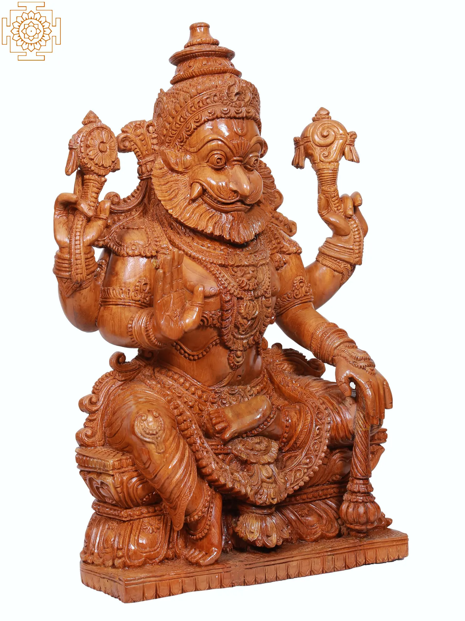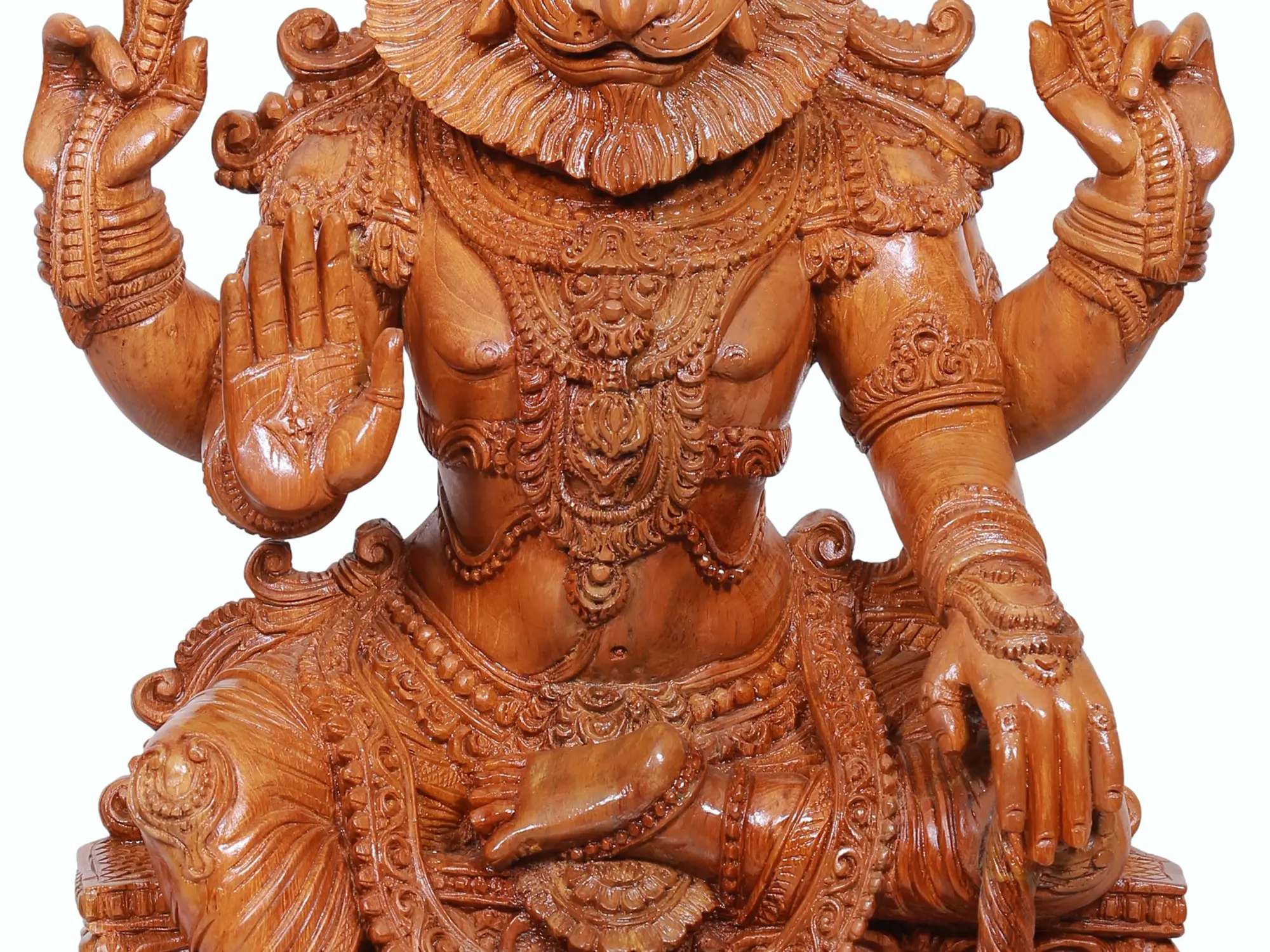 His right hand is depicted in the Abhaya mudra, often known as the blessing position. Sitting on a double lotus pedestal podium, adorned in regal attire, he is exuding a celestial aura, showering blessings on his devotees. Crafted with utmost devotion, this mesmerising artwork serves as a reminder of Lord Narasimha’s role as the protector of devotees, eradicating evil and restoring harmony.
