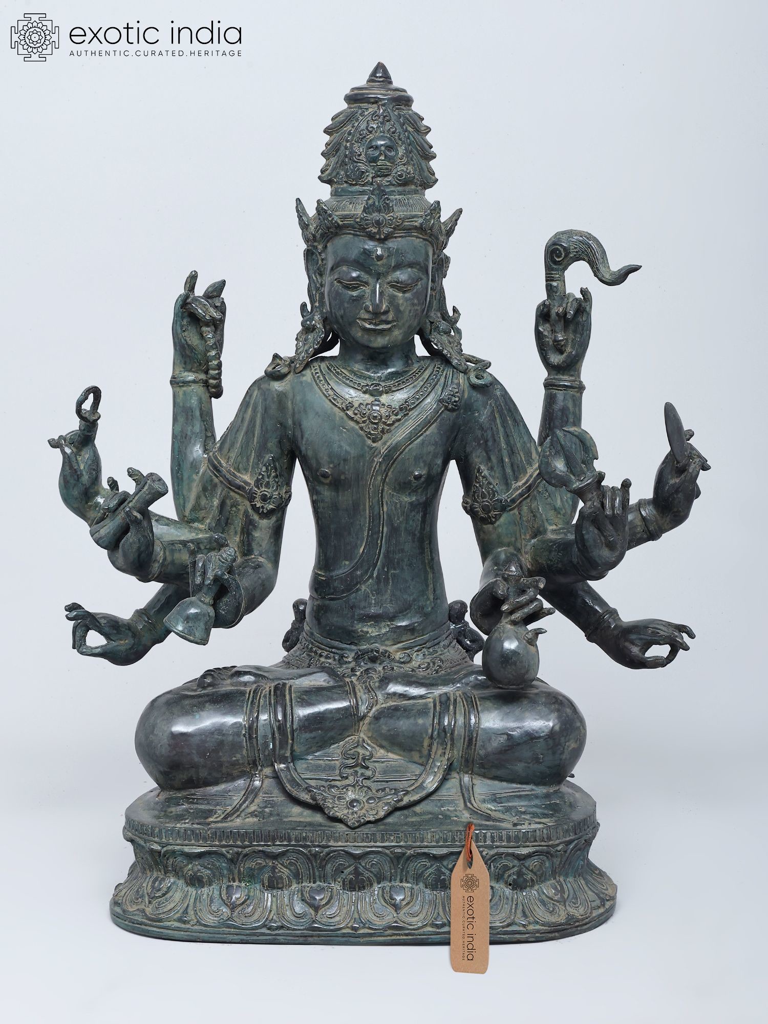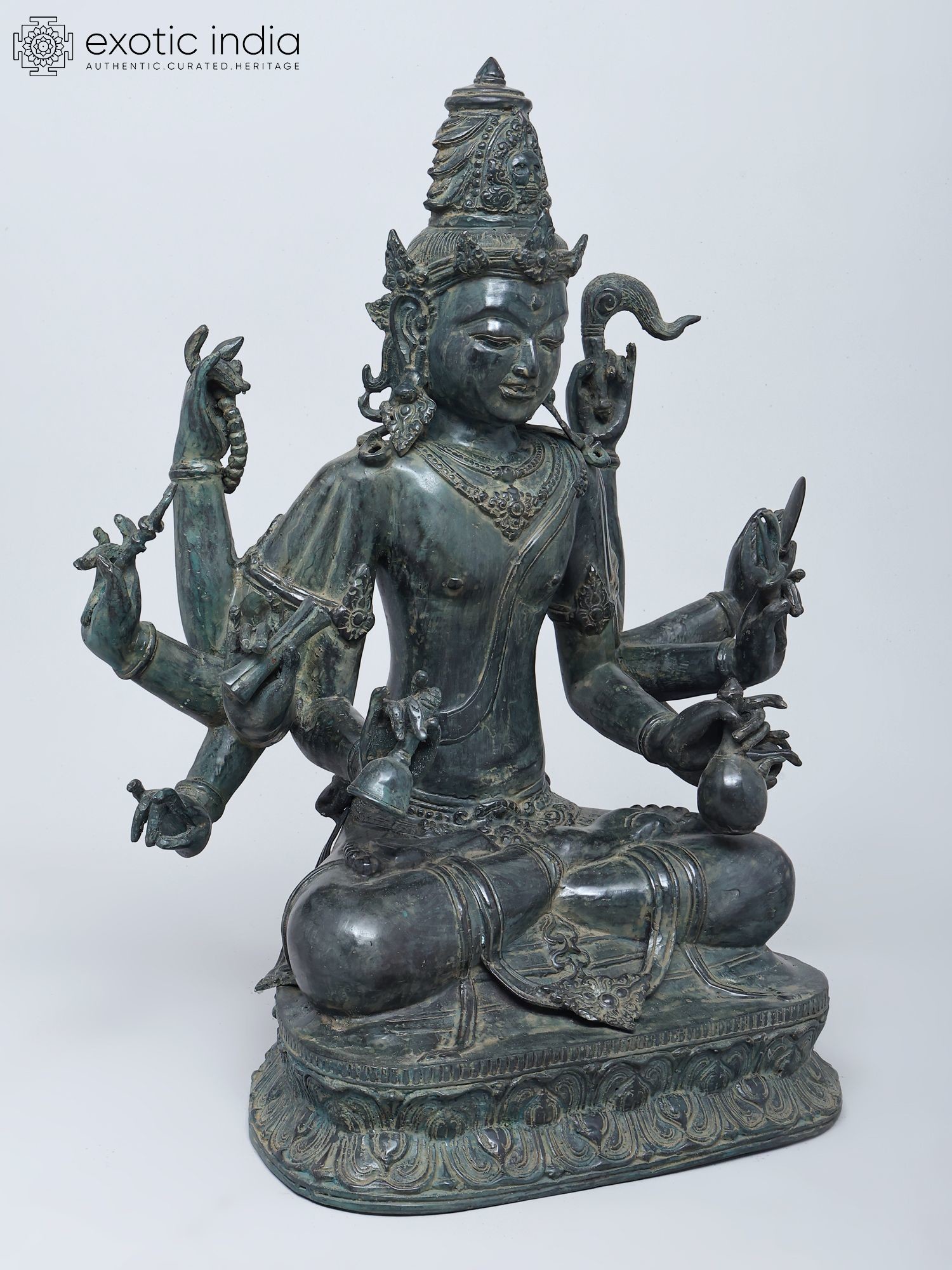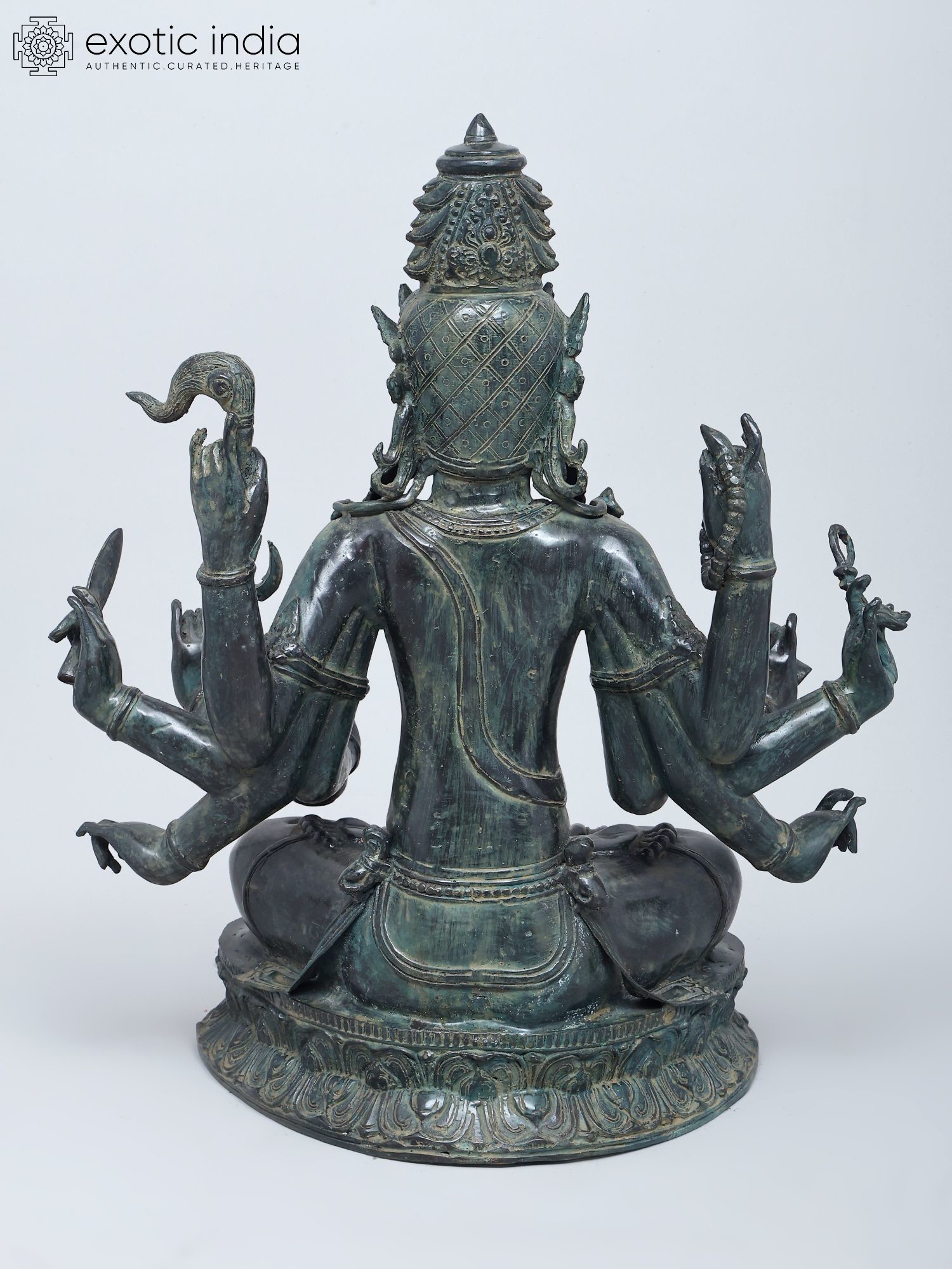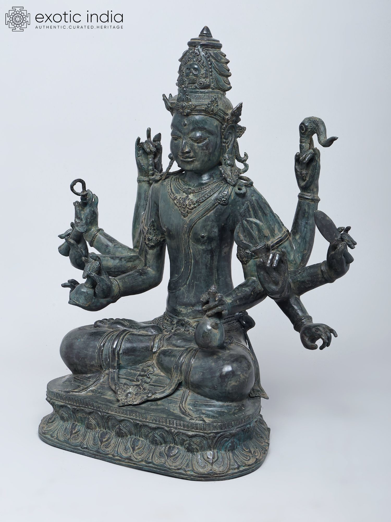 Intricately detailed brass statue depicting Lord Indra with ten arms.