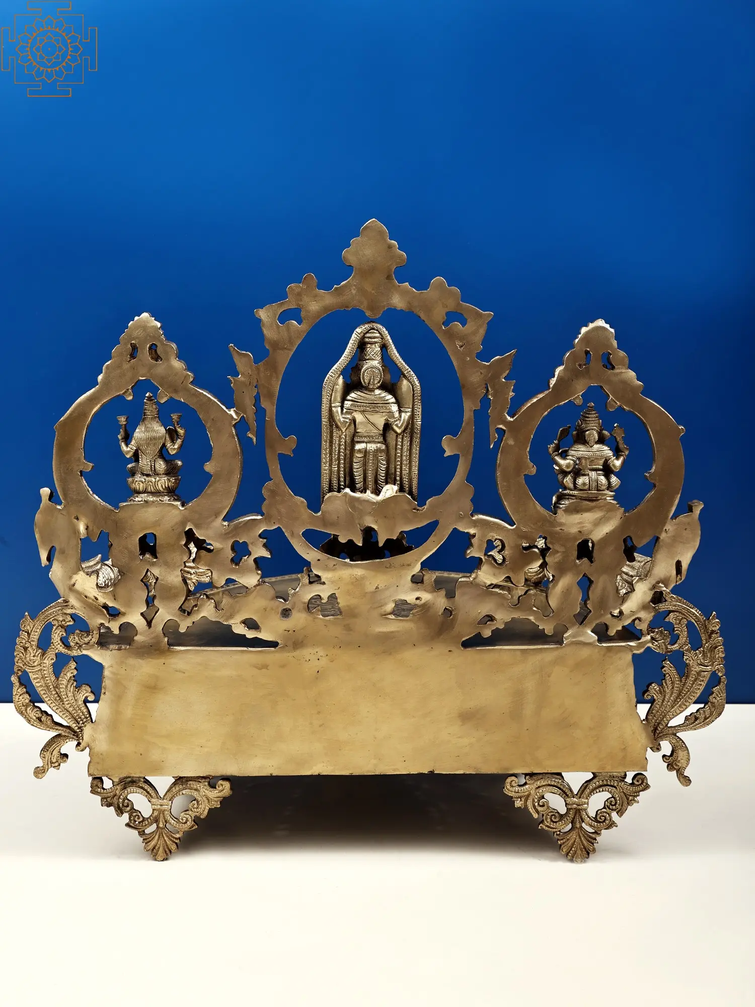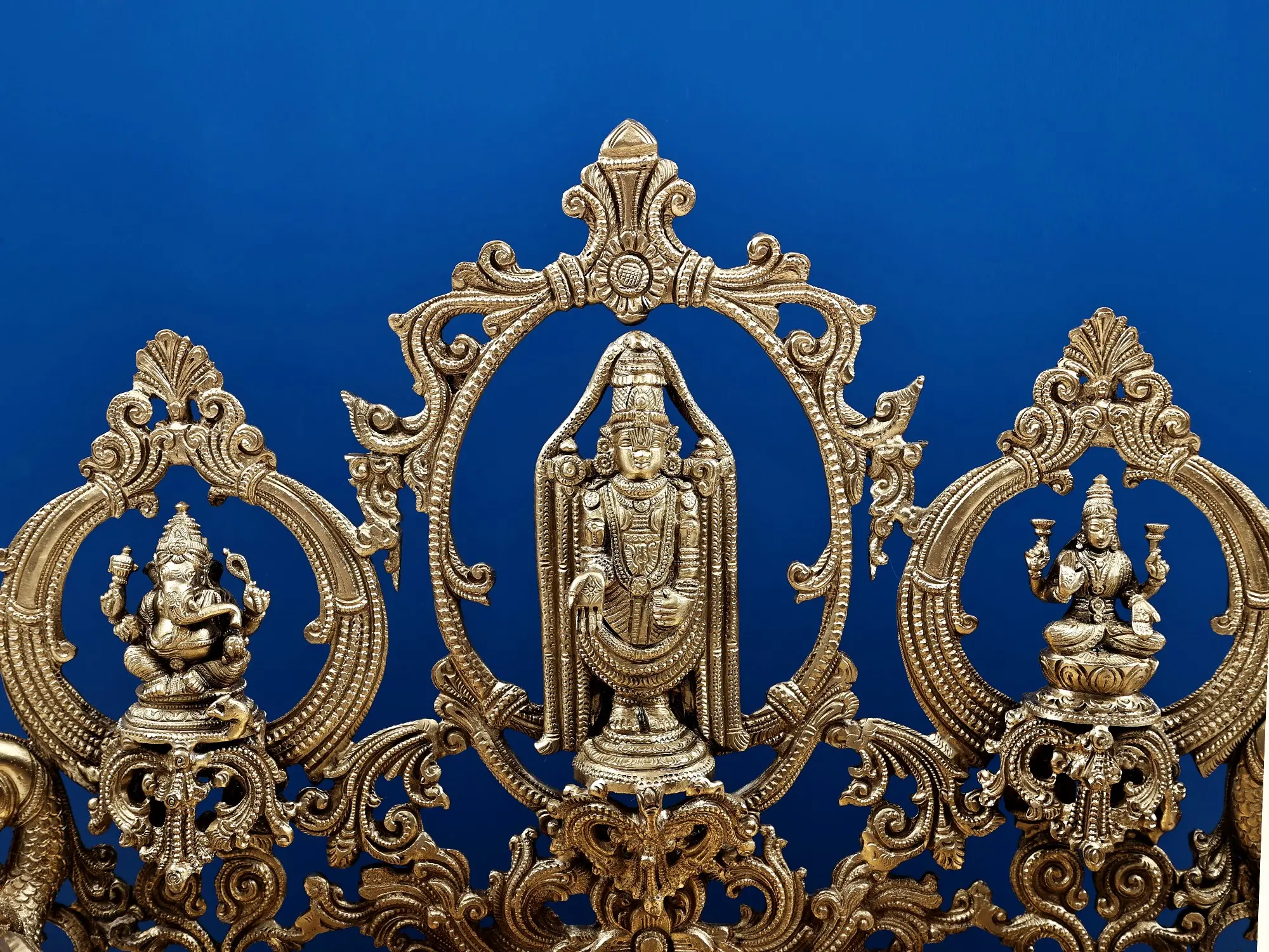 This sacred pedestal, adorned with the celestial presence of Tirupati Balaji, Ganesha, Lakshmi, and Saraswati, emerges as a captivating symphony of divinity. At the heart of this artistic masterpiece, Tirupati Balaji stands majestically, a beacon of grace and benevolence.