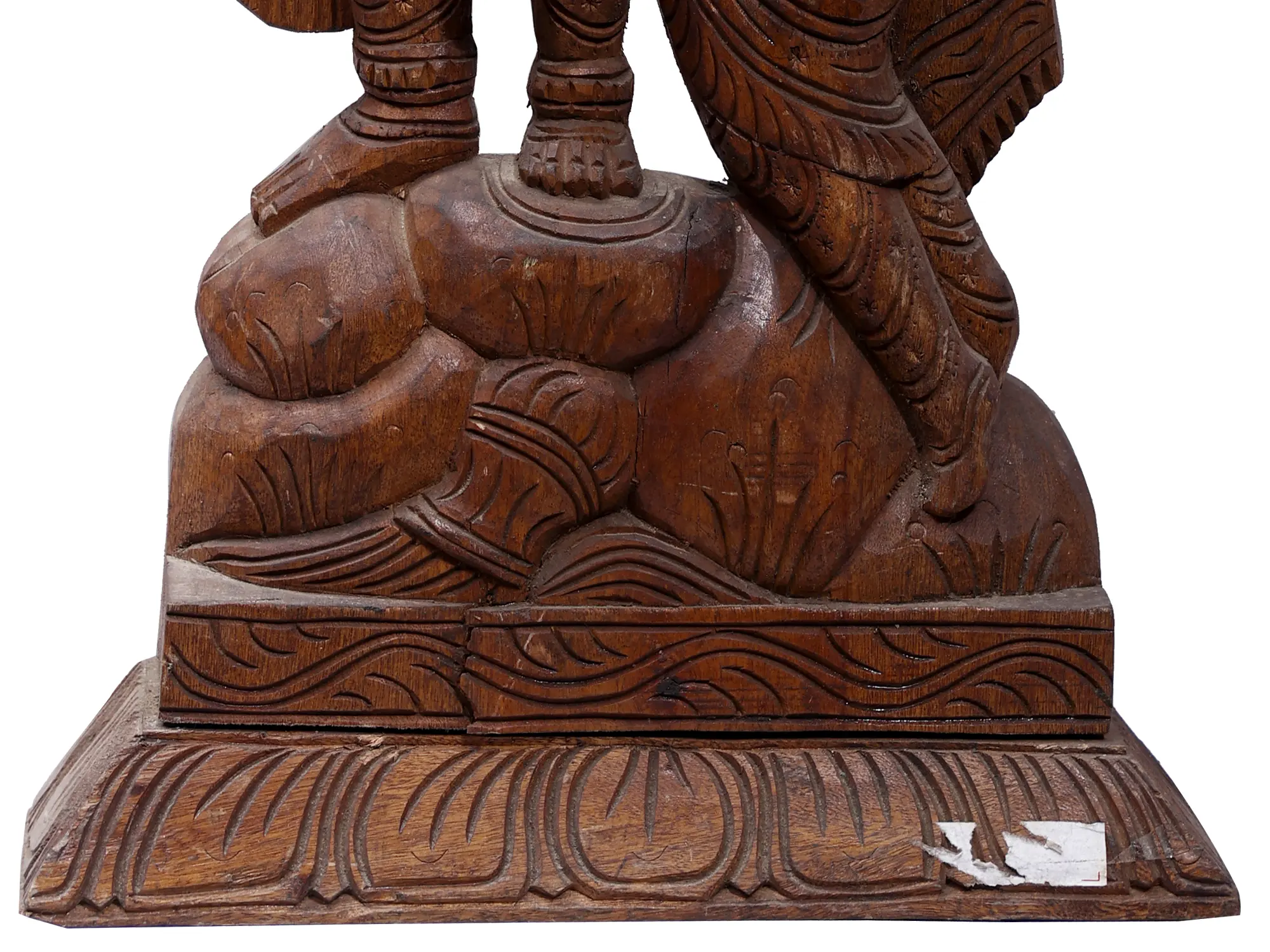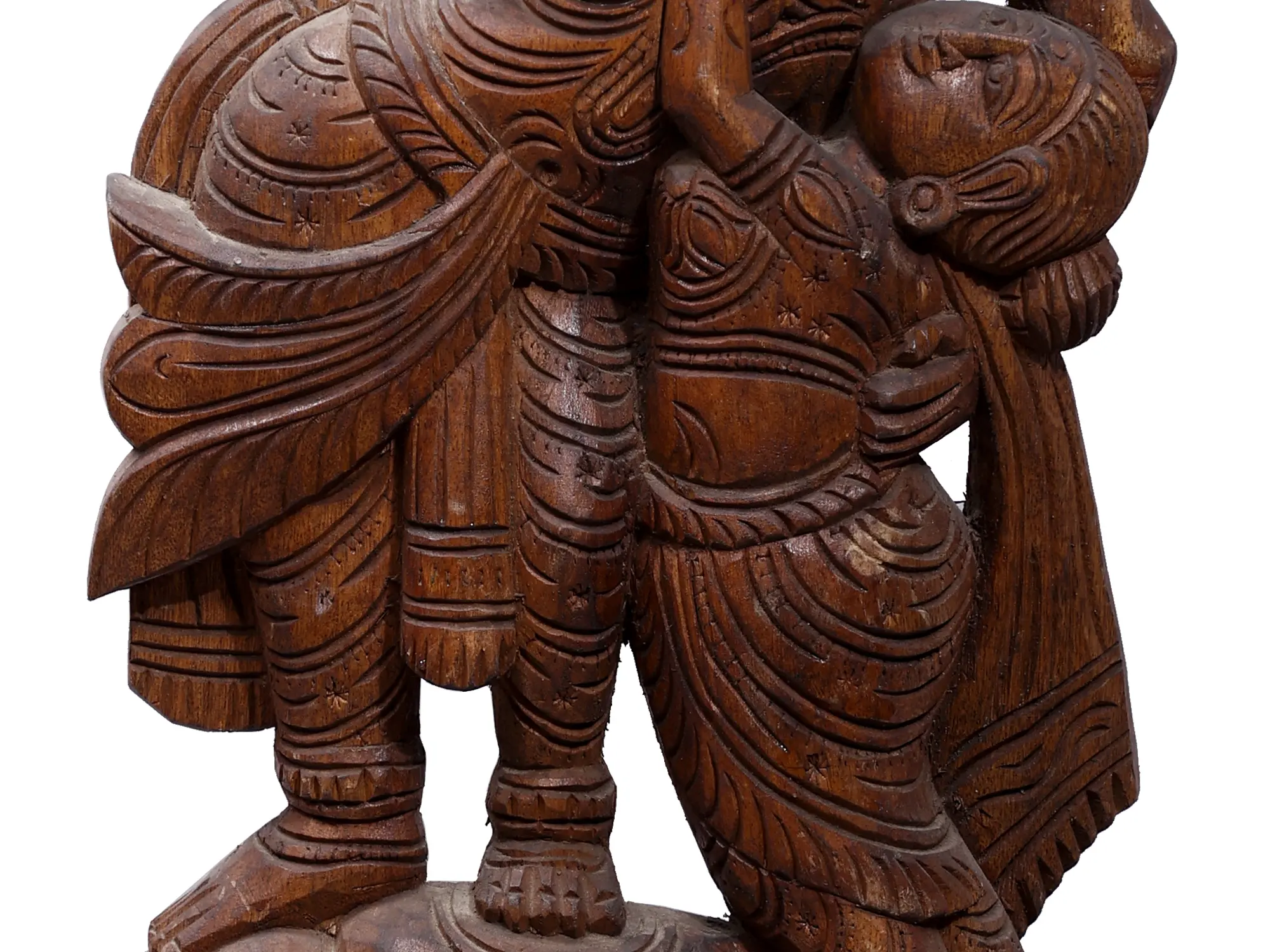 Each curve and contour of this sculpture has been meticulously shaped to bring the divine pair to life. The natural grain of the wood adds a warmth and depth, enhancing the tactile and visual appeal of the piece. The artist has skillfully conveyed the subtle nuances of emotion – Krishna's protective gaze and Radha's adoring surrender. The base itself is a work of art, intricately carved with patterns that anchor the divine figures and elevate their presence. This piece is designed to be a focal point in any sacred space or a cherished addition to a collection of religious art, radiating an aura of peace, love, and spiritual fulfillment. It serves as a constant reminder of the enduring power of devotion and the sublime beauty of divine love.