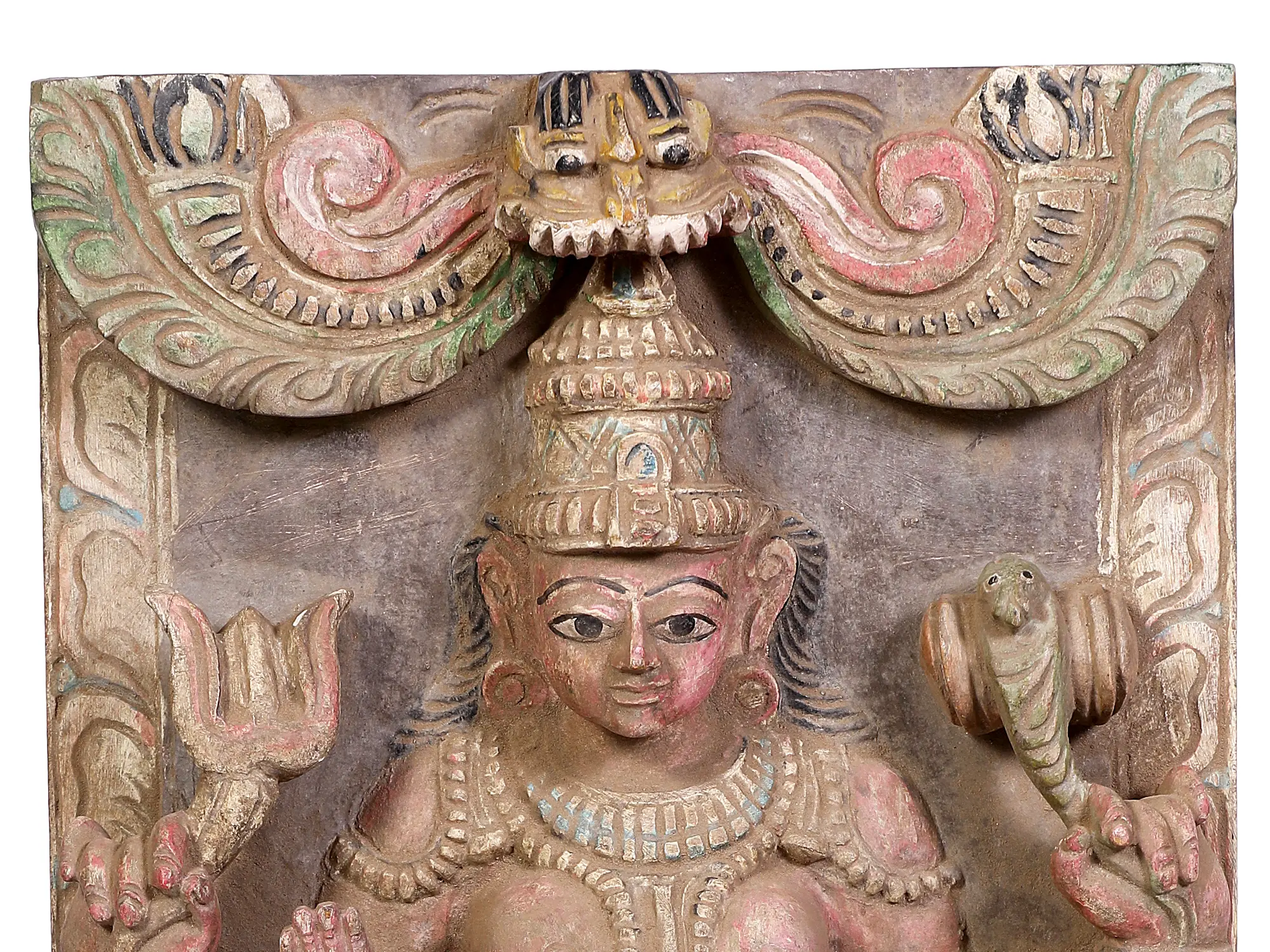 This exquisite wooden carving depicts the revered Goddess Mariamman, a benevolent deity deeply worshipped in South India and across the Tamil diaspora. Mariamman is a principal goddess of fertility, rain, and a fierce protector against disease and evil. Her presence is invoked during times of hardship, and her blessings are sought for well-being, prosperity, and protection from ailments. The goddess is often depicted with multiple arms, each holding symbolic objects that represent her various powers. The artistry of this particular rendition is captivating. Carved from wood, the sculpture showcases the goddess in a seated posture of serenity and authority. Her serene expression, accentuated by finely detailed facial features, invites contemplation and devotion. The intricate ornamentation adorning her headdress, necklaces, and bangles speaks to the richness of traditional Indian craftsmanship. The vibrant, albeit faded, colors that still grace the carving hint at its original splendor and the meticulous attention given to its creation.