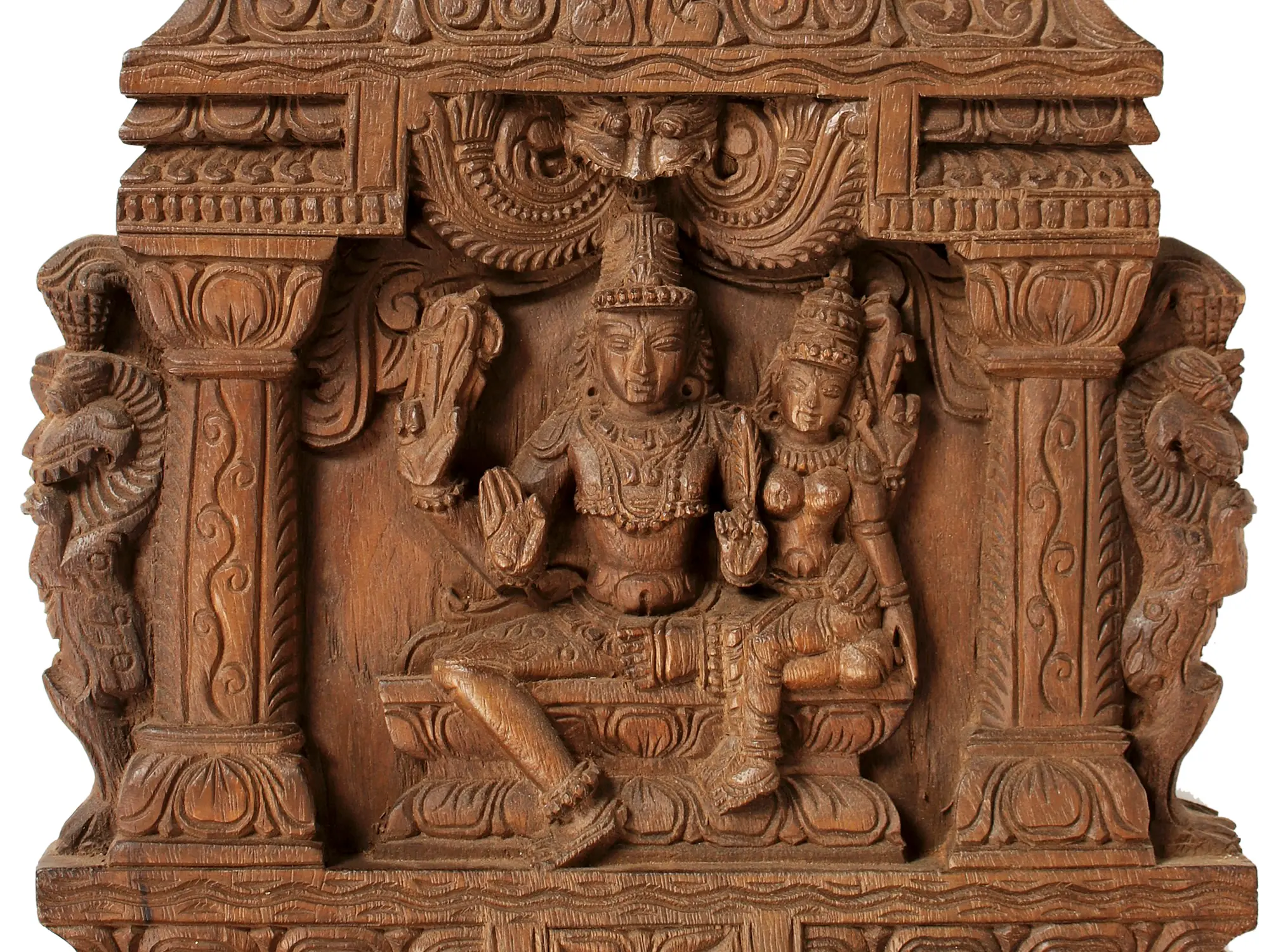 It is a wood-sculpted composition in keeping with traditional architecture. An ornate archway sculpted with vine and peacock and floral motifs supports the garbhagrha. Within the garbhagrha are the seated figures of Shiva and Parvati, in great proximity to each other.