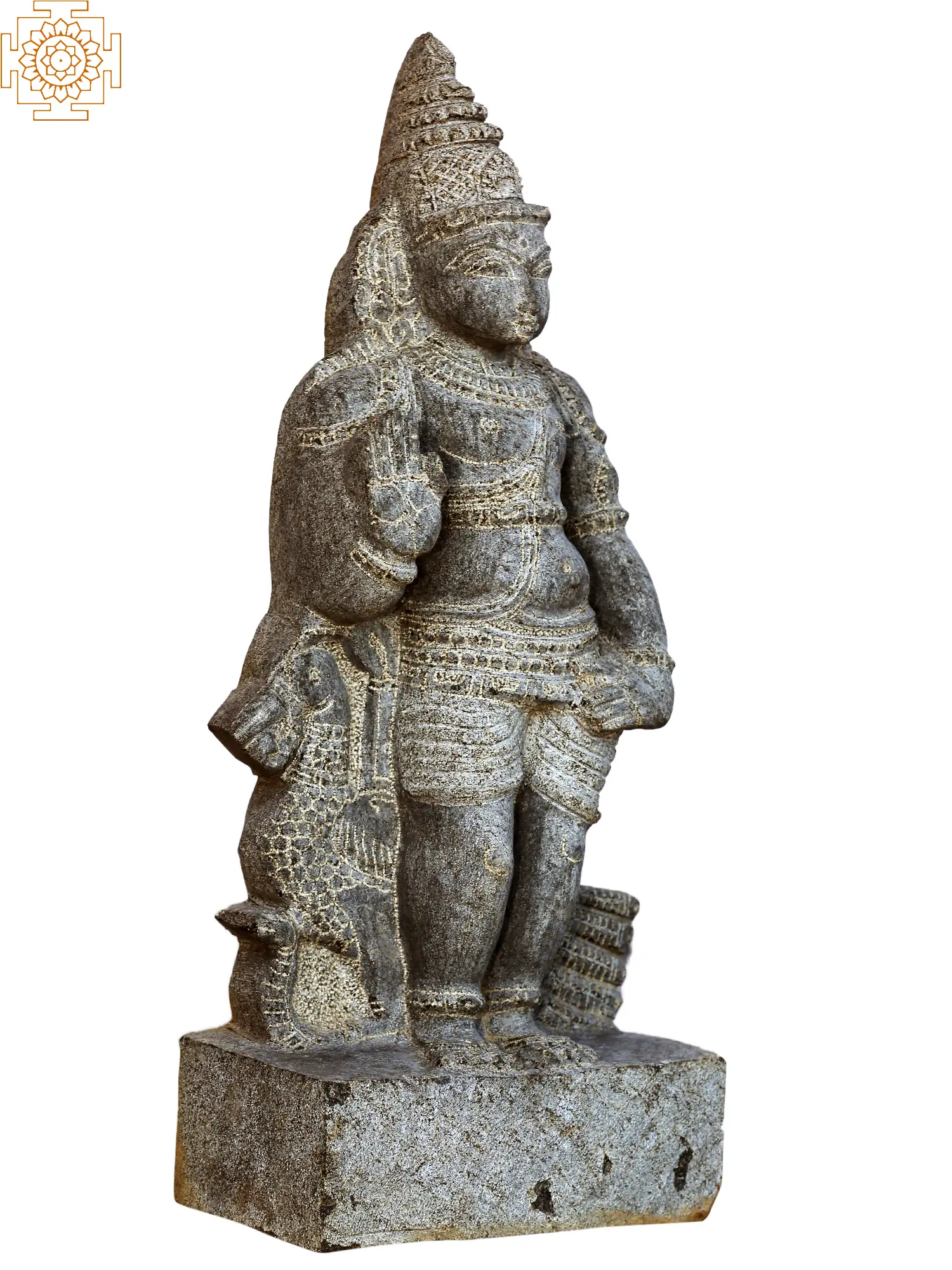 In this depiction, Murugan is standing, adorned with minimal jewelry and a peacock beside him, representing his Vahana (Vehicle) and connection to nature.