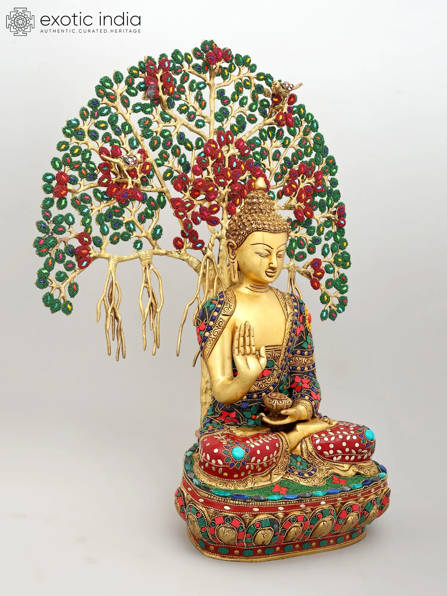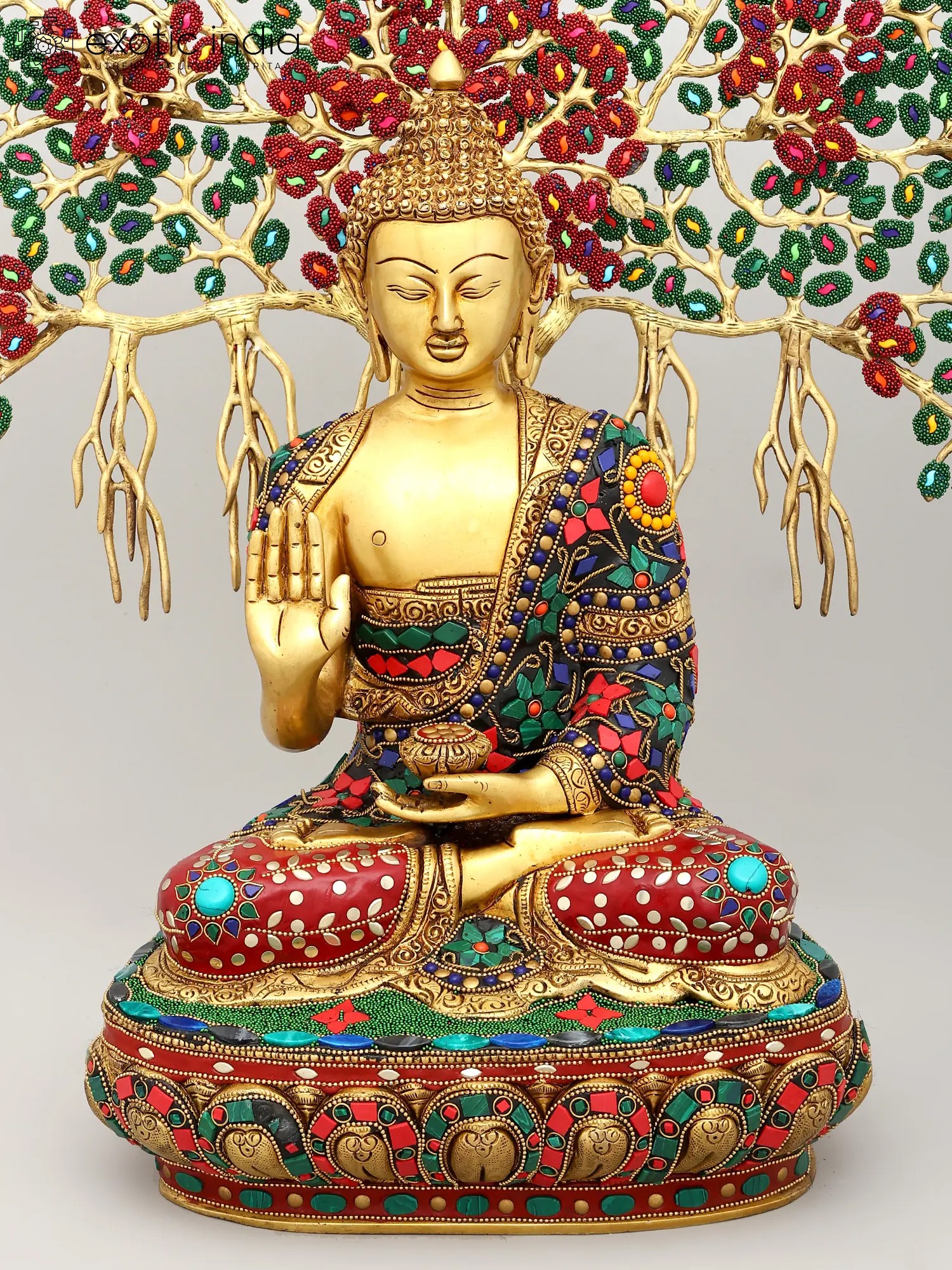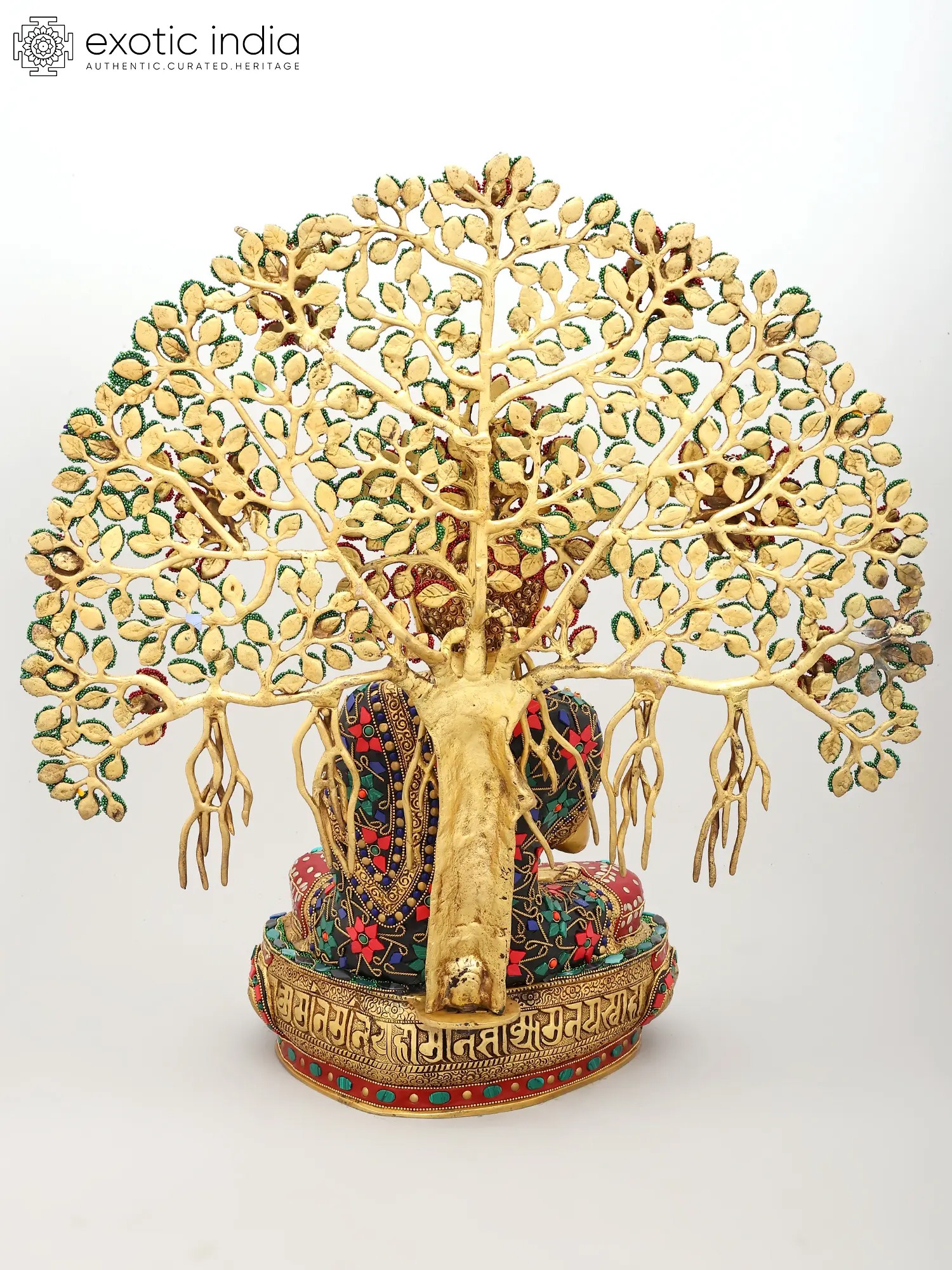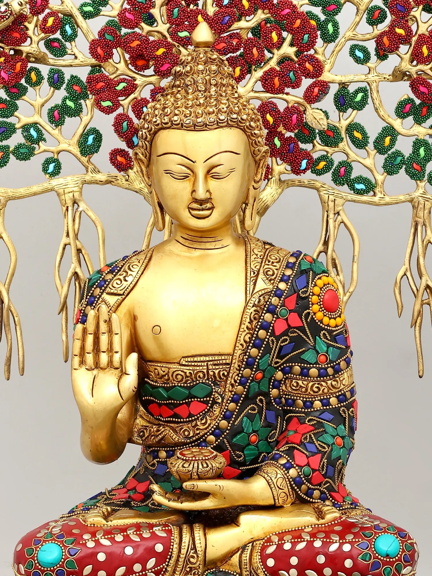 This exceptional piece is not merely a statue; it is a vibrant masterpiece of artisanal skill. Crafted from high-quality brass, the figure of Buddha is rendered with exquisite detail, his serene countenance exuding compassion and tranquility. The true spectacle, however, lies in the elaborate inlay work that adorns both the Buddha's monastic robe and the majestic canopy of the Bodhi tree. Tiny, vividly colored beads and stones have been meticulously embedded to create a dazzling mosaic. The Bodhi tree itself, with its sprawling branches and dense foliage, is brought to life with a vibrant tapestry of green leaves and rich red blossoms, interspersed with jewel-toned accents. This intricate inlay work transforms the statue into a visual symphony, symbolizing the abundance and beauty of the natural world that witnessed such a transformative event. ––––––––––