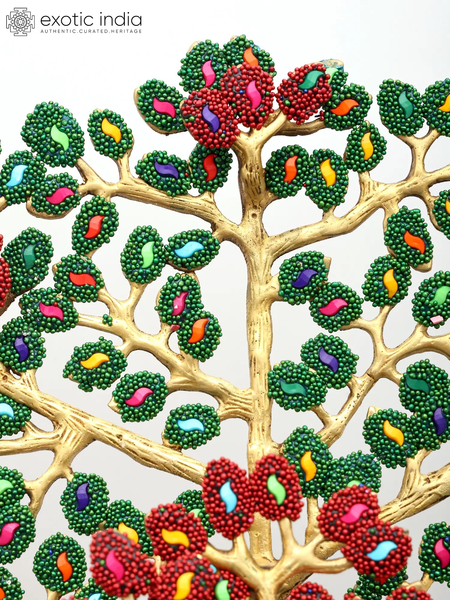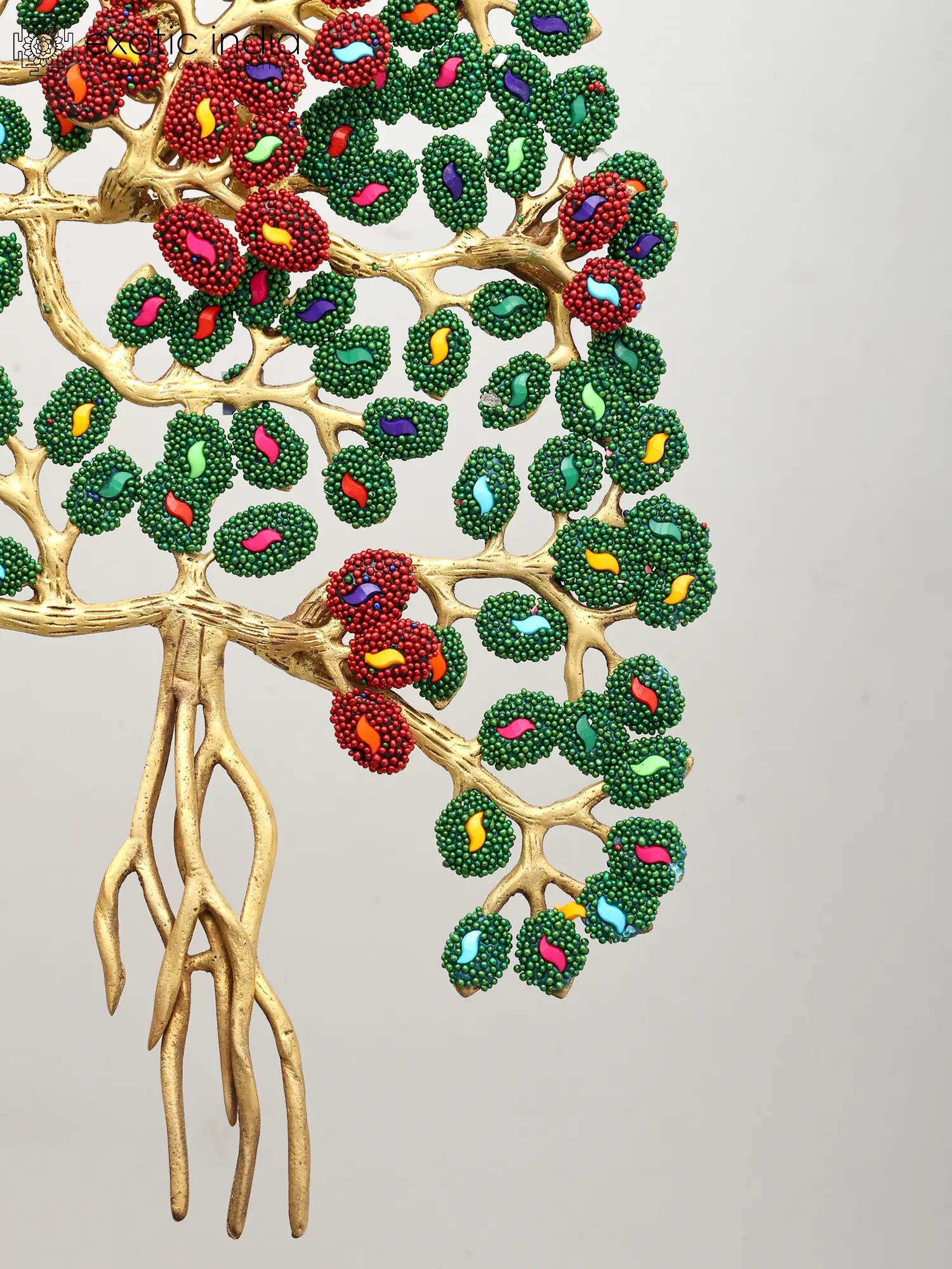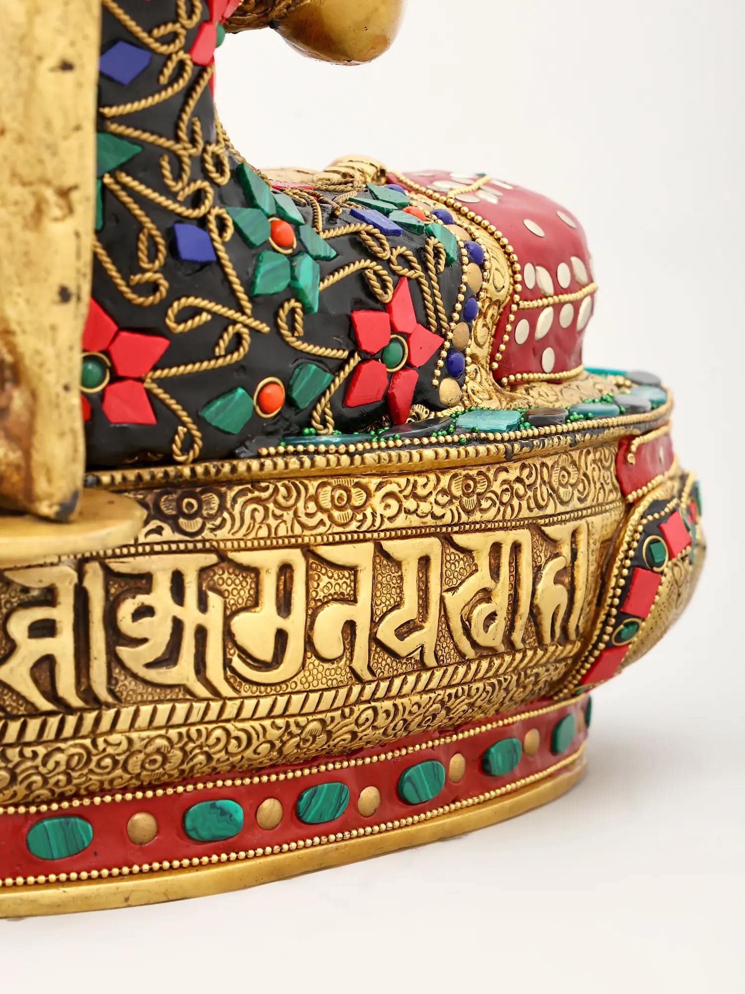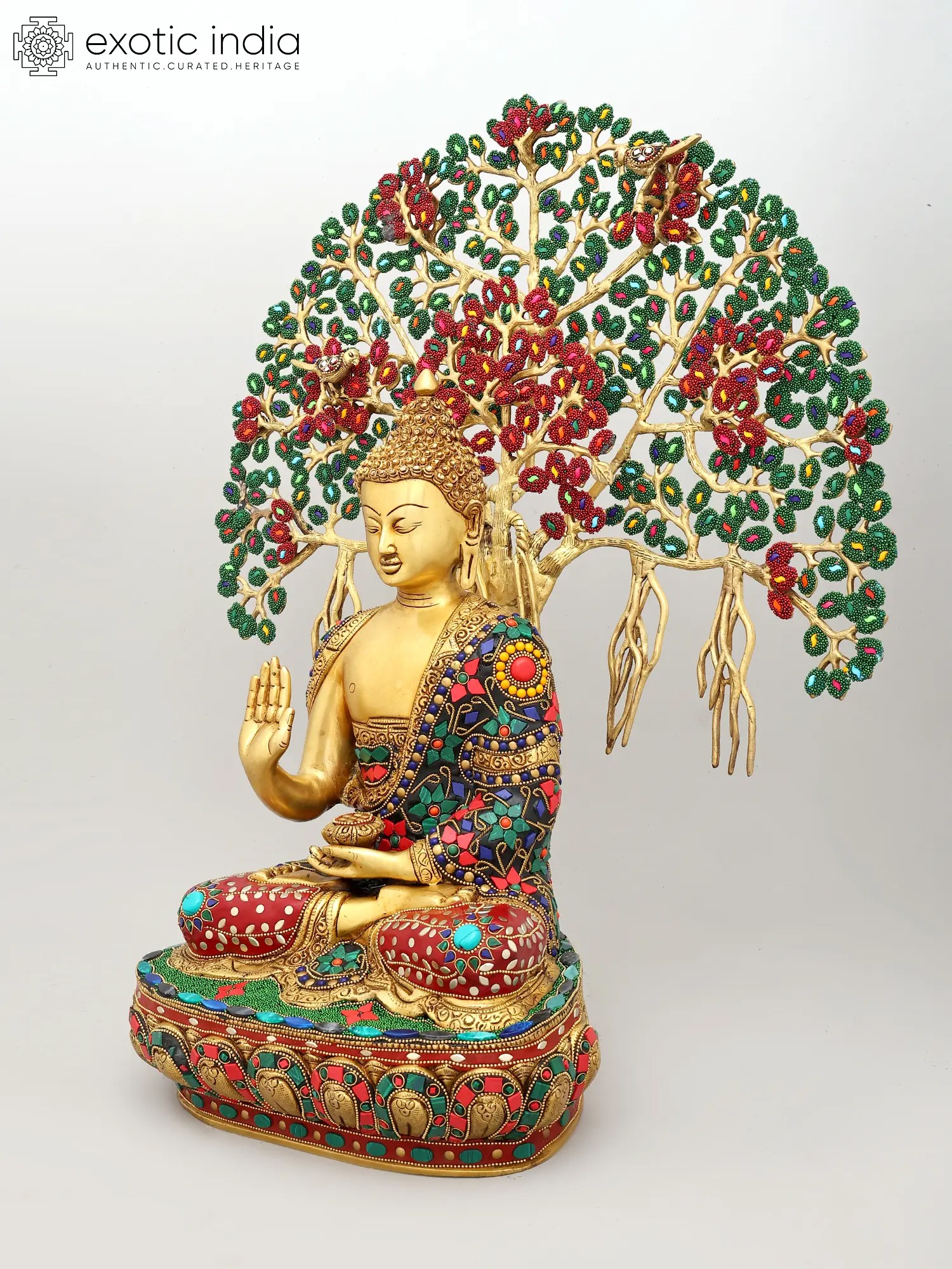 This exceptional piece is not merely a statue; it is a vibrant masterpiece of artisanal skill. Crafted from high-quality brass, the figure of Buddha is rendered with exquisite detail, his serene countenance exuding compassion and tranquility. The true spectacle, however, lies in the elaborate inlay work that adorns both the Buddha's monastic robe and the majestic canopy of the Bodhi tree. Tiny, vividly colored beads and stones have been meticulously embedded to create a dazzling mosaic. The Bodhi tree itself, with its sprawling branches and dense foliage, is brought to life with a vibrant tapestry of green leaves and rich red blossoms, interspersed with jewel-toned accents. This intricate inlay work transforms the statue into a visual symphony, symbolizing the abundance and beauty of the natural world that witnessed such a transformative event. ––––––––––