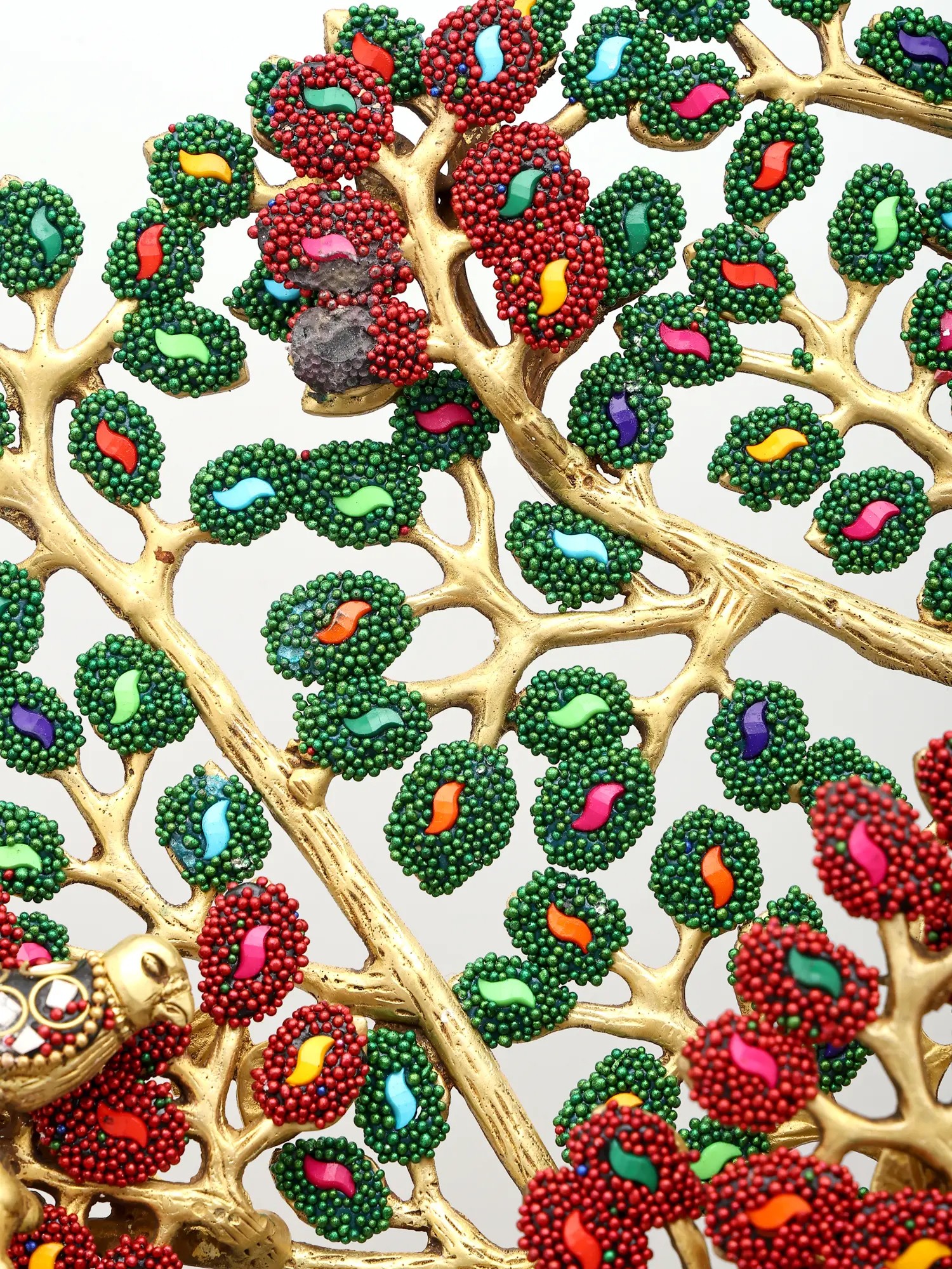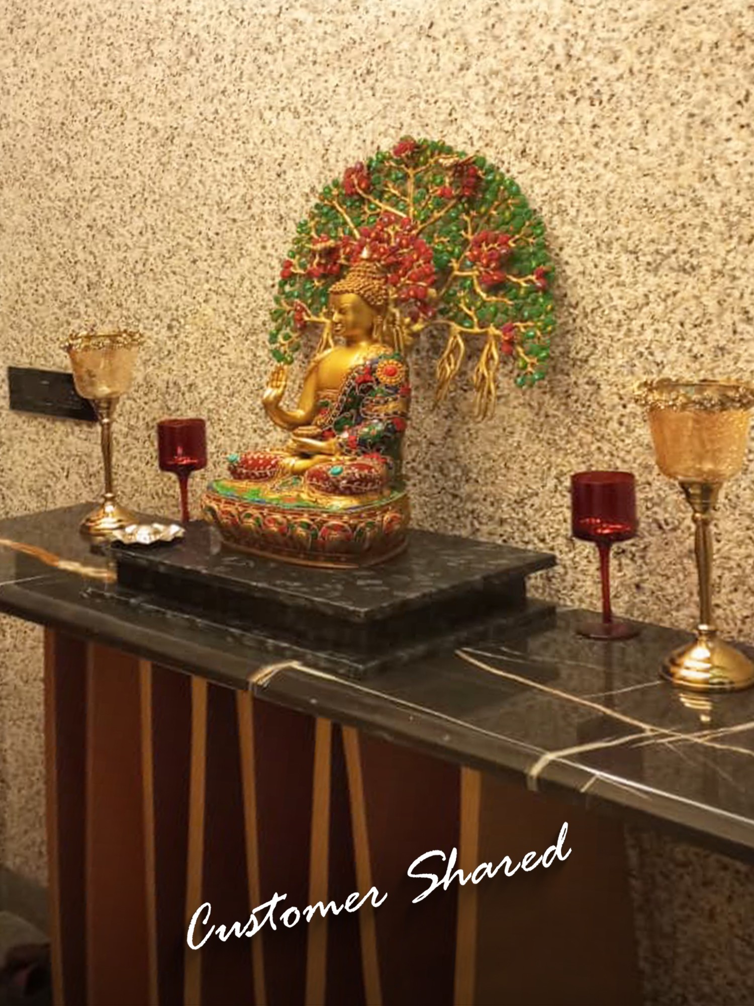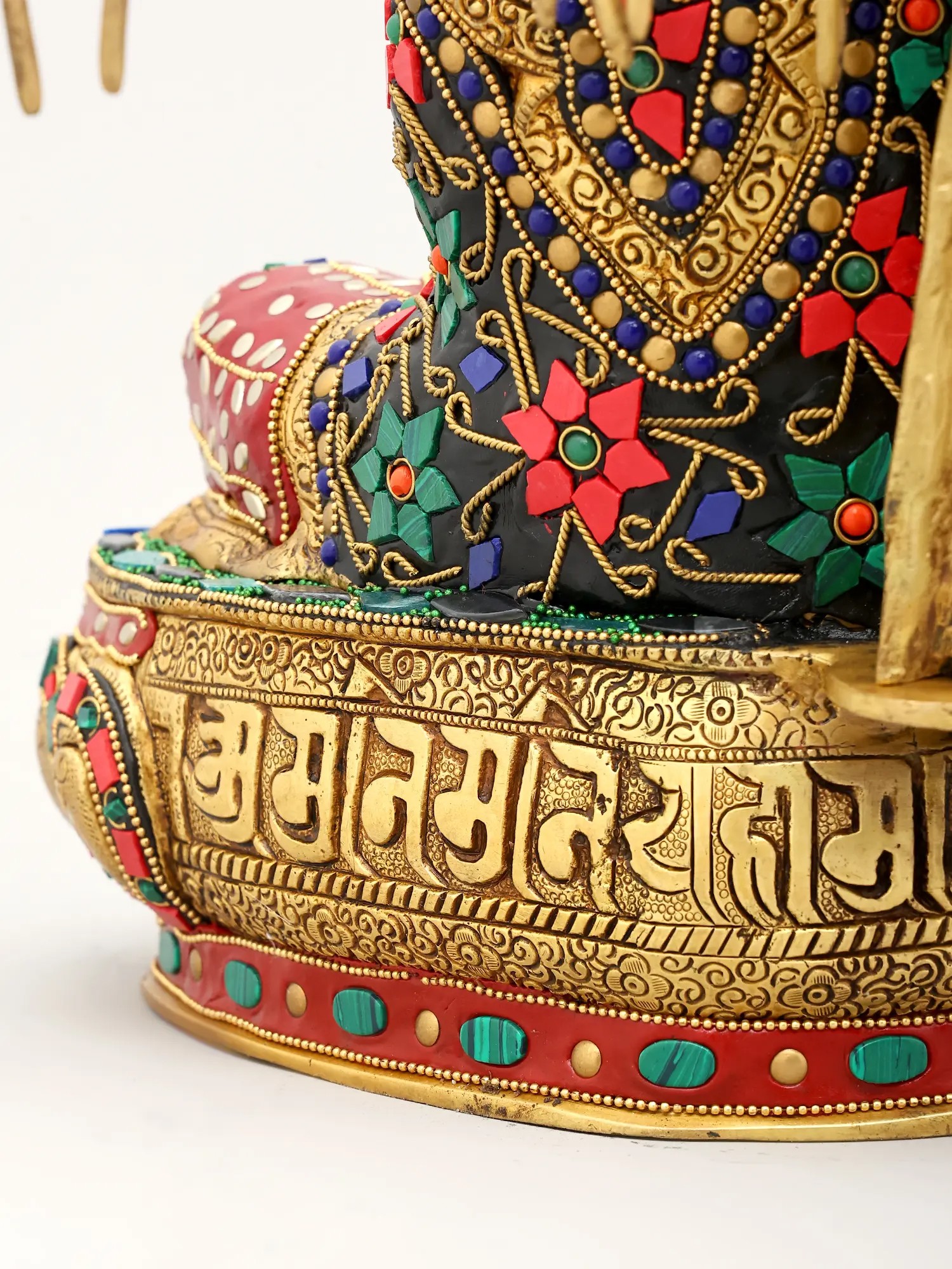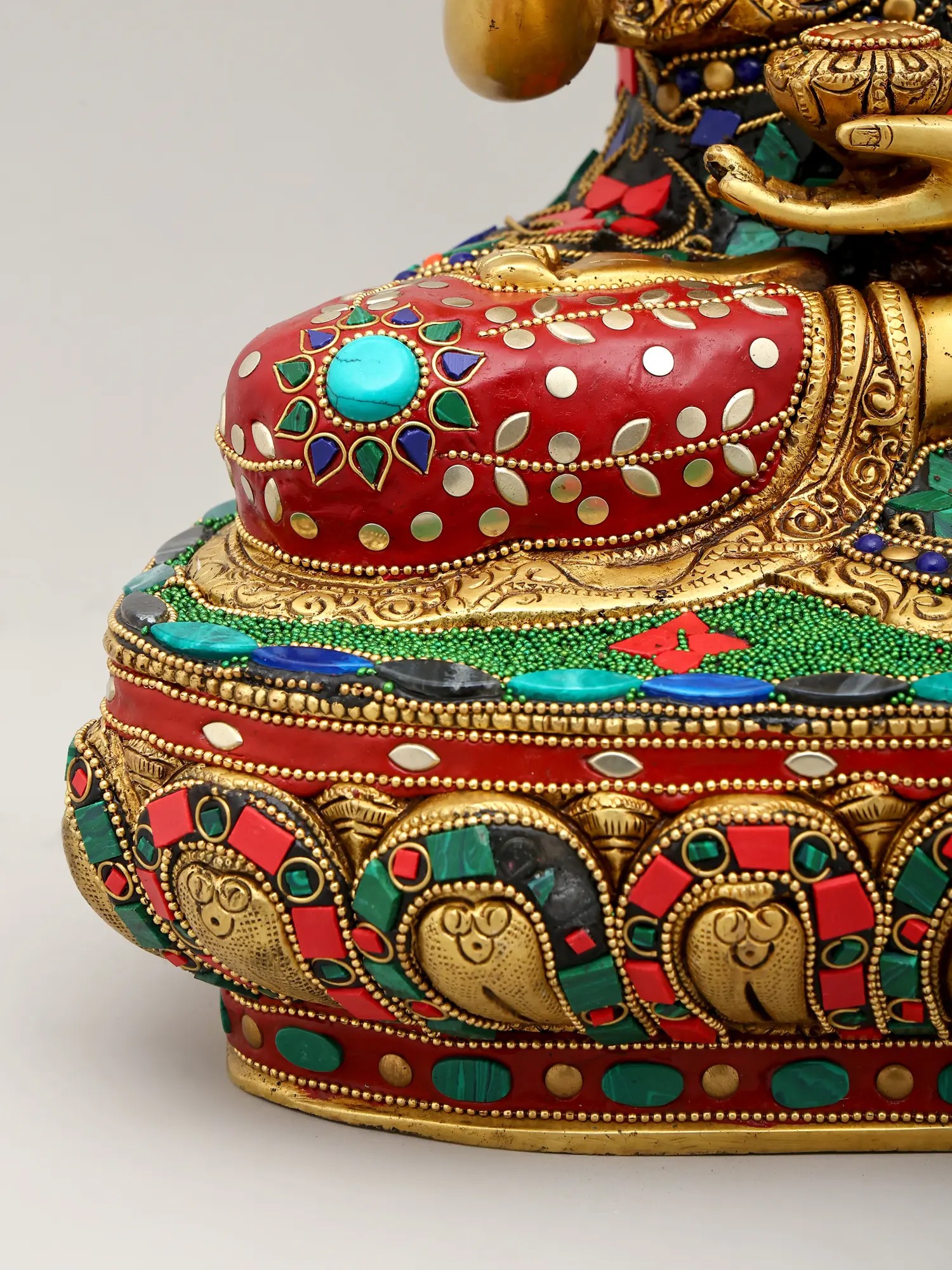 This exceptional piece is not merely a statue; it is a vibrant masterpiece of artisanal skill. Crafted from high-quality brass, the figure of Buddha is rendered with exquisite detail, his serene countenance exuding compassion and tranquility. The true spectacle, however, lies in the elaborate inlay work that adorns both the Buddha's monastic robe and the majestic canopy of the Bodhi tree. Tiny, vividly colored beads and stones have been meticulously embedded to create a dazzling mosaic. The Bodhi tree itself, with its sprawling branches and dense foliage, is brought to life with a vibrant tapestry of green leaves and rich red blossoms, interspersed with jewel-toned accents. This intricate inlay work transforms the statue into a visual symphony, symbolizing the abundance and beauty of the natural world that witnessed such a transformative event. ––––––––––
