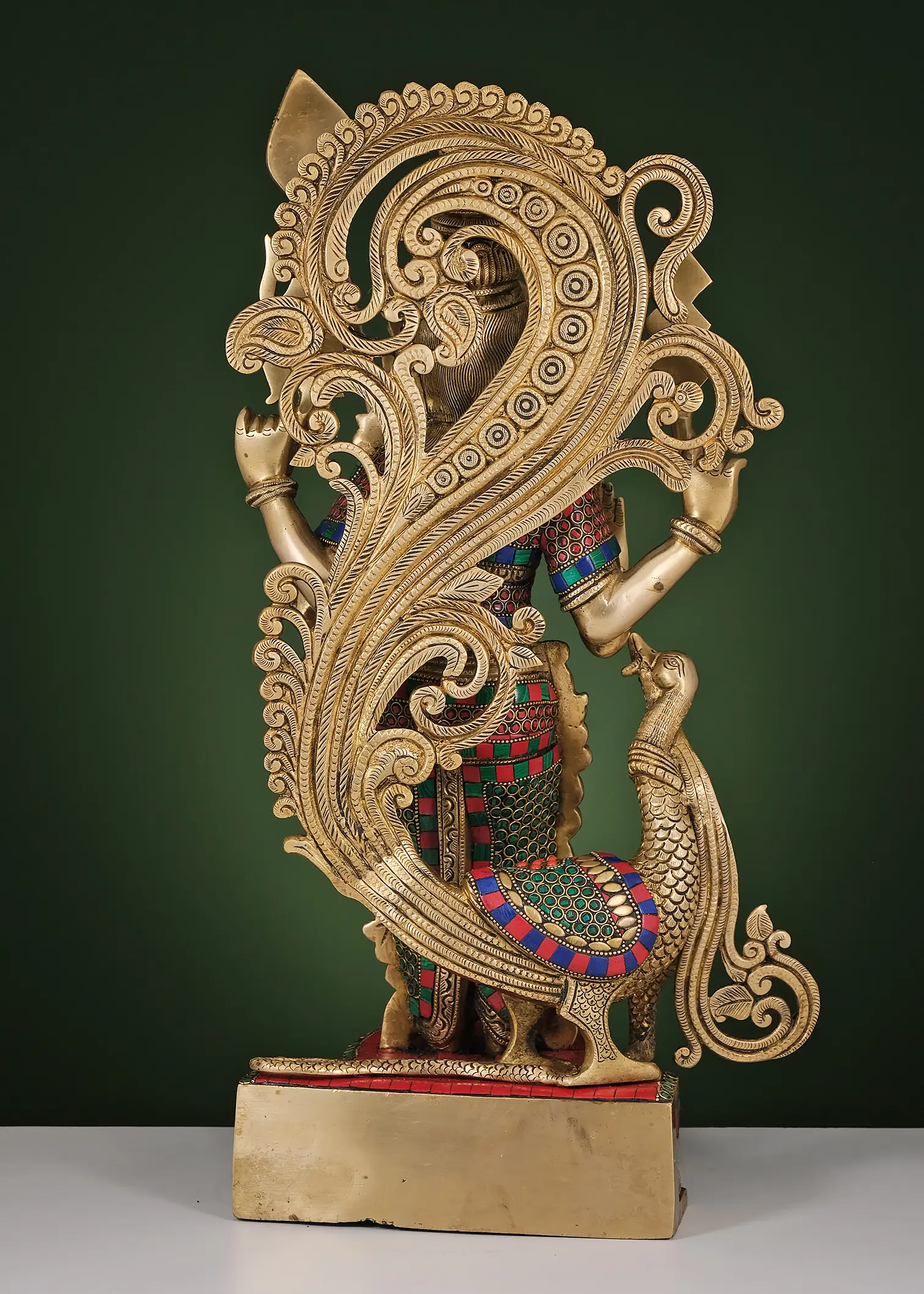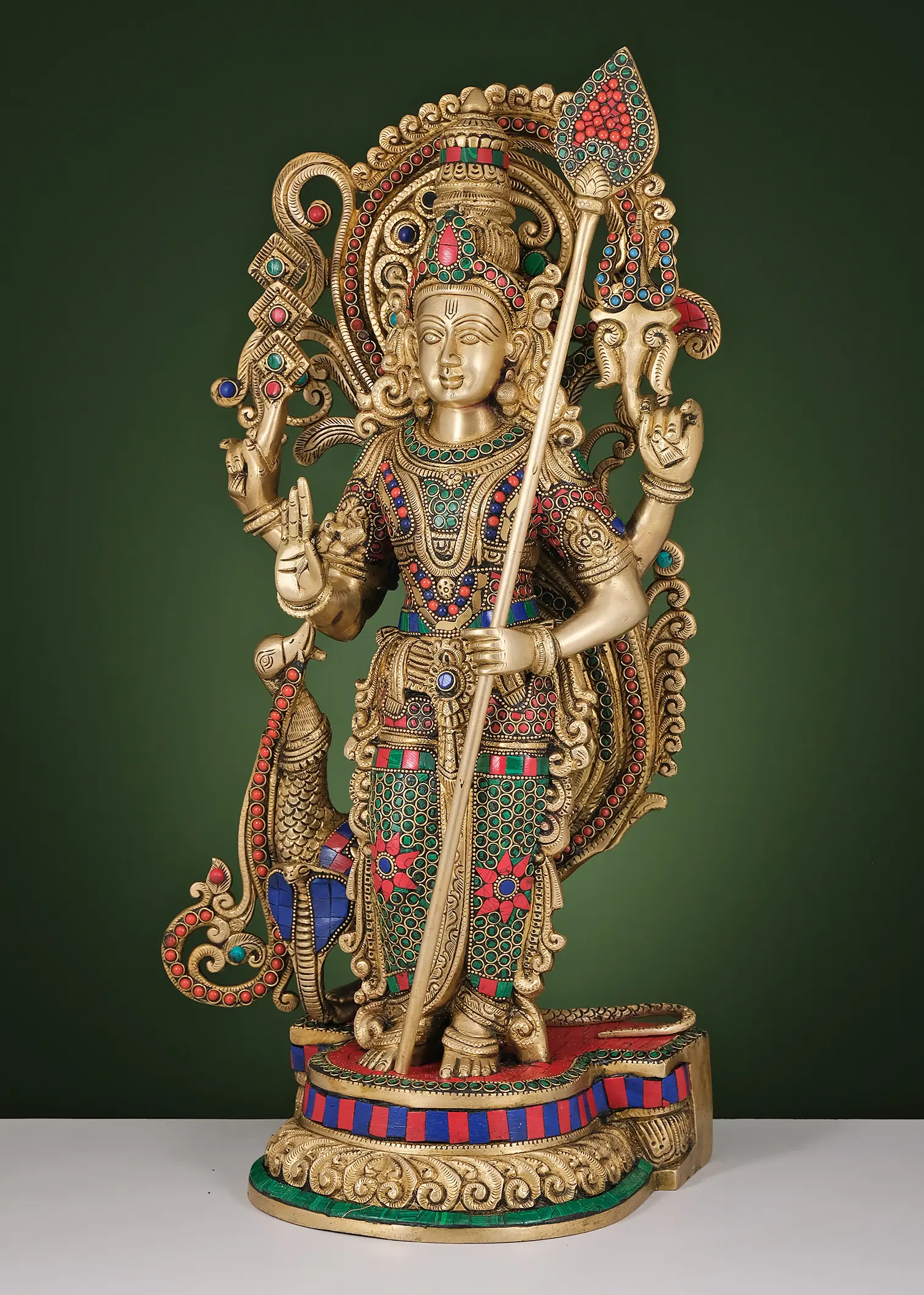 What truly elevates this statue is the stunning inlay work that adorns its surface. Vibrant, semi-precious stones are expertly set into the brass, creating a mesmerizing tapestry of colors. These inlays are not merely decorative; they are often imbued with symbolic meaning in Indian art, representing auspiciousness, vitality, and the cosmic energies. The interplay of the golden brass with the jewel-toned stones creates a visual spectacle that is both captivating and deeply spiritual. The presence of his divine vahana (mount), the peacock, at his side, further enhances the narrative. The peacock, with its resplendent plumage, is a symbol of beauty, pride, and immortality, perfectly complementing the divine stature of Karttikeya. The intricate rendering of the peacock, with its own decorative inlays, adds another layer of artistry and symbolic depth to the composition. The entire piece rests upon an ornate base, also adorned with colorful inlays and detailed carvings, grounding the divine figure with earthly artistry.