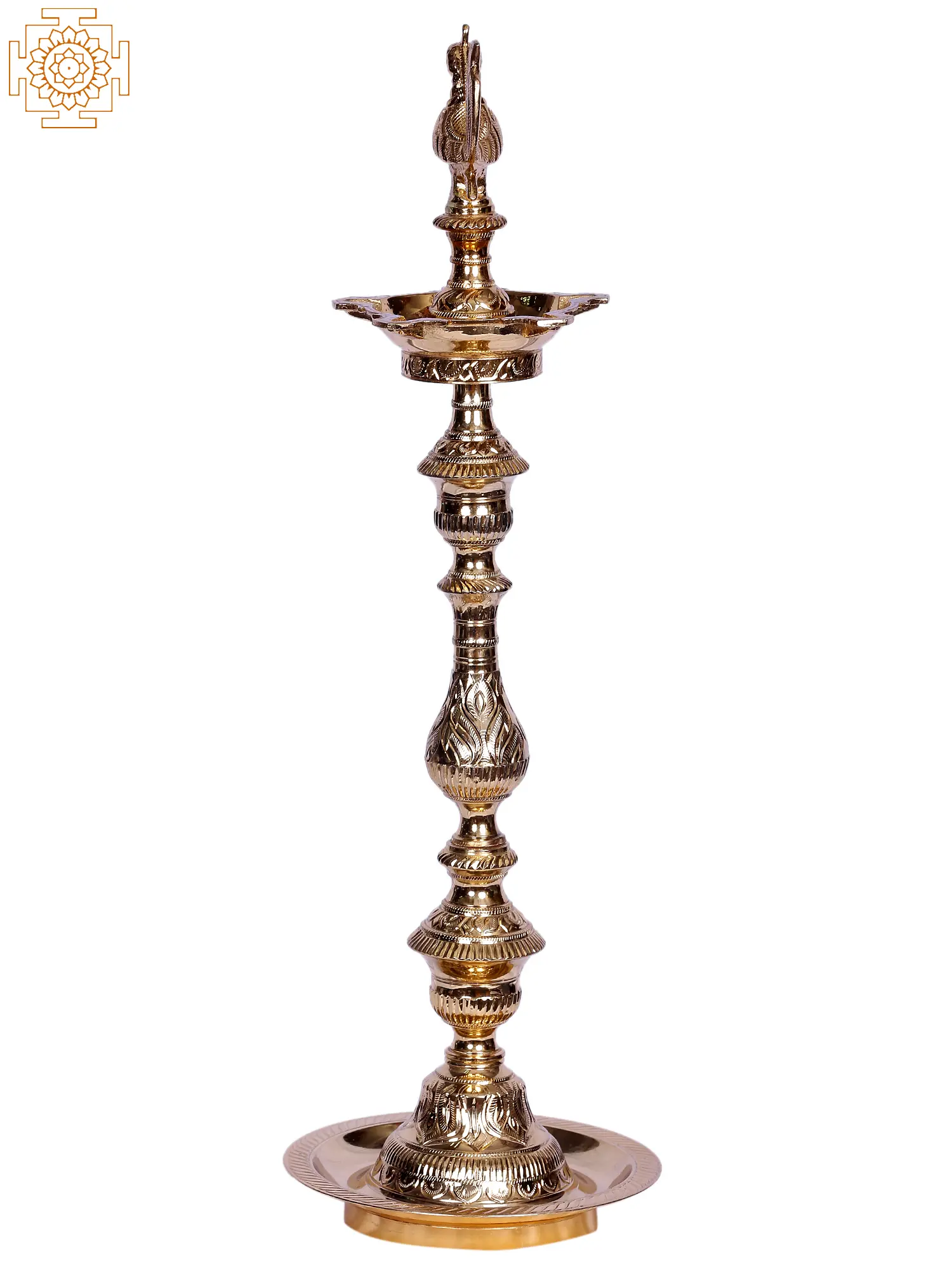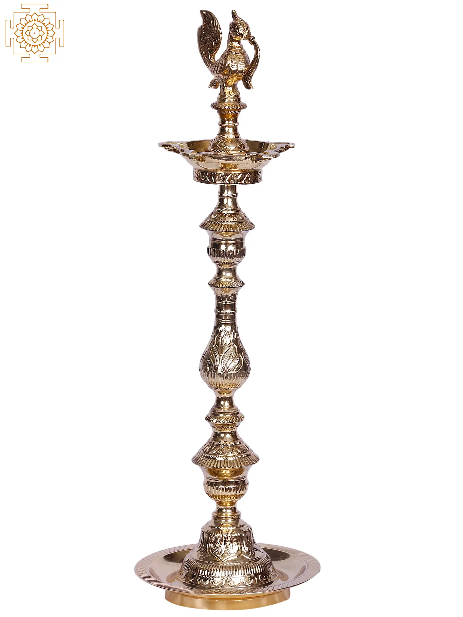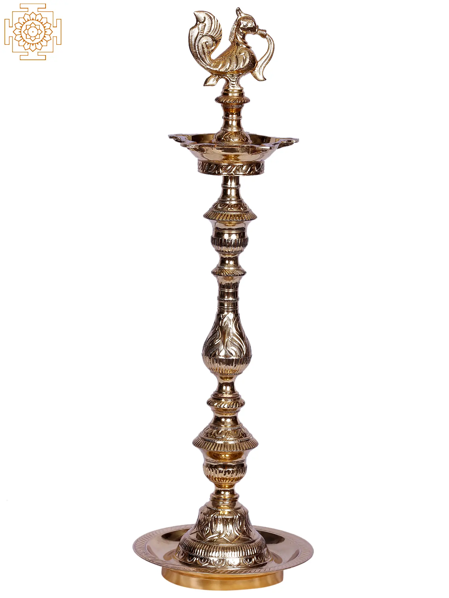 Lord Karttikeya (also known as Skanda or Muruga) rides a peacock named Paravani. As a conveyance, the bird is sometimes identified with Goddess Saraswati. In Kerala, the Nila Vilakku, or columnar lights with sacred peacock symbols atop, have a long history. This brass designer oil lamp features a center pattern of a regal peacock clutching a blooming branch in her beak; this is a symbol of riches and royal rank and is frequently favored by powerful families. There are complicated geometric forms such as a square and a ball at equal intervals. This lamp with five wicks to illuminate all directions, in addition to being an excellent choice for holiday decor, is capable of attracting the blessings of the deities when lit.