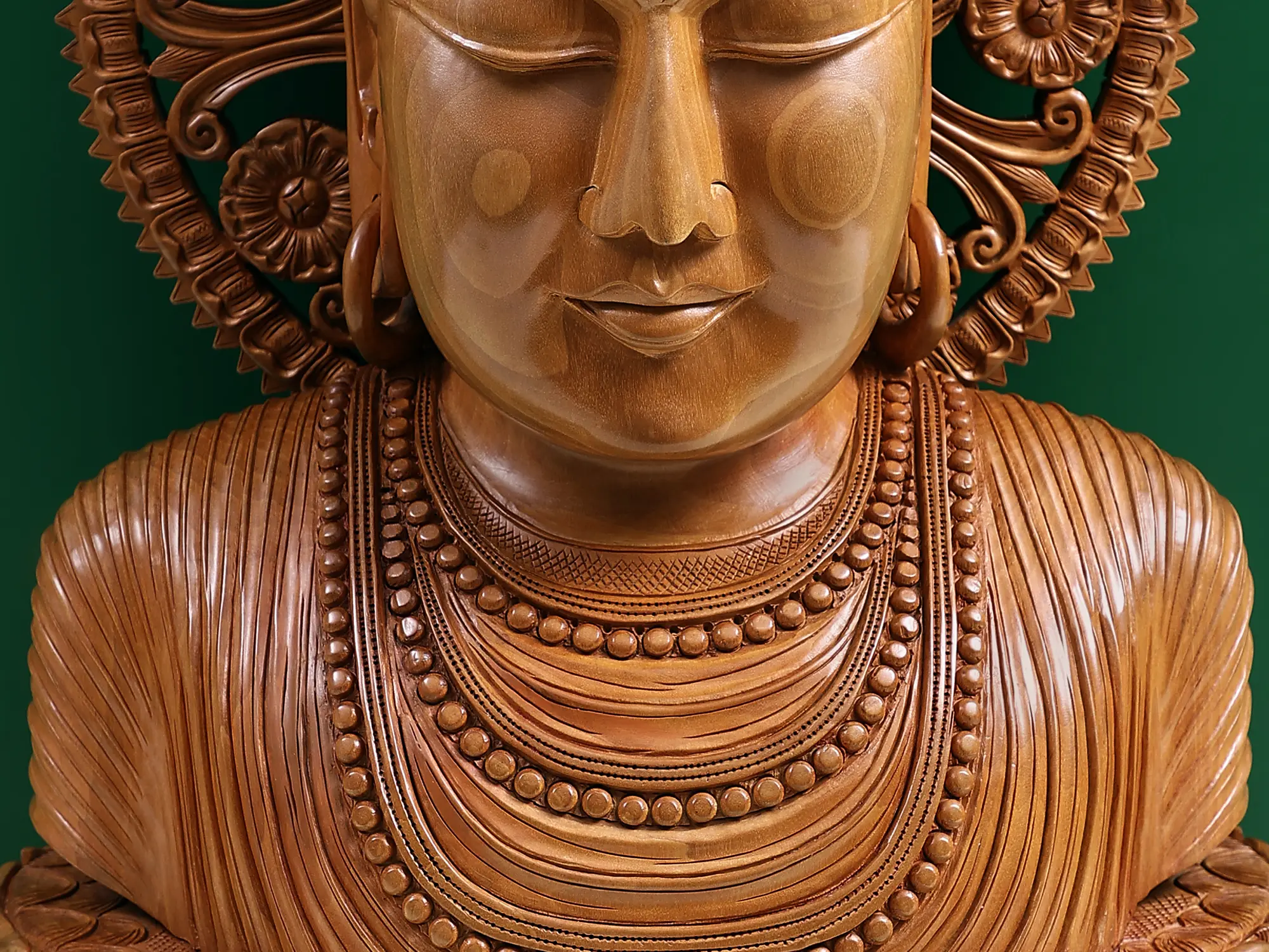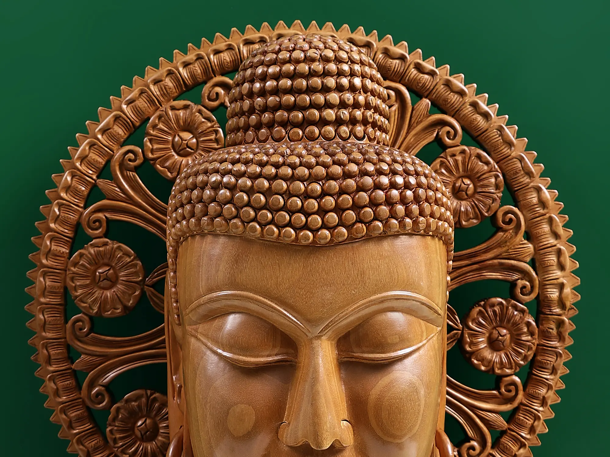 The finely detailed features of the Buddha bust, such as the elongated earlobes, serene expression, and ushnisha (cranial bump), embody the spiritual qualities of compassion, wisdom, and enlightenment. The smooth lines and serene expression evoke a sense of inner peace and harmony, inviting viewers to connect with the deeper teachings of Buddhism.