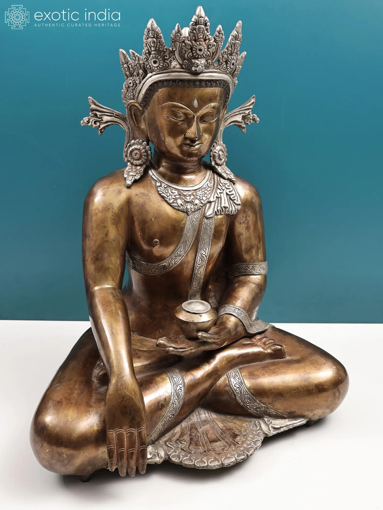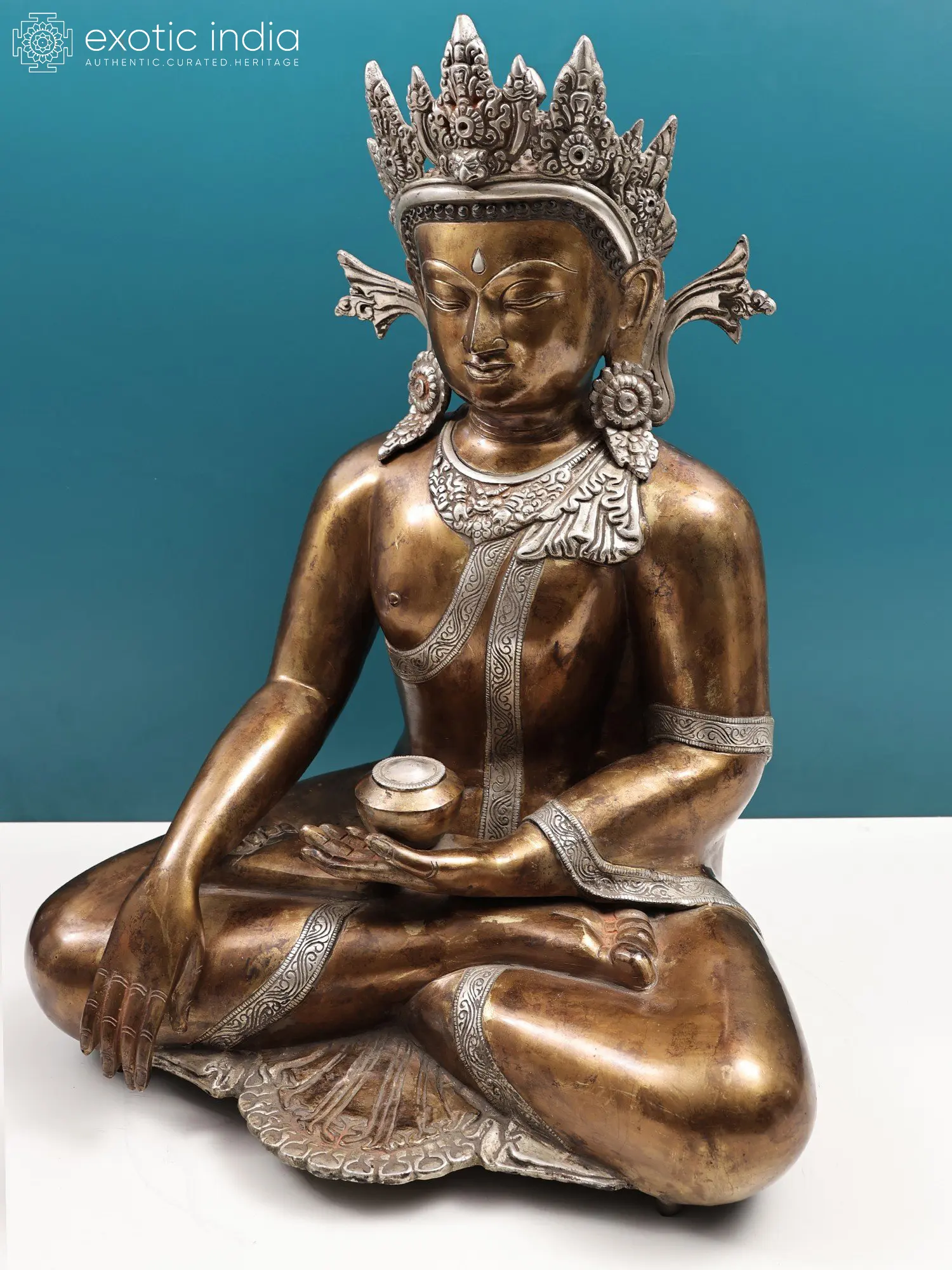 The magnificent statue of crowned Buddha in Bhumisparsha Mudra, with the enlightened right hand facing the earth and the left hand lying upright in his lap, is on display in exotic India. He is holding the alms bowl. The peaceful expression on his face is expertly caught and painstakingly engraved with great patience. The noticeable thing about the Buddha is his extraordinary crown is adorned with brass bead themes and decorations. Each intricacy of the crown's patterns is tackled with zeal. The Buddha’s clothes are gilded with silver and gold. The border of the robe is etched with floral and foliate designs that are particularly notable. The fortunate Urna mark in the Buddha's forehead symbolises the divine realm, or third eye, the ability to see beyond our mundane world of suffering and into the truth of enlightenment. Lord Buddha is seated in the lotus position, his feet neatly placed on opposite hips. Each detail was handled with great care and precision to offer peace and enjoyment to your surroundings.