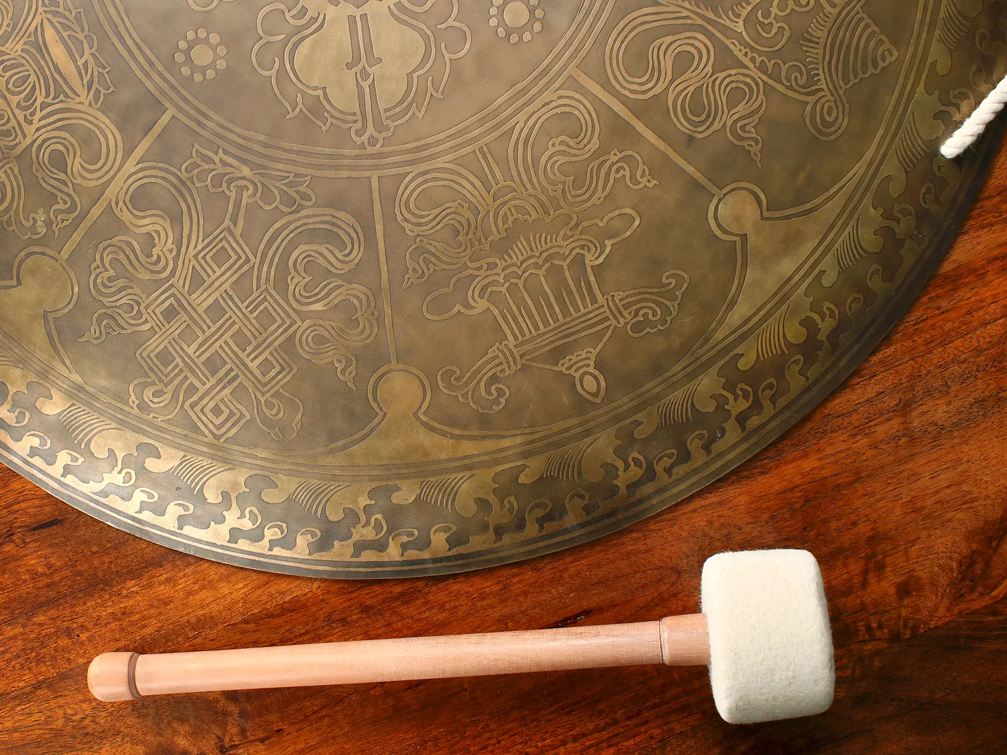 The eight good fortune emblems reflect the gods' contributions to Shakyamuni Buddha right after he acquired enlightenment. They are revered and carved on various ceremonial artifacts to boost their auspiciousness. This gong with a matt brown bronze finish and light engraving of the symbols in gold looks stunning and presents itself as an object blessed by the deities.