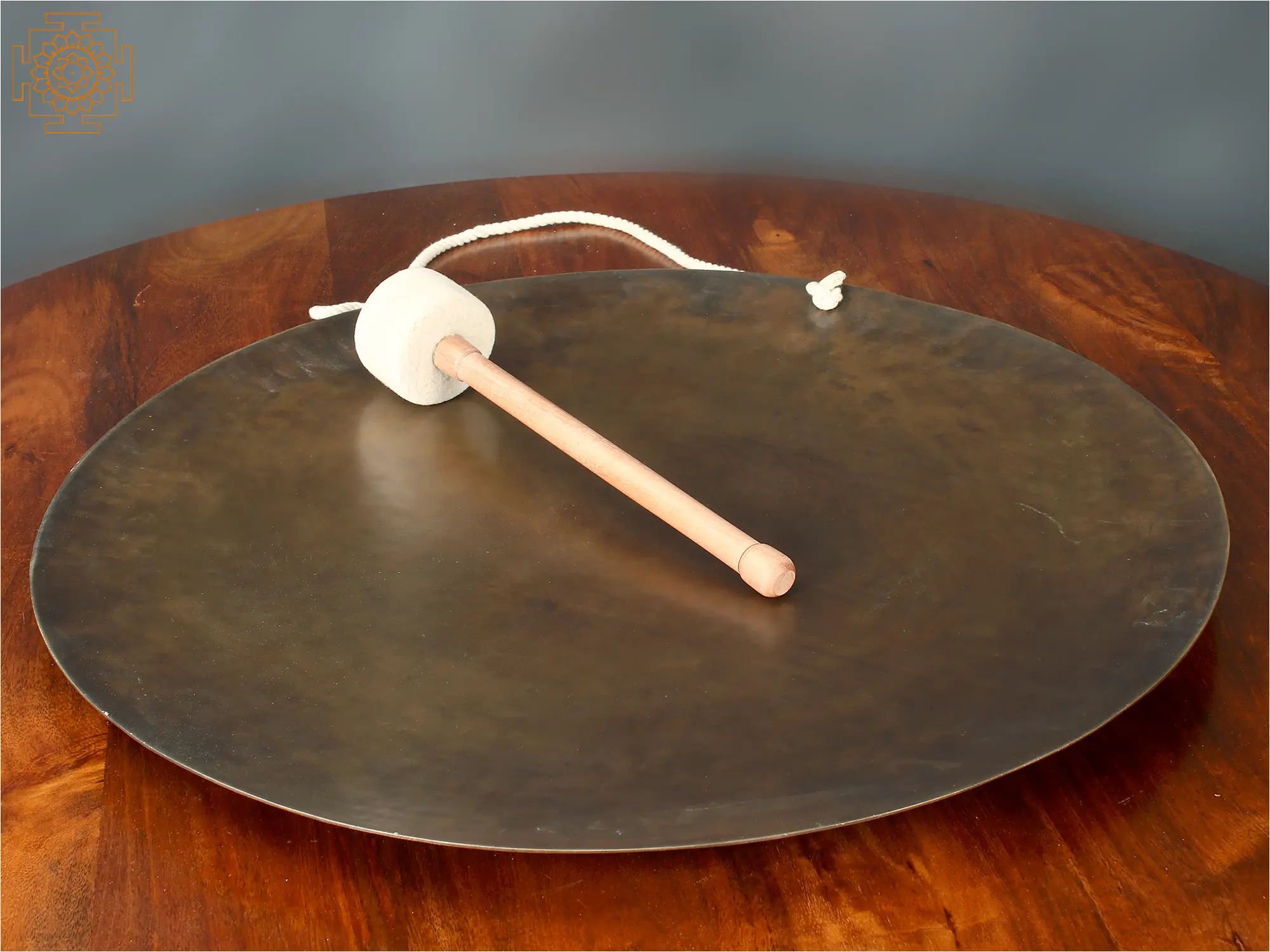 Gongs are musical instruments that cure our minds and bodies. It boasts a round tone with a powerful and resonant sound. These Gongs come in various shapes and sizes, with plain and curved surfaces and various mantras engraved. This Bronze Gong, with a circle of eight symbols on its face and two crossing vajras in the center, is a sacred musical instrument used in Tibetan Buddhist rites. The eight holy emblems, known as Ashtamangalas, represent good fortune. It comprises the Parasol, Golden Fishes, Treasure Vase, Lotus, Right-Turning Conch Shell, Glorious Endless Knot, Victory Sign, and Time Wheel.