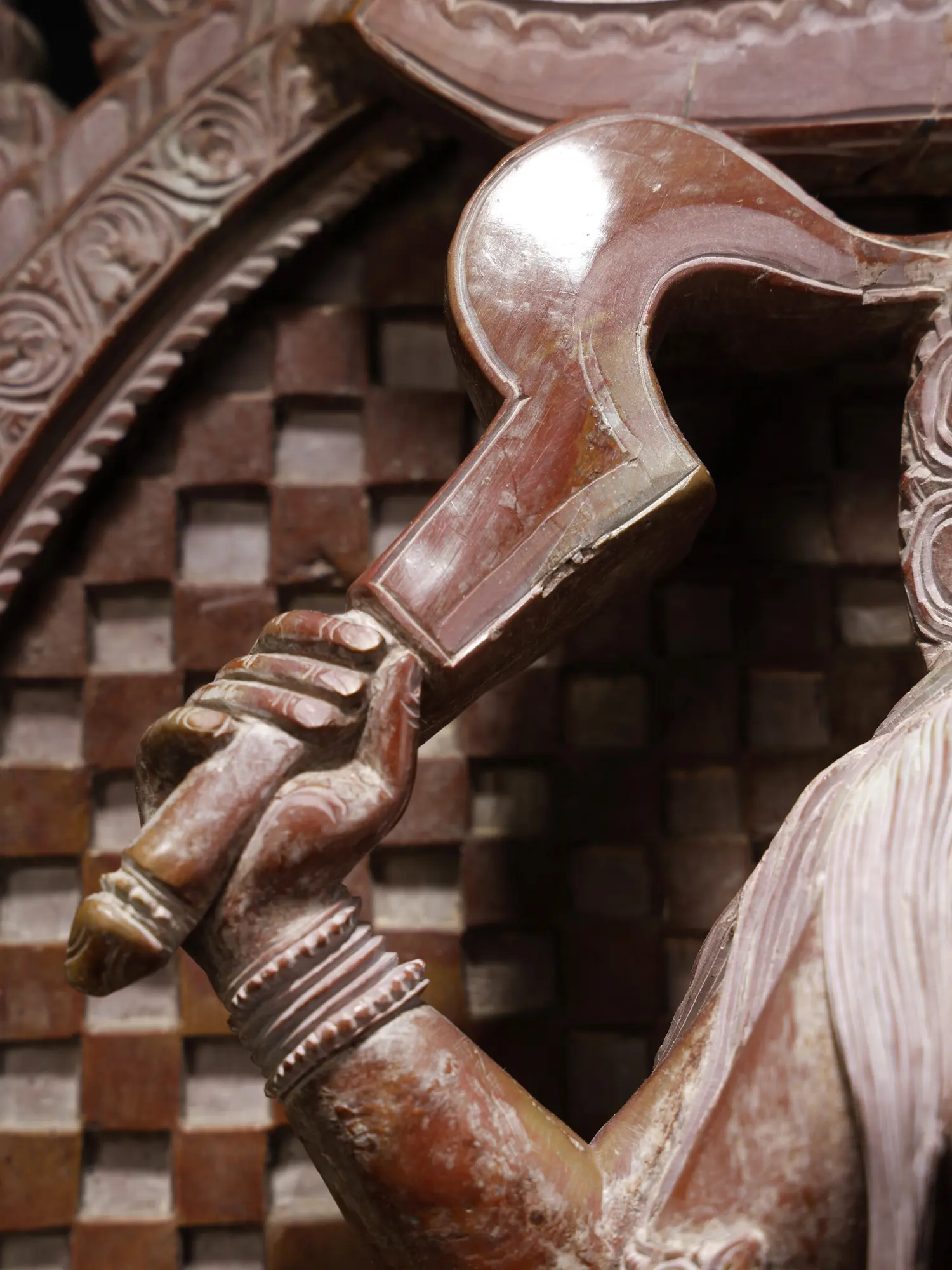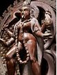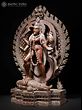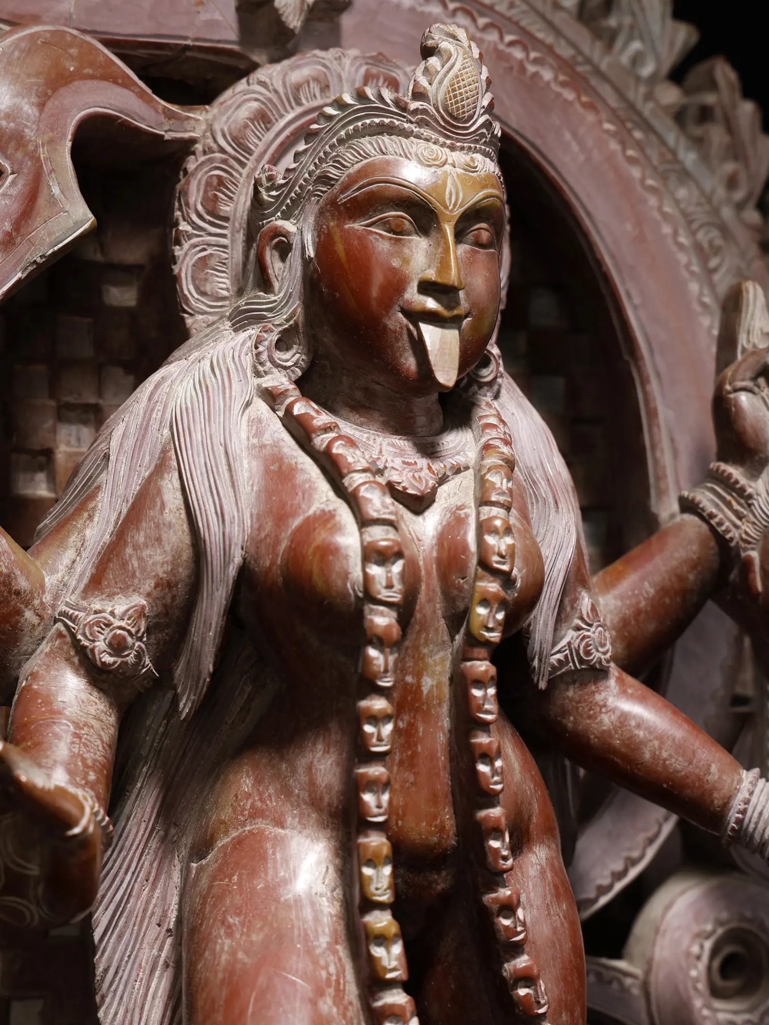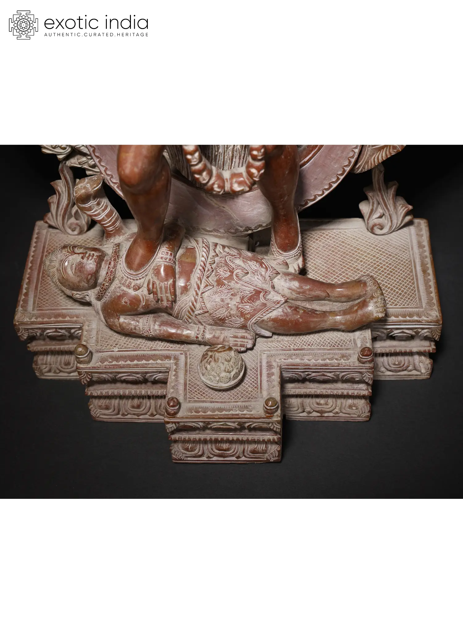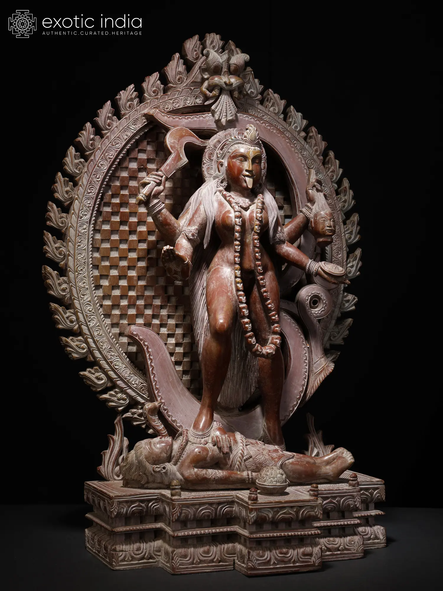 This magnificent statue depicts Goddess Kali standing upon Lord Shiva, adorned upon the sacred Kirtimukha (the face of glory), representing positive transformation. This statue, carved from pink stone, opens the door to deep insight and spiritual elevation.