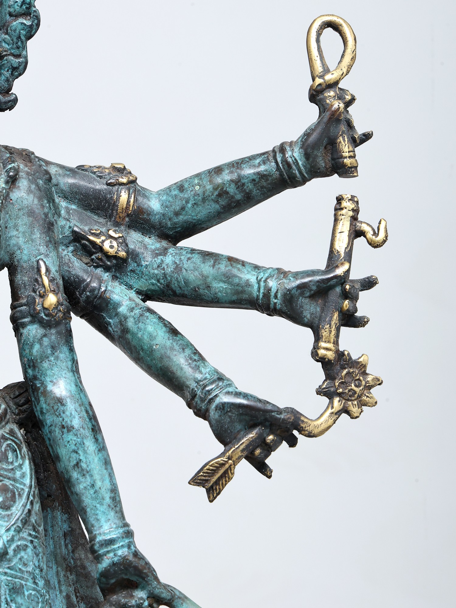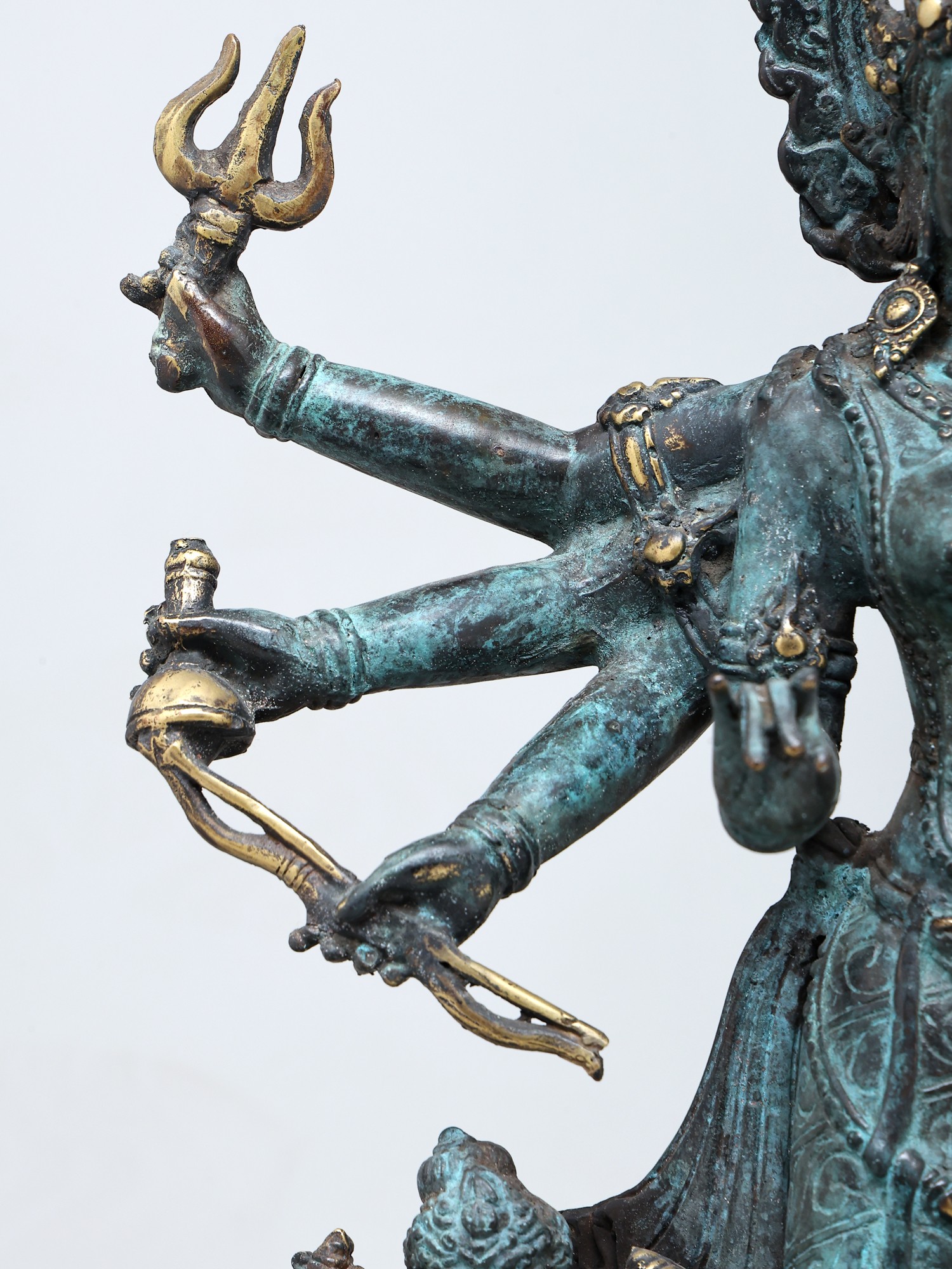 This magnificent brass statue captures a pivotal moment in Hindu mythology: the divine transformation of Goddess Parvati into the formidable Goddess Durga. Known for her gentle and nurturing aspect as Parvati, the consort of Lord Shiva, she also embodies the fierce protector of the cosmos, the invincible Durga. This artwork masterfully portrays the power and grace inherent in this dual nature. The goddess stands triumphantly, her multiple arms radiating an aura of divine authority, each hand holding a symbolic weapon or implement, ready to vanquish evil and restore cosmic balance.