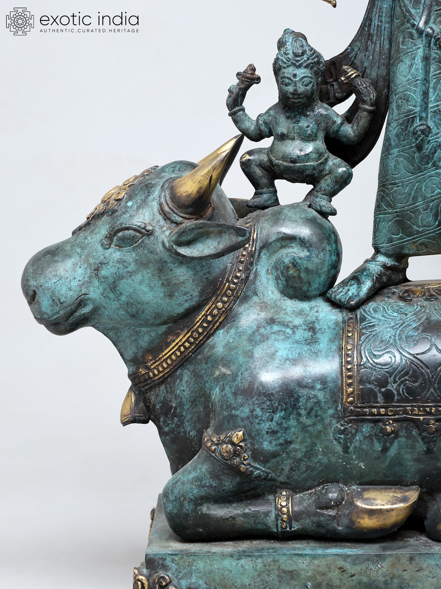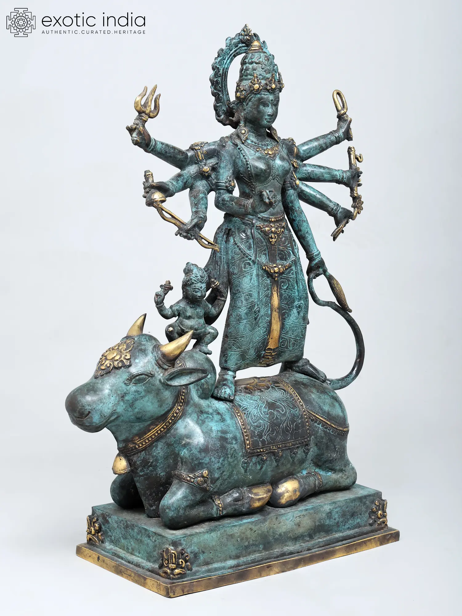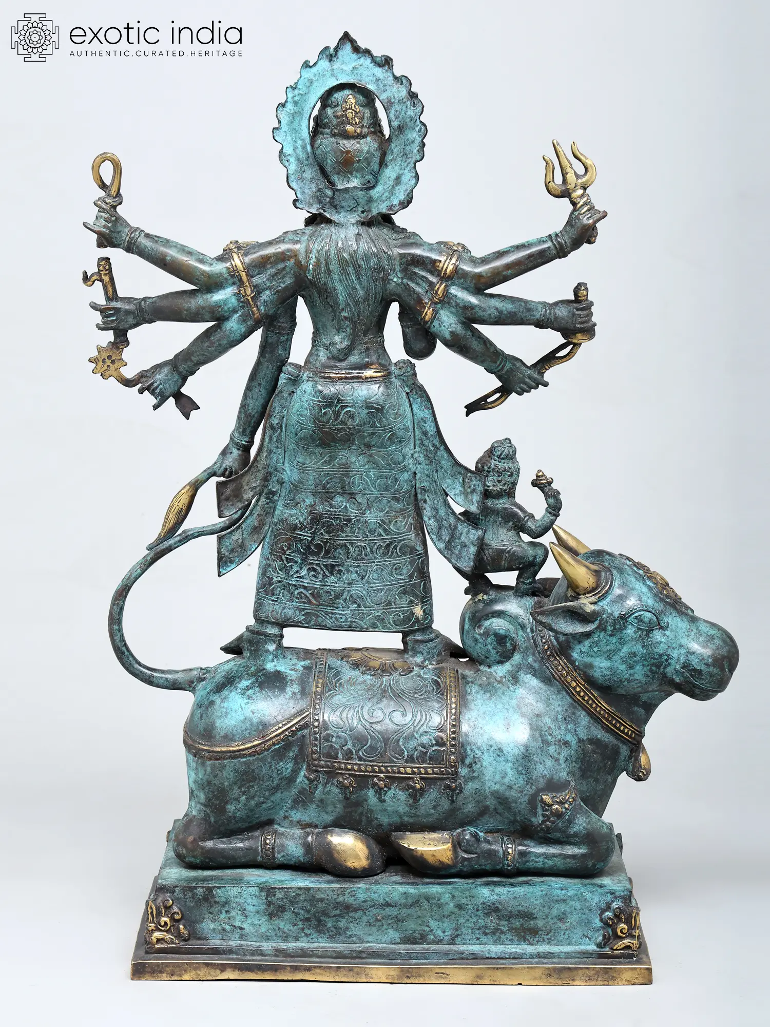 13" Goddess Bathari Durga with Bhairava Standing on Nandi In Brass | Handmade | Balinese Brass Statue