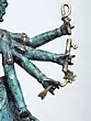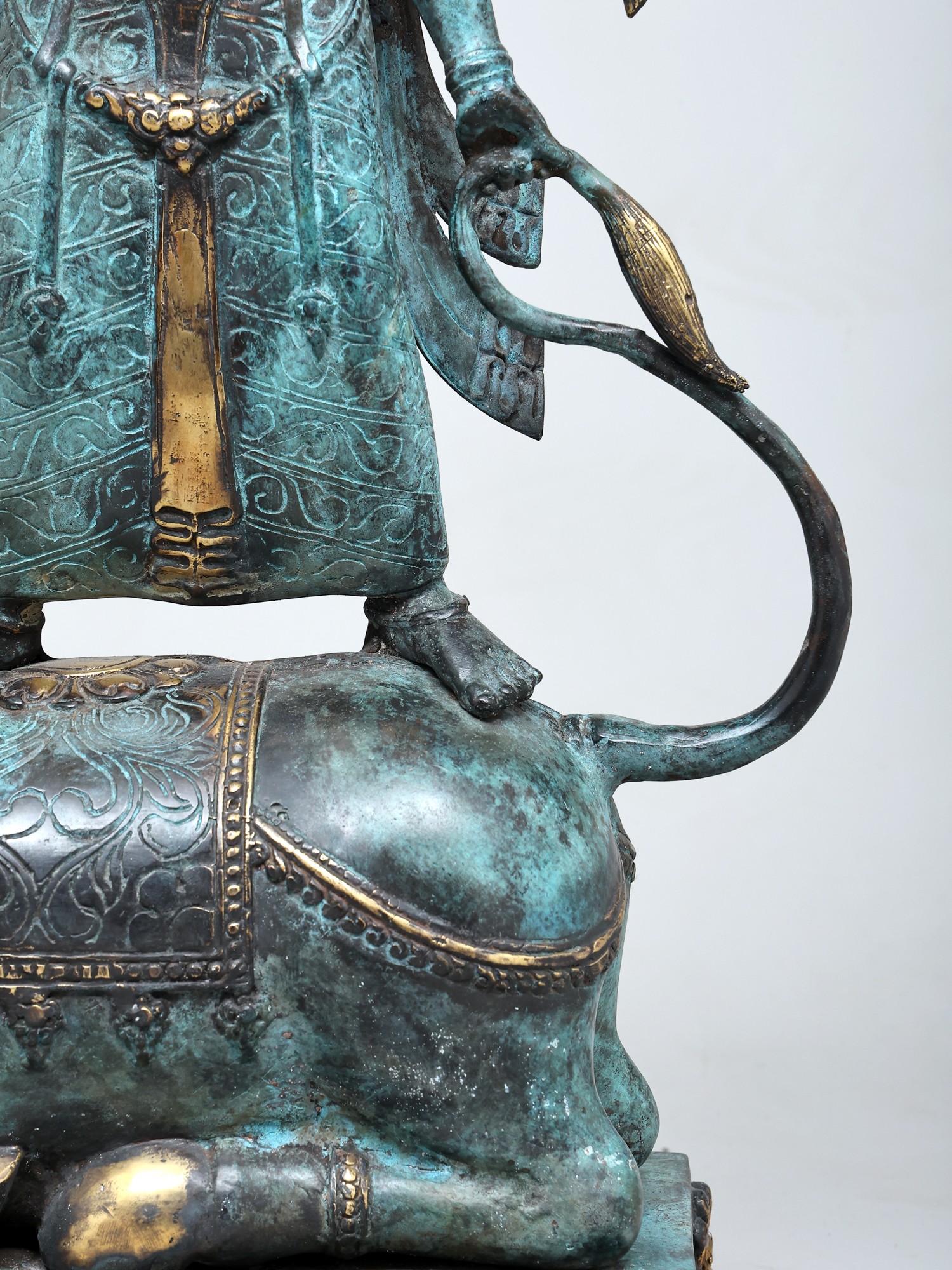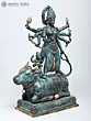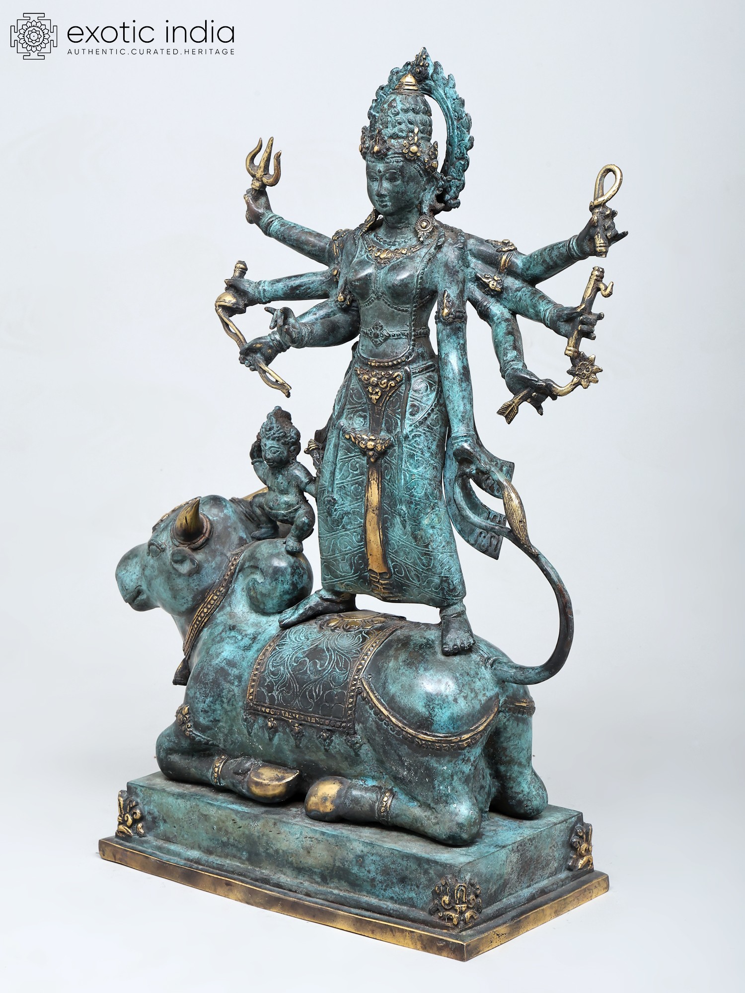 Crafted using the ancient and revered lost wax method of brass casting, this statue is a testament to exceptional artistry and dedication. This intricate technique allows for unparalleled detail and a fluid, organic form. The patina, a rich blend of verdigris and warm golden hues, accentuates the musculature and divine adornments of the goddess and her mount. The fine detailing on her garments, the delicate jewelry, and the fierce yet benevolent expression on her face speak to the skill of the artisan. The dynamic composition, with the goddess poised above the bull and wielding her celestial arsenal, creates a powerful visual narrative that commands reverence and awe. This piece is more than just a statue; it is a conduit to the divine, a symbol of protection, strength, and the eternal feminine power that permeates the universe.