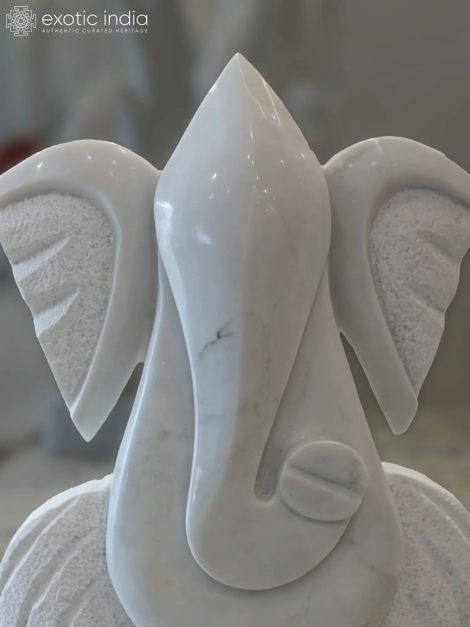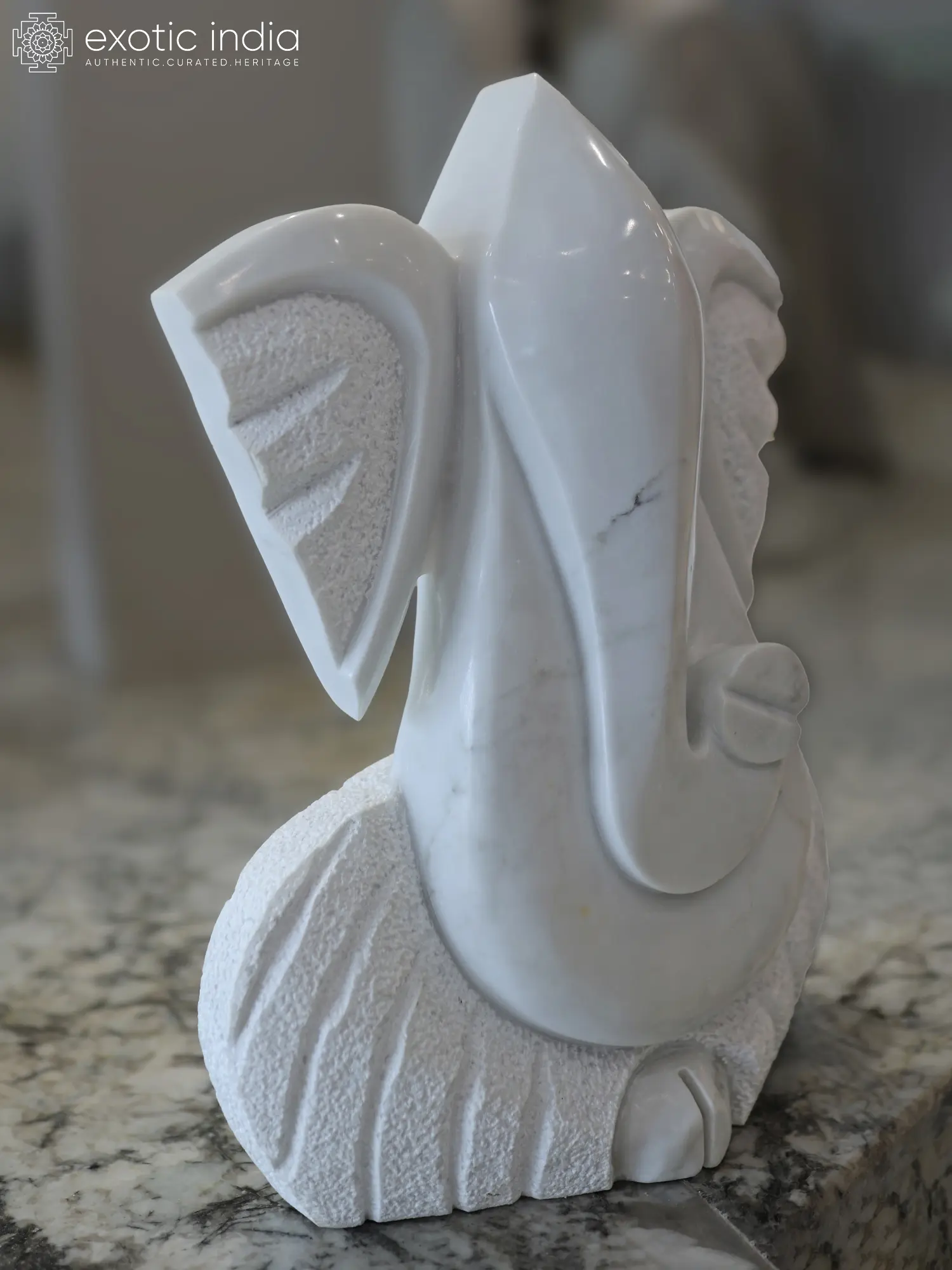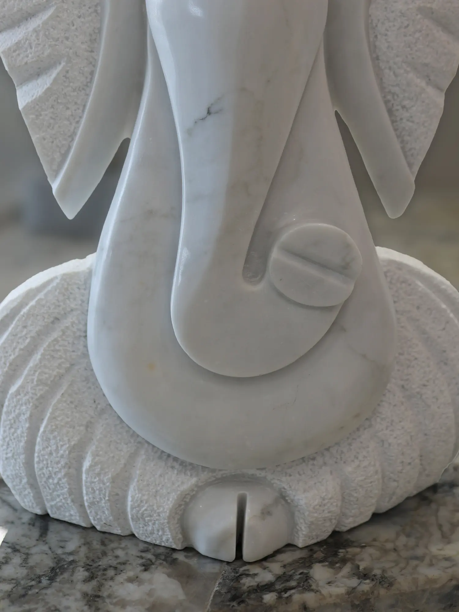 Lord Ganesha, the elephant-headed deity, is one of the most beloved gods in the Hindu pantheon. His image is invoked before any new endeavor, from starting a business to embarking on a journey, ensuring success and prosperity. Tales abound of Ganesha's wisdom and wit. One famous legend recounts how he won the race around the world against his elder brother Kartikeya by simply circling his parents, Shiva and Parvati, demonstrating that the entire universe resides within them. This sculpture embodies that profound understanding, radiating a sense of calm strength and unwavering resolve. The choice of white marble further amplifies this serenity, lending the piece an almost celestial quality. ––––––––––