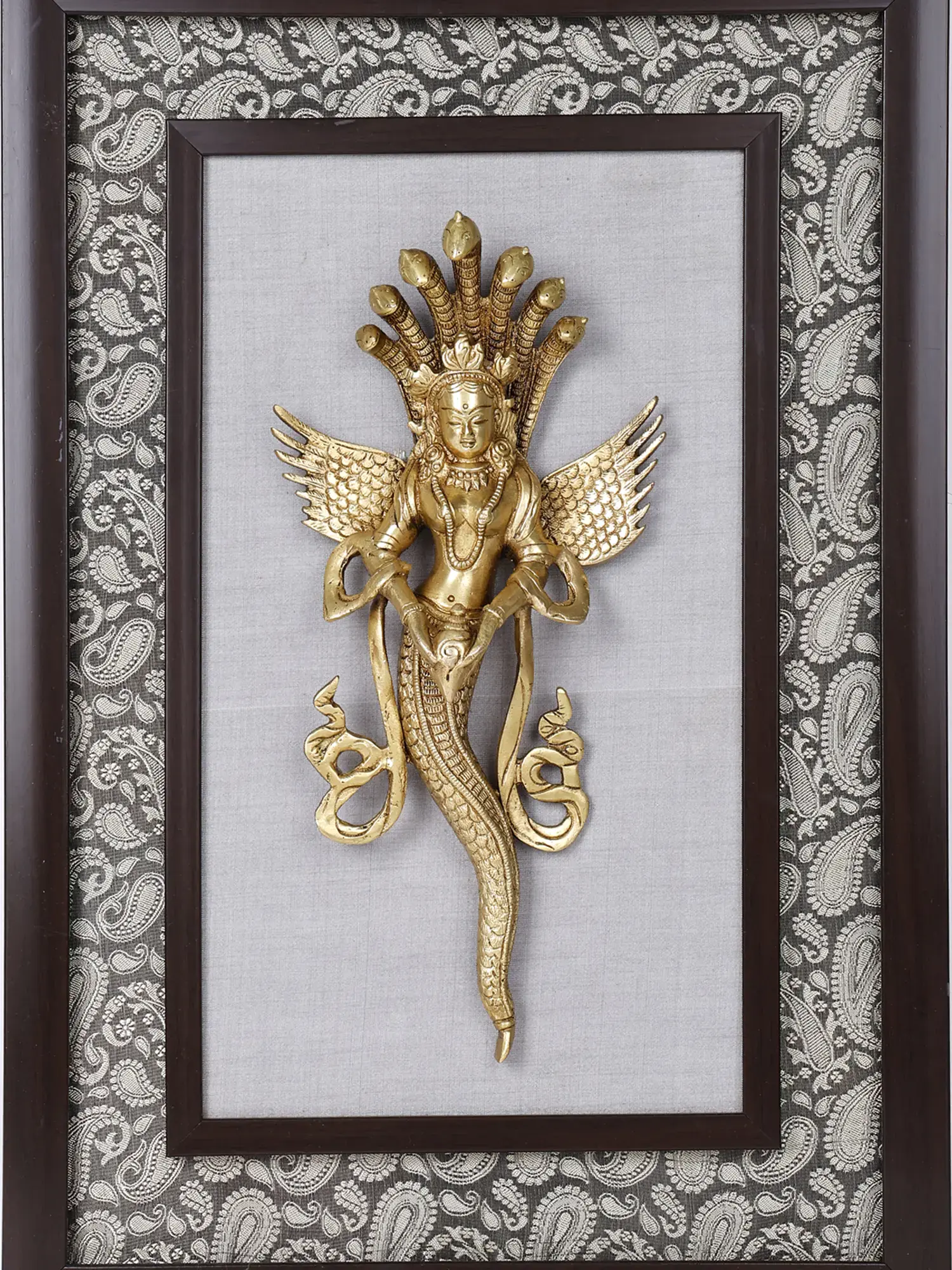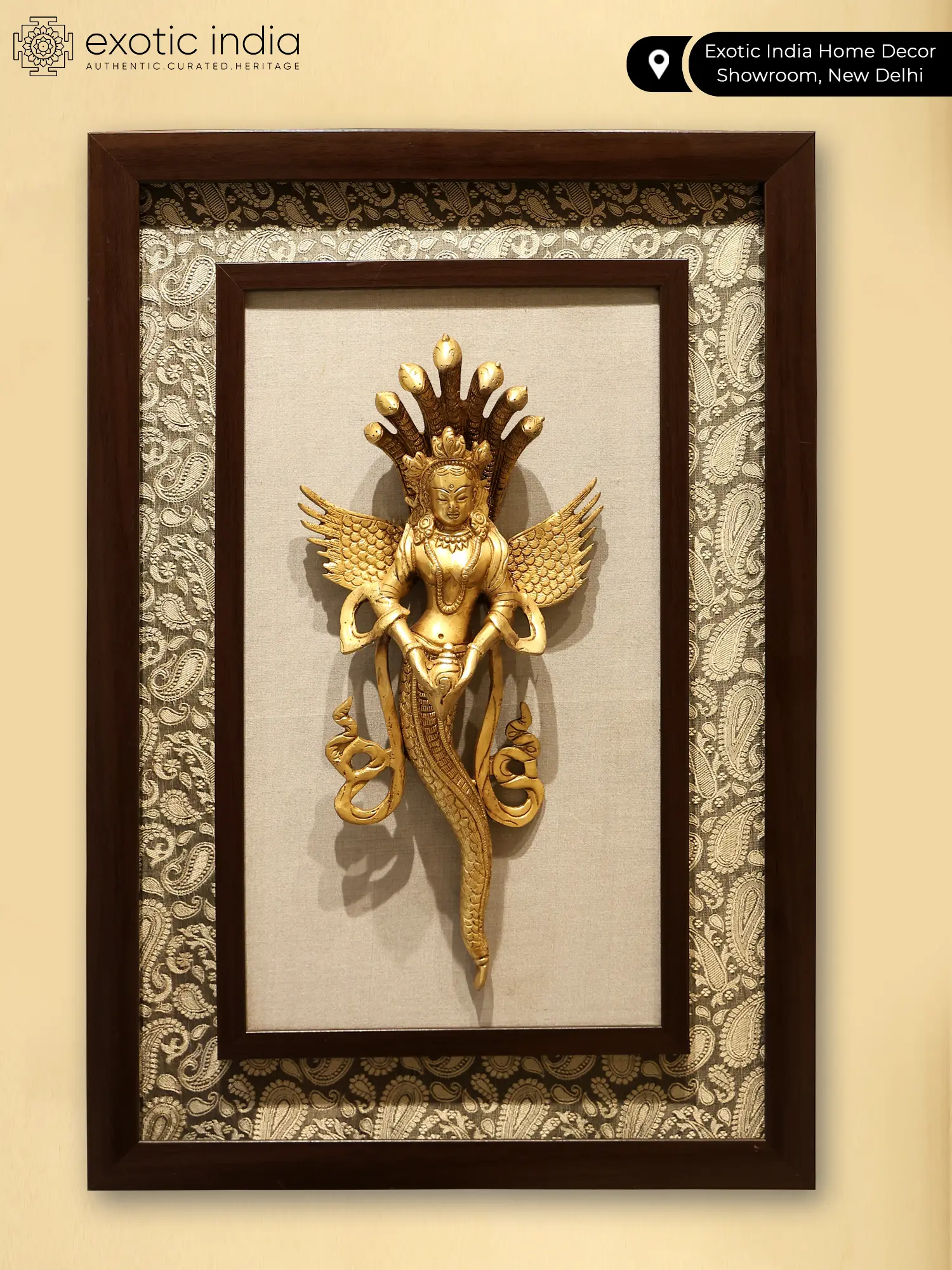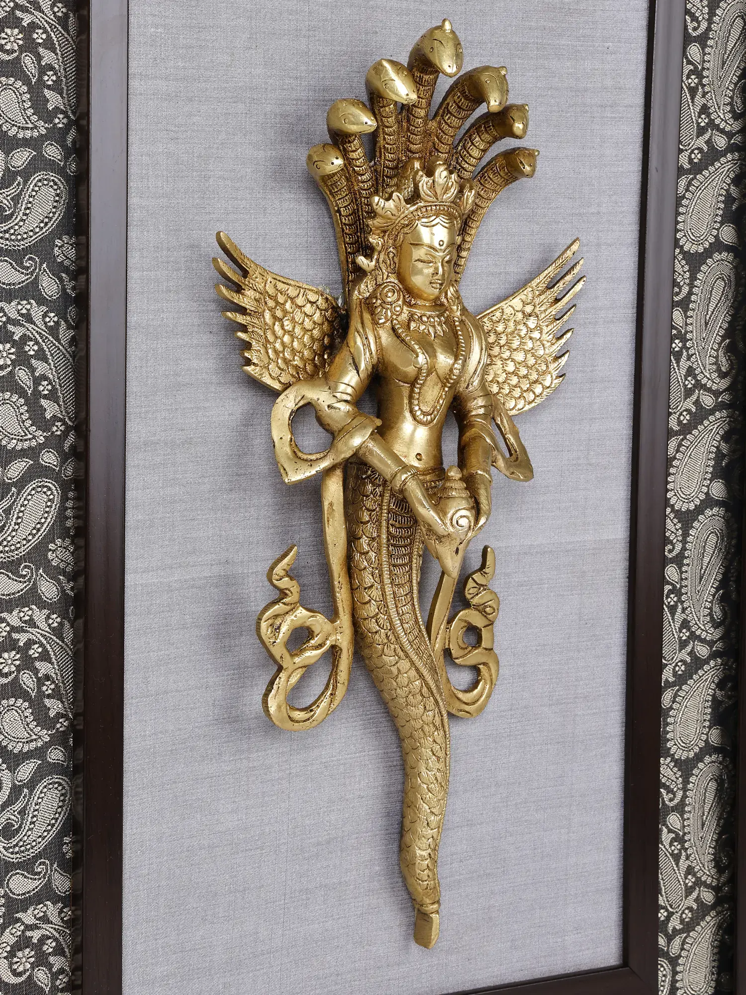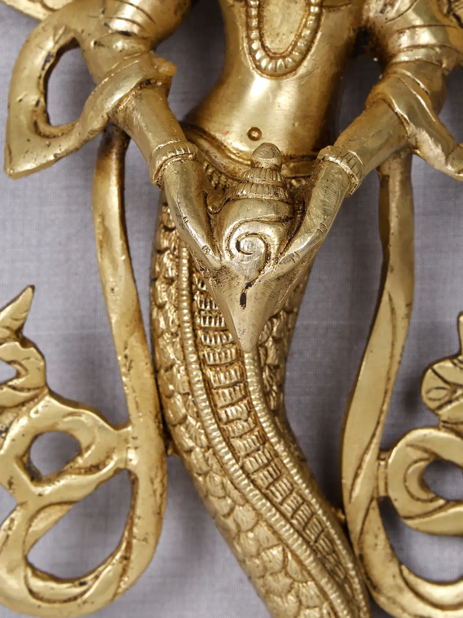 Holding a conch (symbol of wealth and auspiciousness), the Naga Kanya in this wall hanging is a feminine and gracefully sculpted icon.