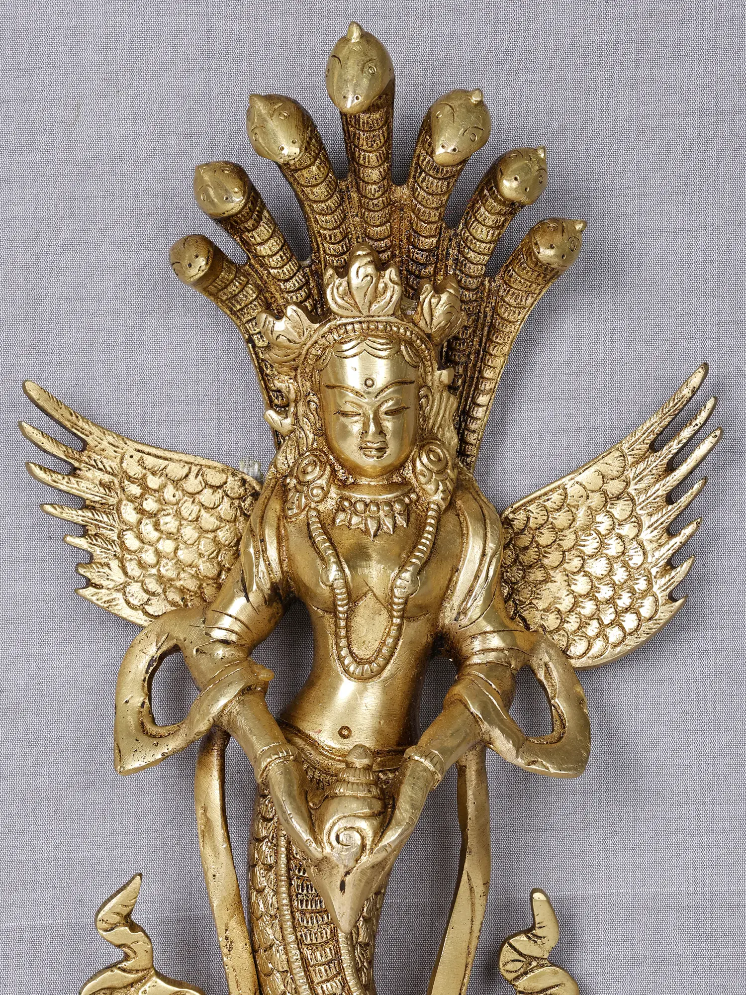 Presented with Tibetan iconography, the Naga Kanya has wings to highlight her divine powers, adorned with a seven-hooded serpent crown, and fluttering garments.