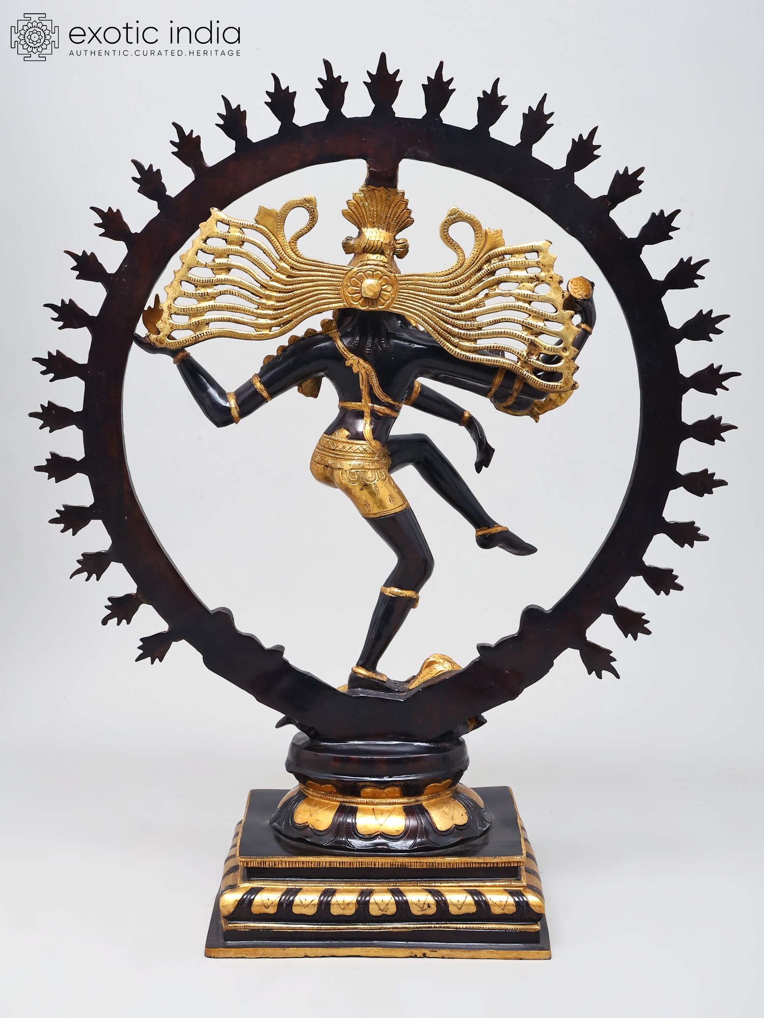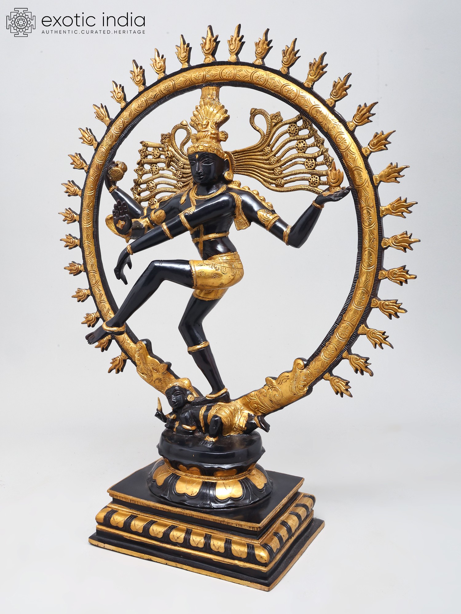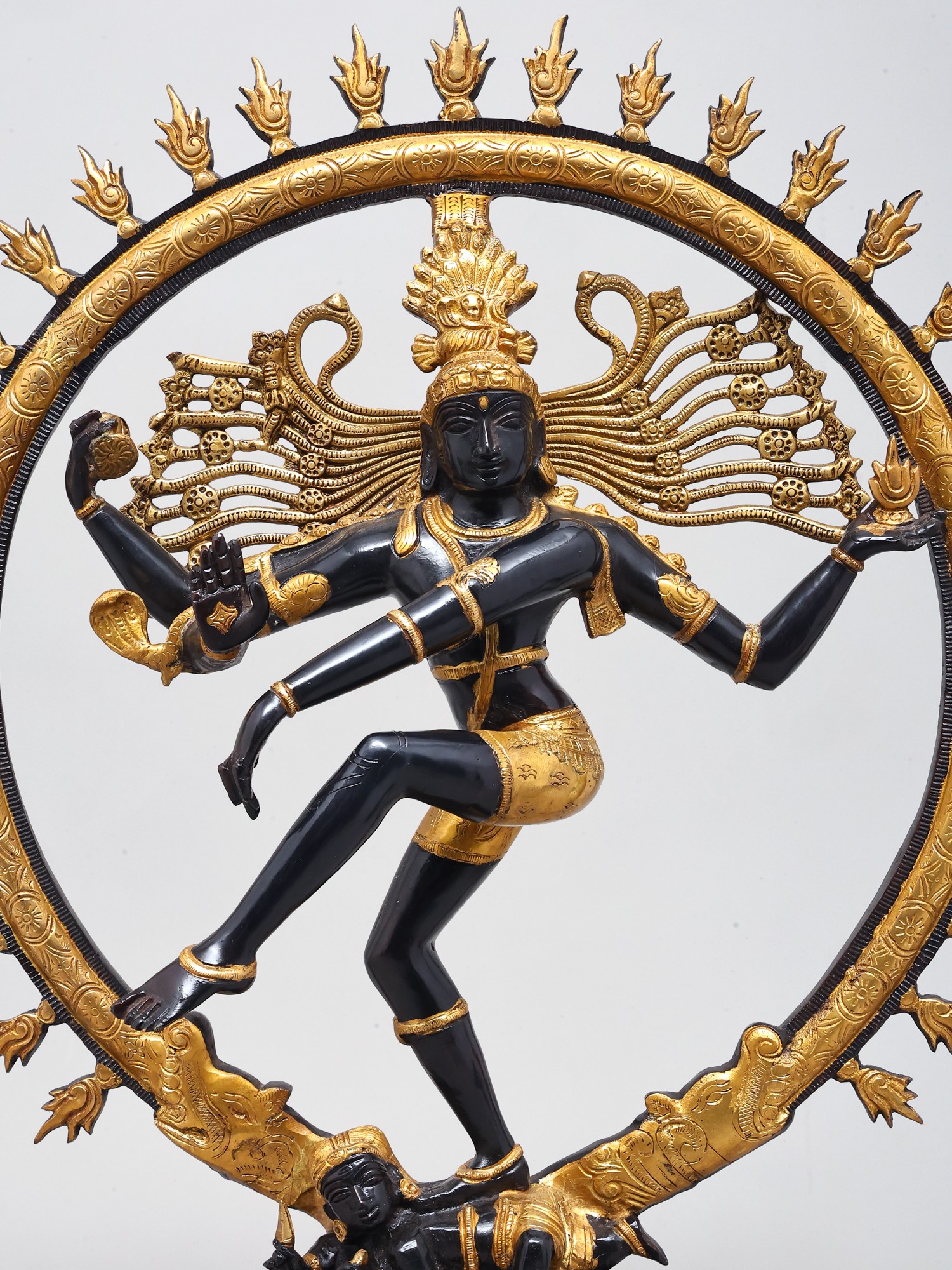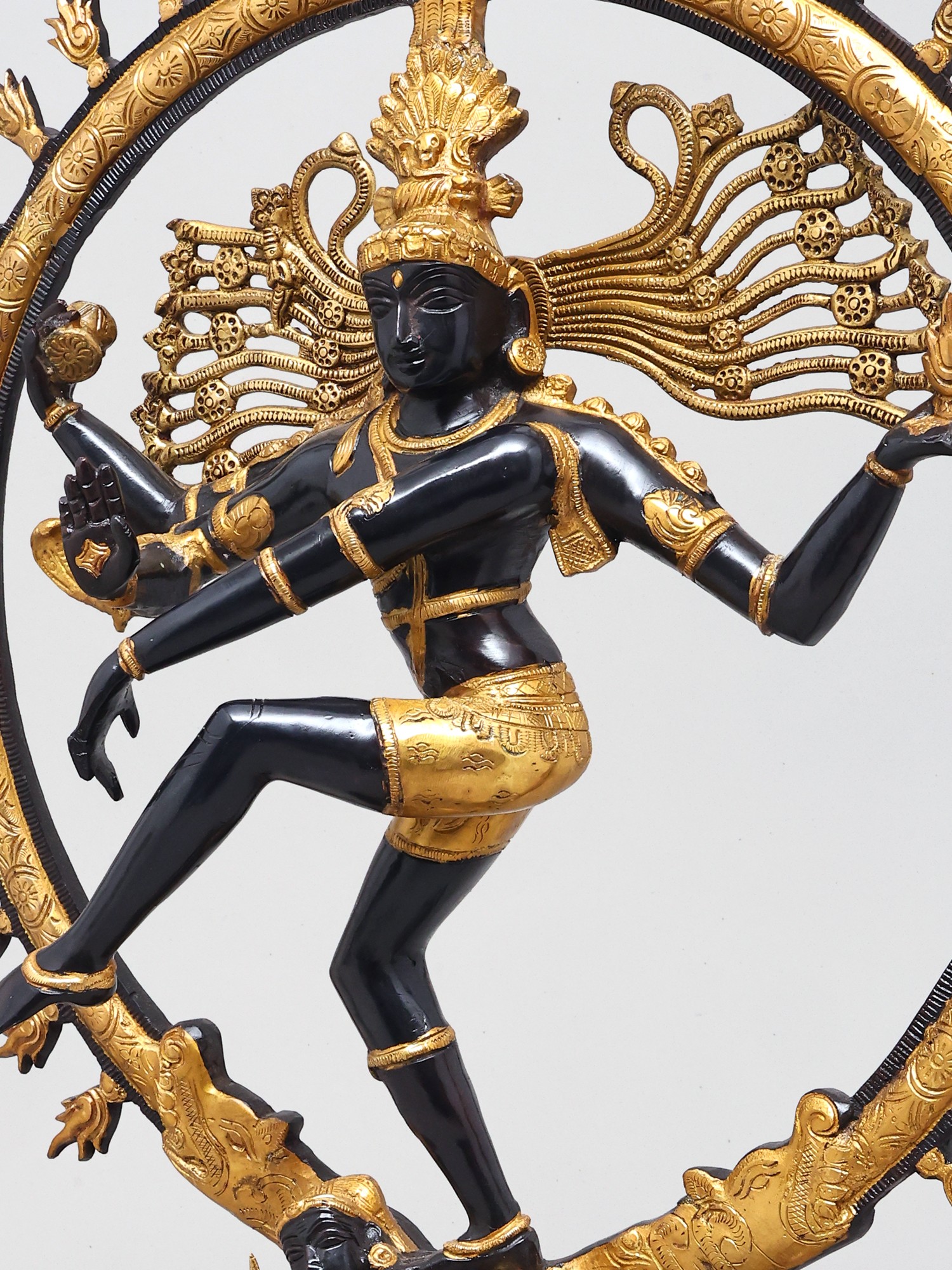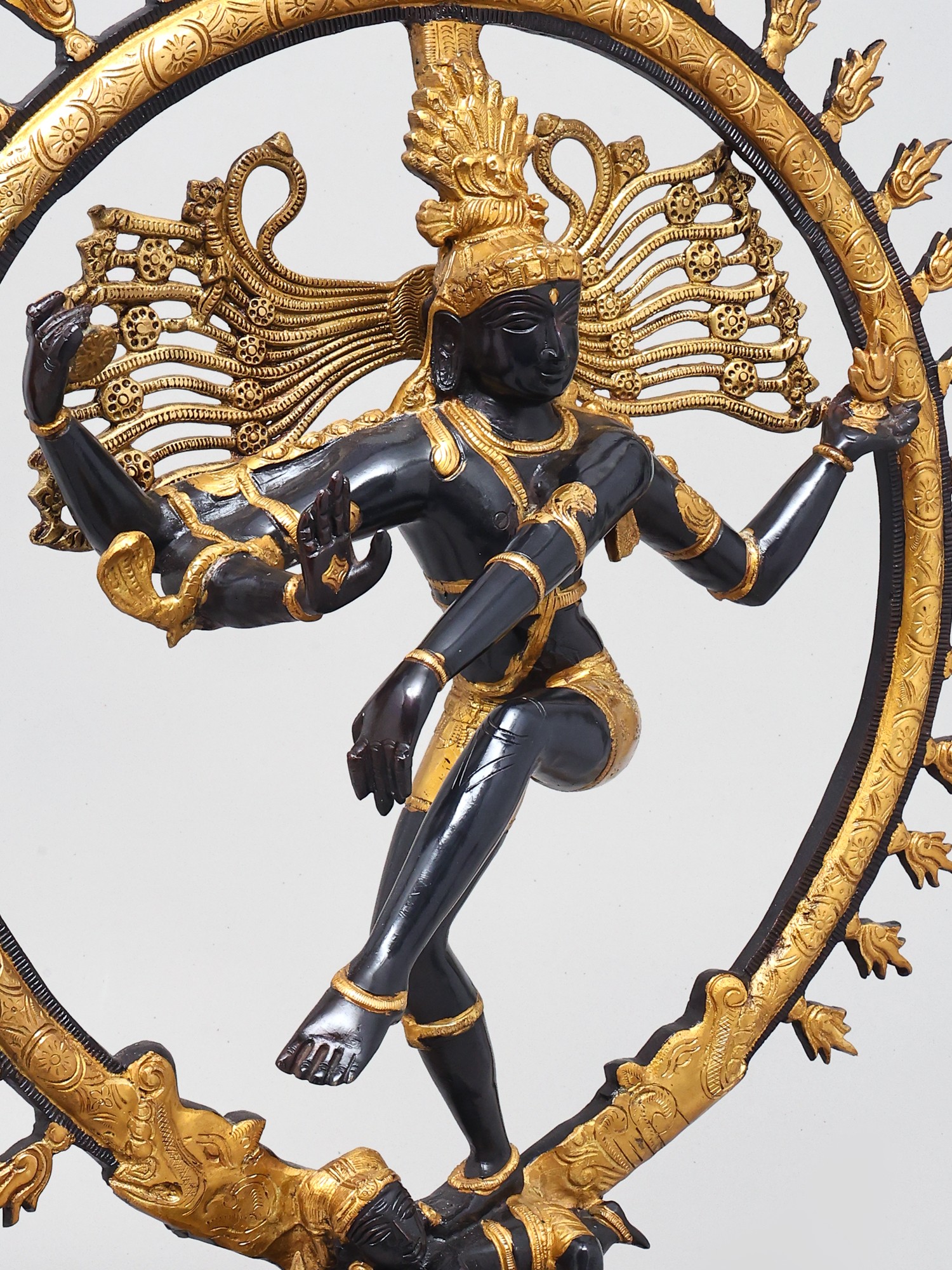 The long, lithe dancing physique of the Lord is contained within a life-sized ring of flames. It emerges from the mouths of the twin mythical creatures conjoined to the lotus-shaped plinth. The complexion of the body of Nataraja is in two metallic variations: a deep, glistening black and a textured gold colour. Each of them are strategically superimposed with silver which makes for the bitone.