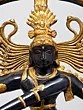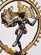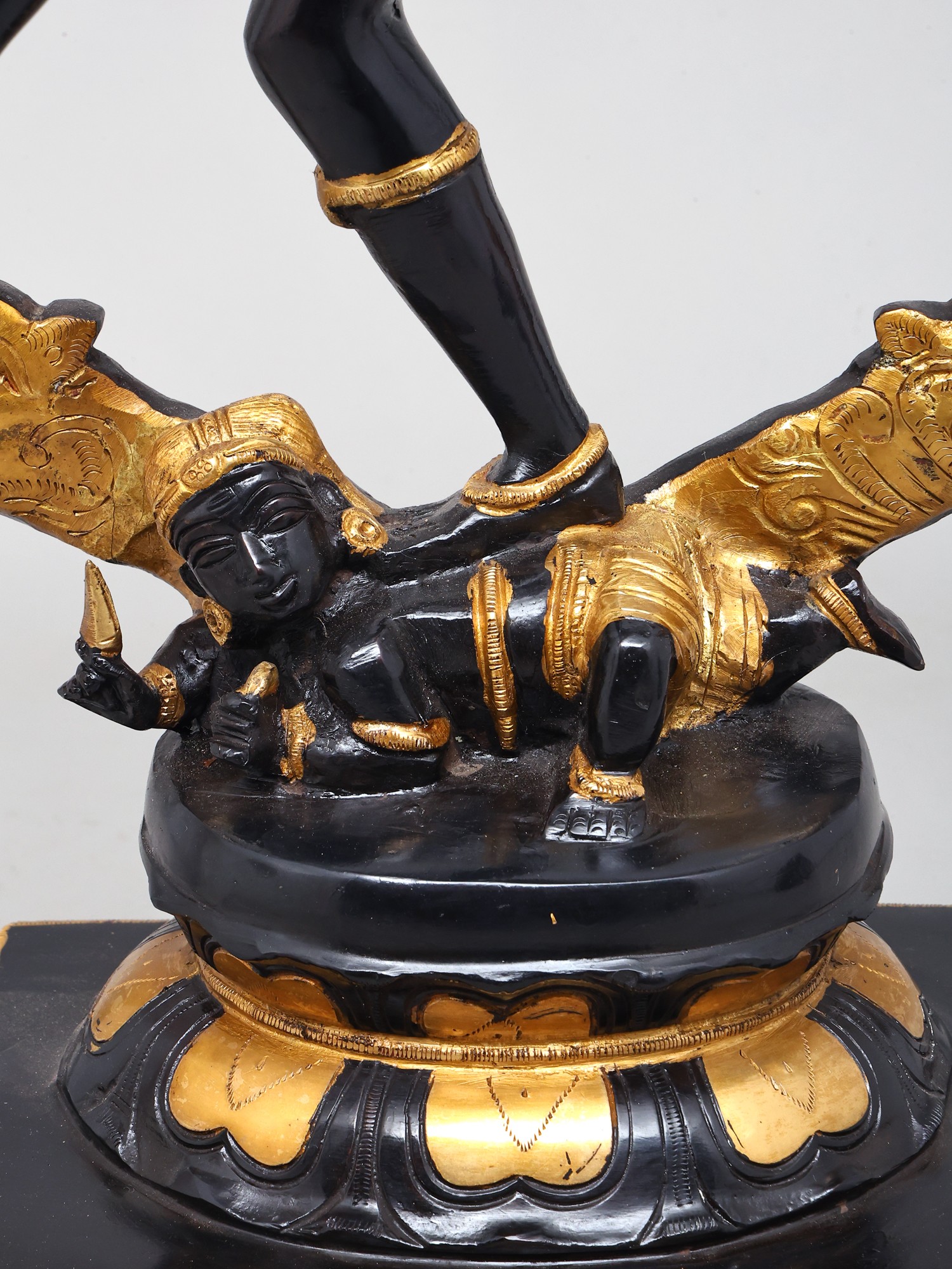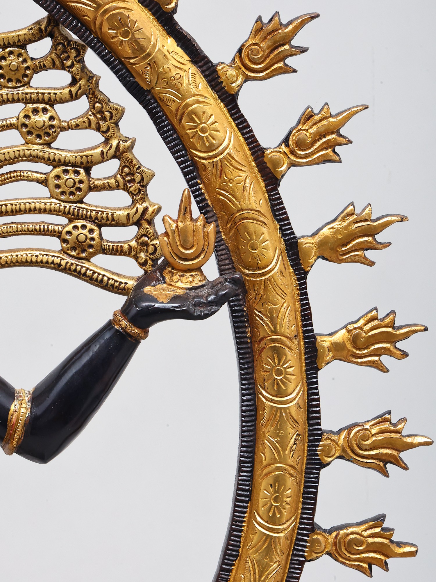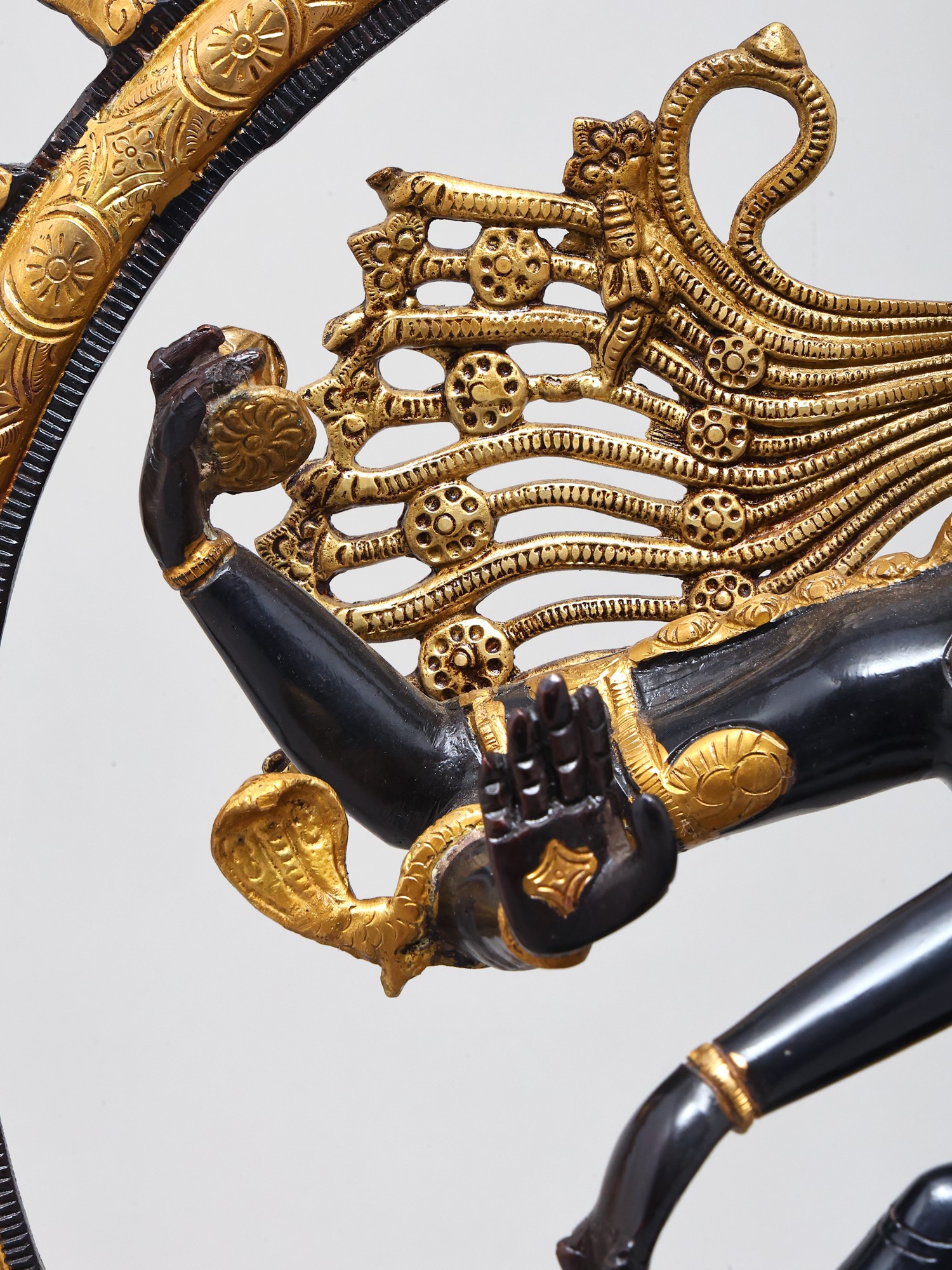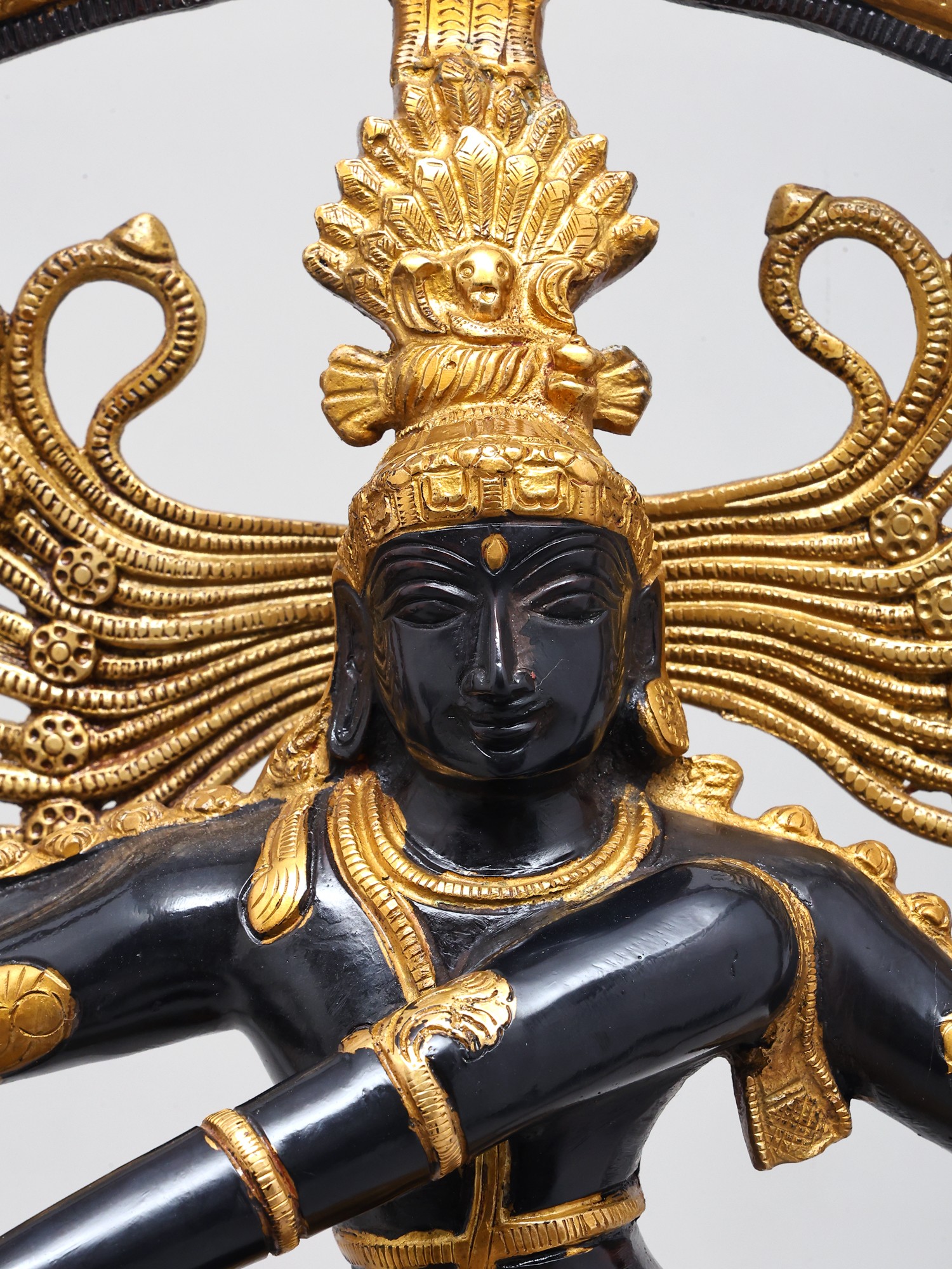 The long, lithe dancing physique of the Lord is contained within a life-sized ring of flames. It emerges from the mouths of the twin mythical creatures conjoined to the lotus-shaped plinth. The complexion of the body of Nataraja is in two metallic variations: a deep, glistening black and a textured gold colour. Each of them are strategically superimposed with silver which makes for the bitone.