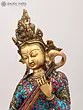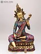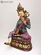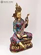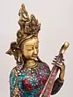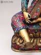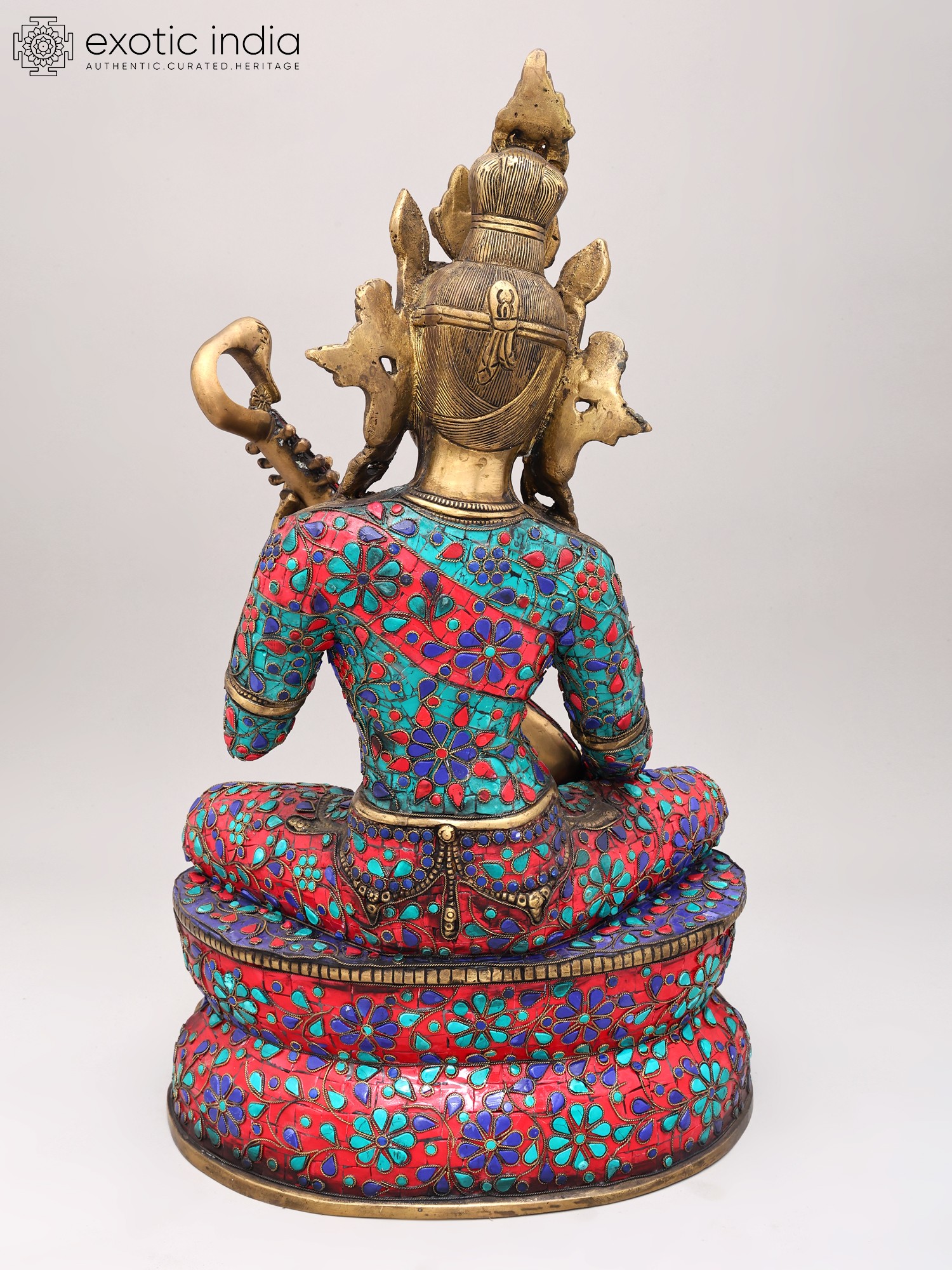 Here you can see an exquisite brass sculpture of the Nepalese form of Saraswati with inlay work. She is represented with two arms, playing the Veena. She is seated in a relaxed position on a lotus plinth in the lalitasana with her left leg tucked up and right leg hanging down. Her figure is slender and is ornate with dazzling jewelry.