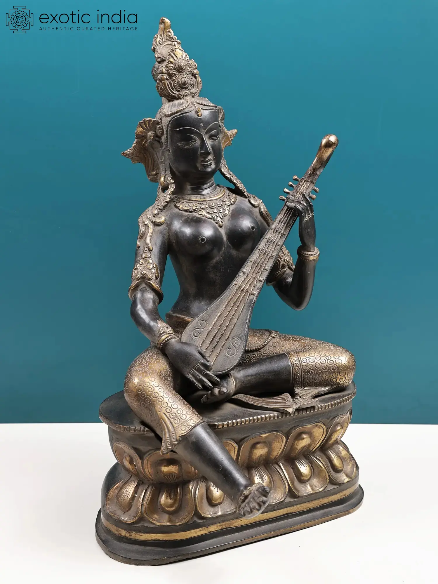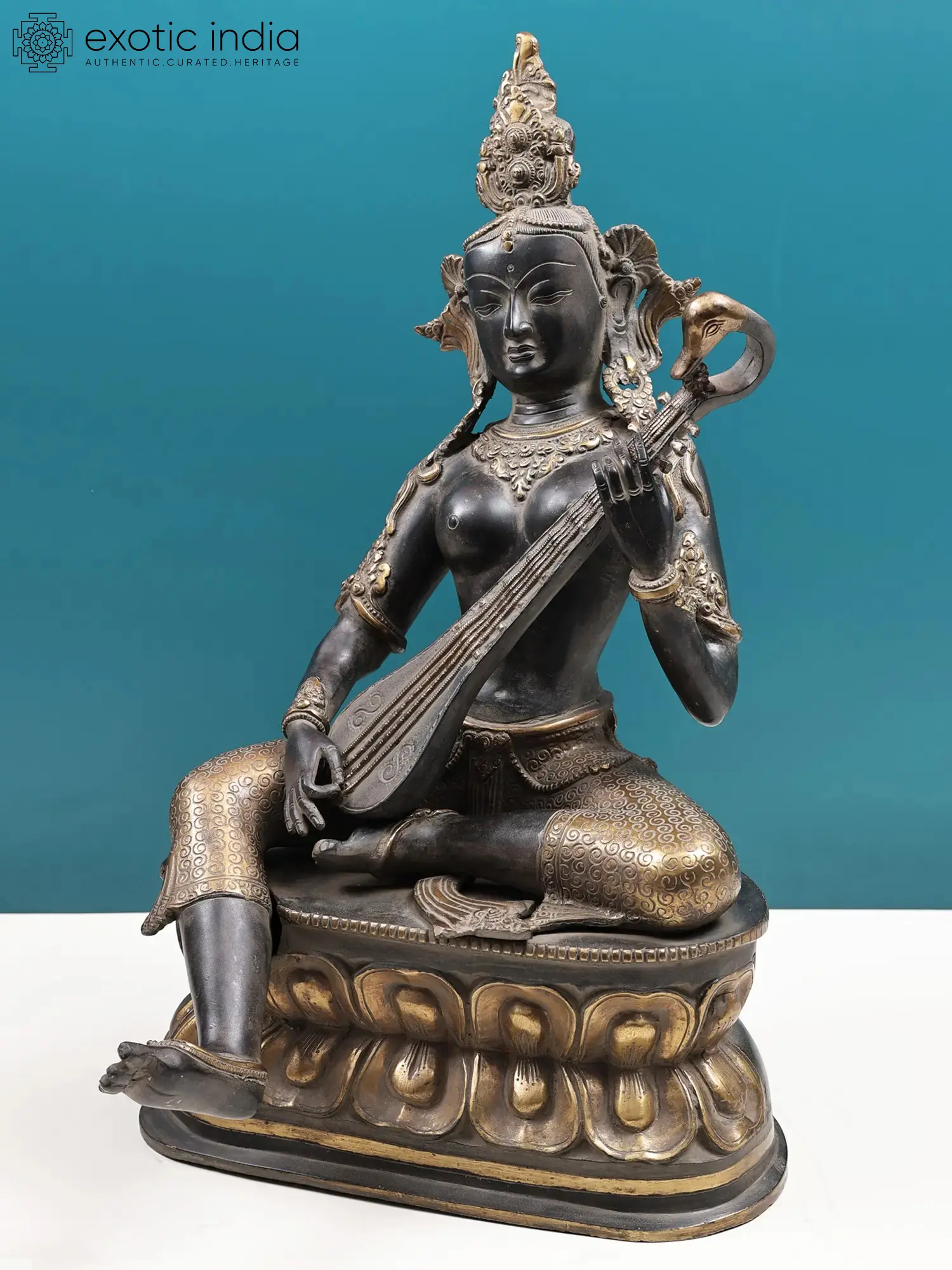 Sculpted from pure brass, this bitone Sarasvati murti is predominated by a textured black colour, the complexion of Her bare body. A flaxen gold colour defines Her embroidered dhoti, the numerous adornments on Her body, and the swan-shaped head of Her veena (swan is the vahana or divine mount of Devi Sarasvati).