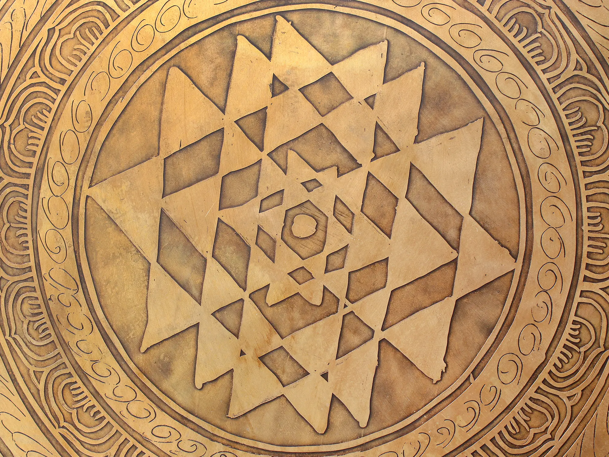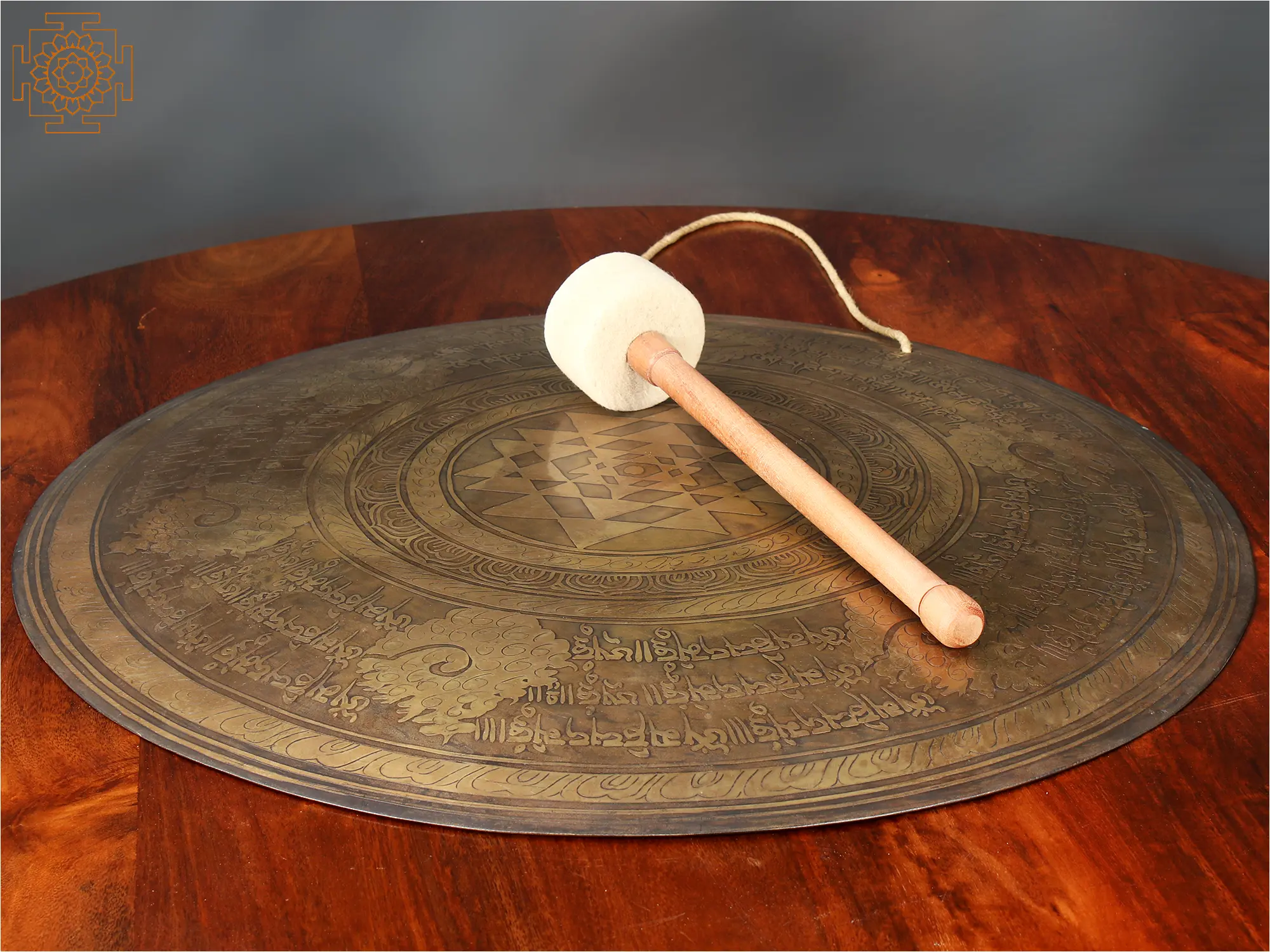 Gongs are musical instruments classified as planetary, therapeutic, and musical gongs. They are used in contemplative sessions and festivals to promote mind-body healing. This bronze Gong is adorned with a Shri Yantra symbol, a geometrical pattern revered in Hindu and Tantric traditions. This sign represents the divinity of the feminine, namely the goddess Tripura Sundari, also known as Lalita, and is said to be one of the most influential and auspicious yantras. A circle of lotus petals surrounds the Shri Yantra. The ring is further sanctified by three lines of the Om Mani Padme Hum Mantra going clockwise around it. A cloud followed each line of the Mantra. This Gong is a spiritual object and a fusion of Shri and vibration that delivers good luck and audacity with each striking and sound.
