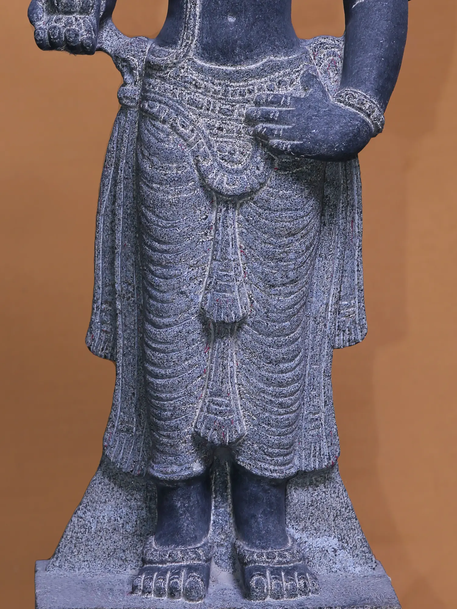 Dressed in a dhoti whose folds are finely sculpted in beautiful symmetry, Brihaspati wears a Vaishnava elongated crown and ornaments similar to Sri Vishnu, while also standing in the upright pose, with one hand on waist- a classic posture of Vishnu in his sculptures- a similarity due to their shared sphere of power, where they preserver Dharma in the cosmos.