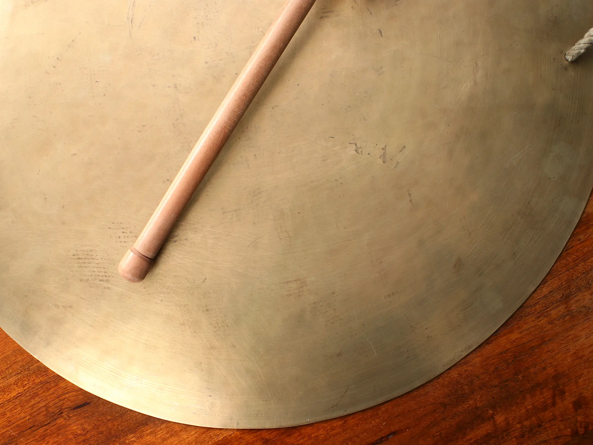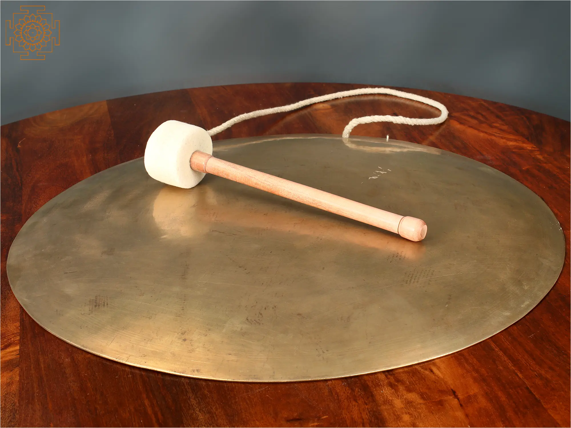 Gongs are musical instruments that are classified as planetary, therapeutic, and musical gongs. They are used in contemplative sessions and festivals to promote mind-body healing. It boasts a round tone with a powerful and resonant sound. They are accompanied by a wooden stick for striking the surface, producing various sound sensations. This plain-surfaced bronze gong is a classic musical instrument used in monasteries and prayer rooms to provide the right sound for meditation and spiritual offerings. A thread is tied to the rear of the gong to allow for easy manipulation of the instrument during ceremonies.