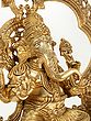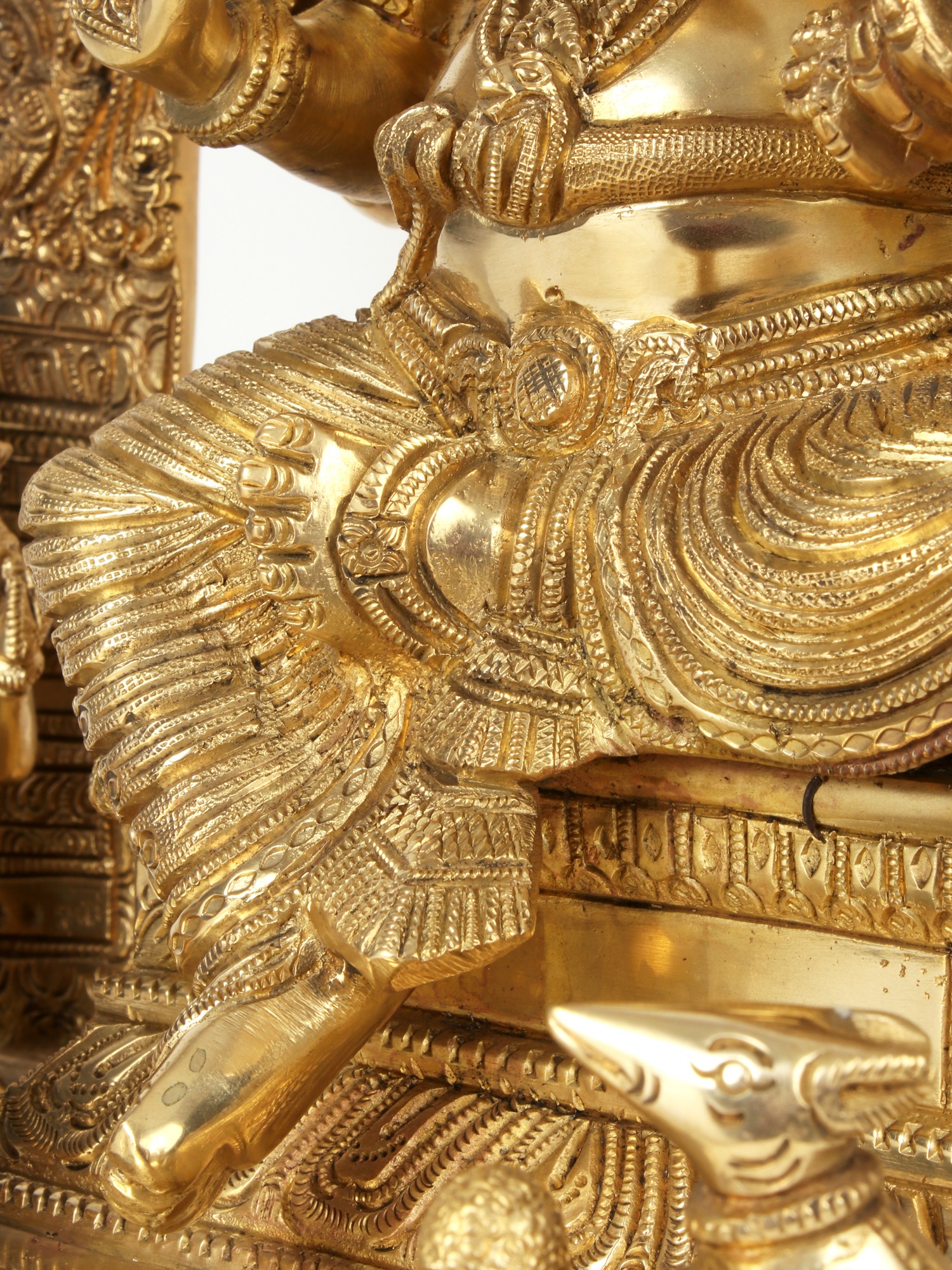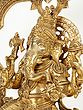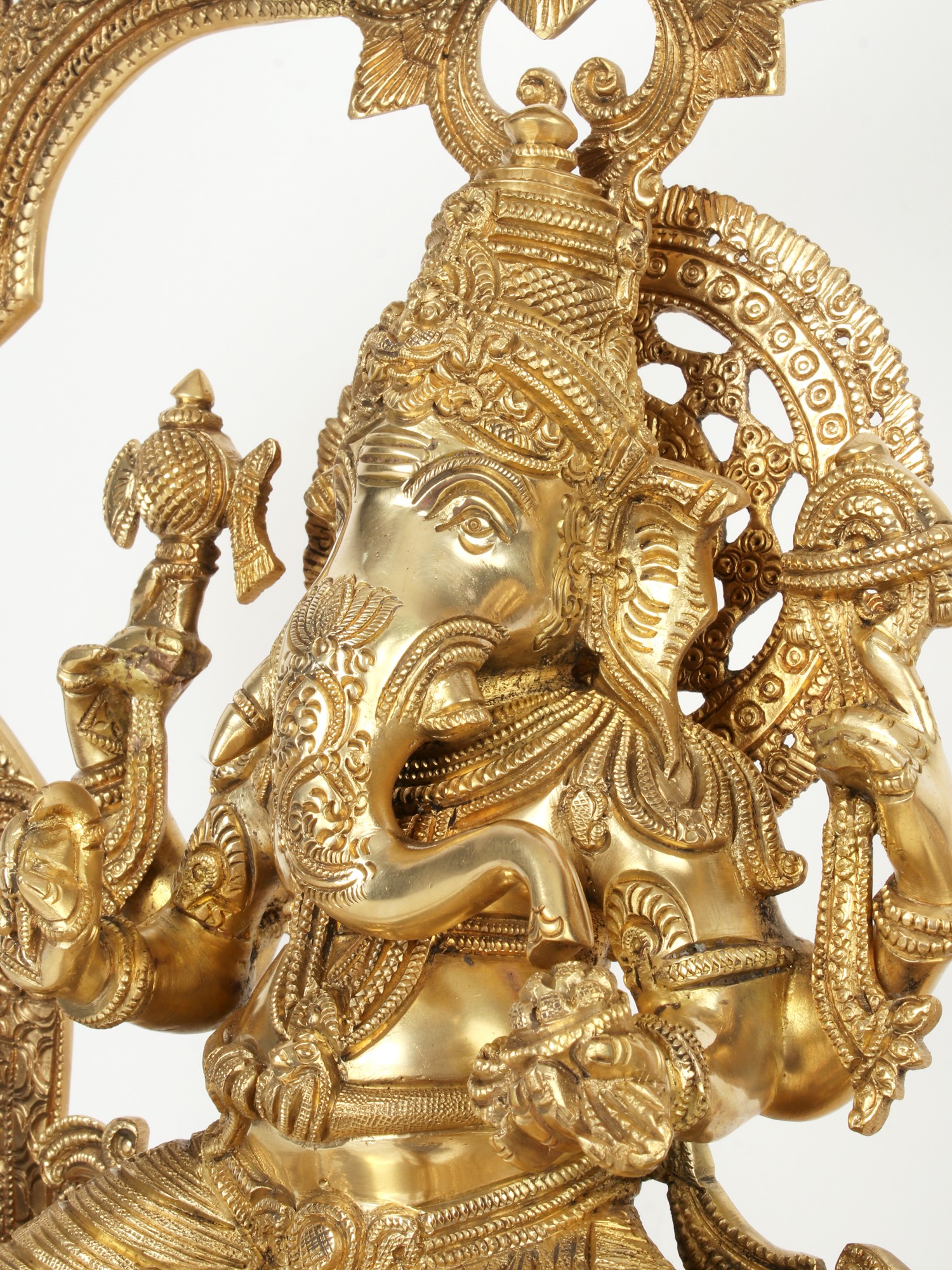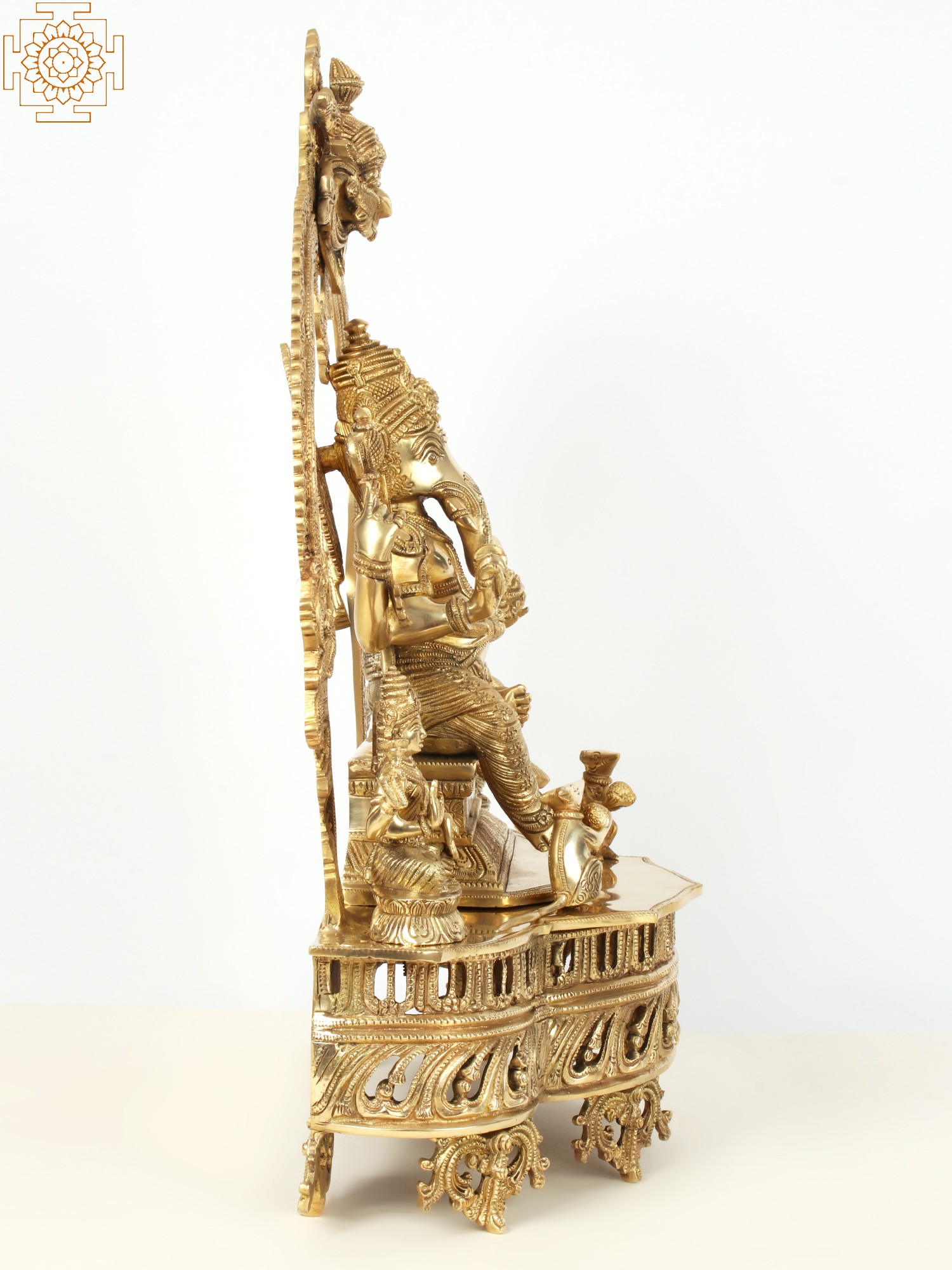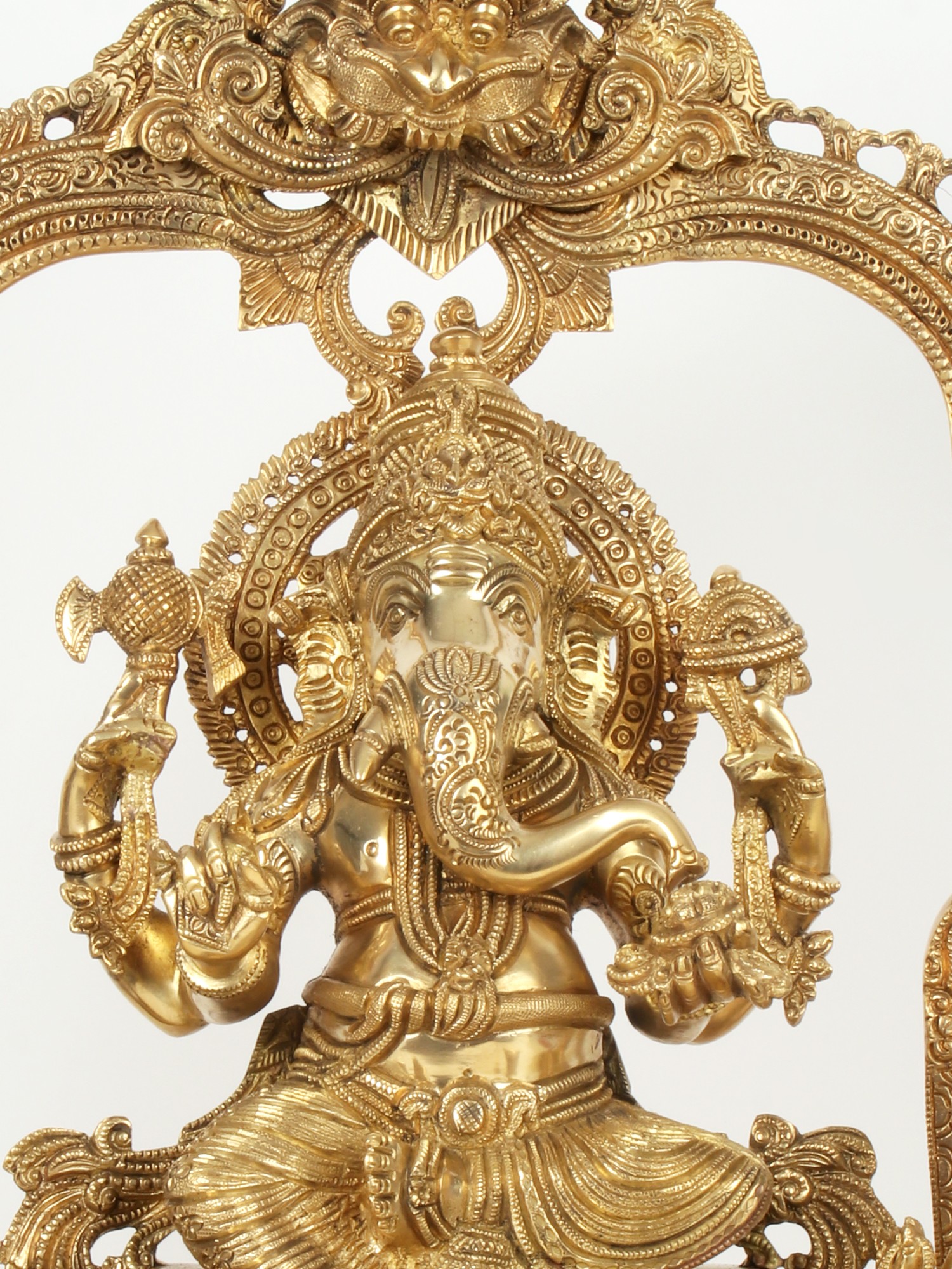 This magnificent 22-inch brass statue showcases Lord Ganesha, the revered remover of obstacles, enthroned in majestic splendor. He is depicted seated on a Kirtimukha throne, a mythical creature symbolizing the triumph of good over evil. The Kirtimukha, with its fearsome yet captivating visage, acts as a powerful guardian, protecting Ganesha and enhancing the statue's symbolic significance. Ganesha, the elephant-headed god, is known for his wisdom, prosperity, and auspicious beginnings, making this statue an ideal centerpiece for homes, temples, or meditation spaces. The intricate details of his attire and posture capture the essence of his benevolent nature.